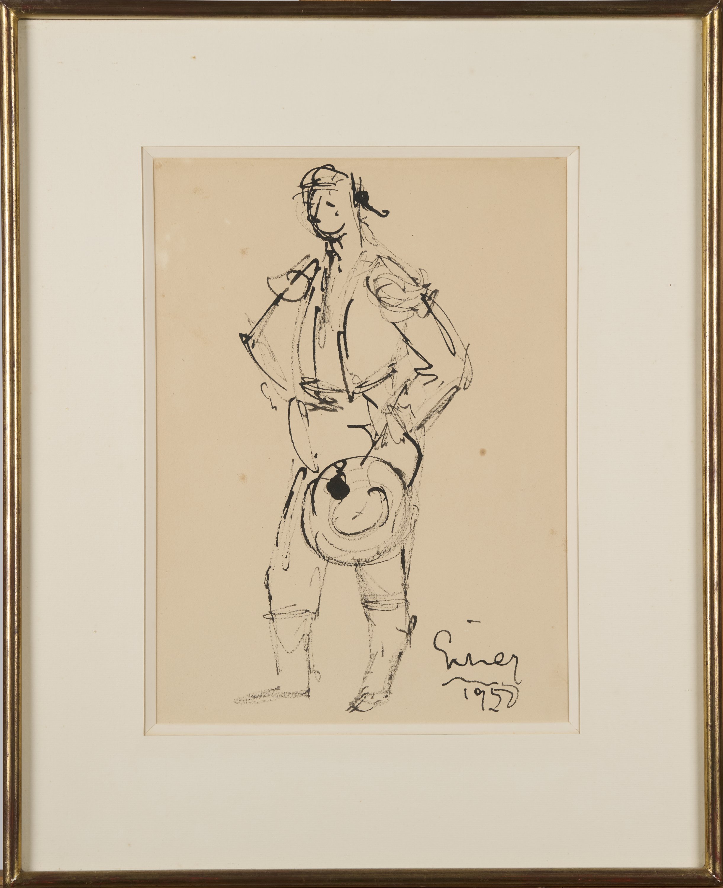 - Balbino Giner Garcia (Espagnol, 1910-1976). Torero, 1950. Encre. Signée et datée. Haut. 31 Larg. 23 cm. Cadre baguette en bois doré.