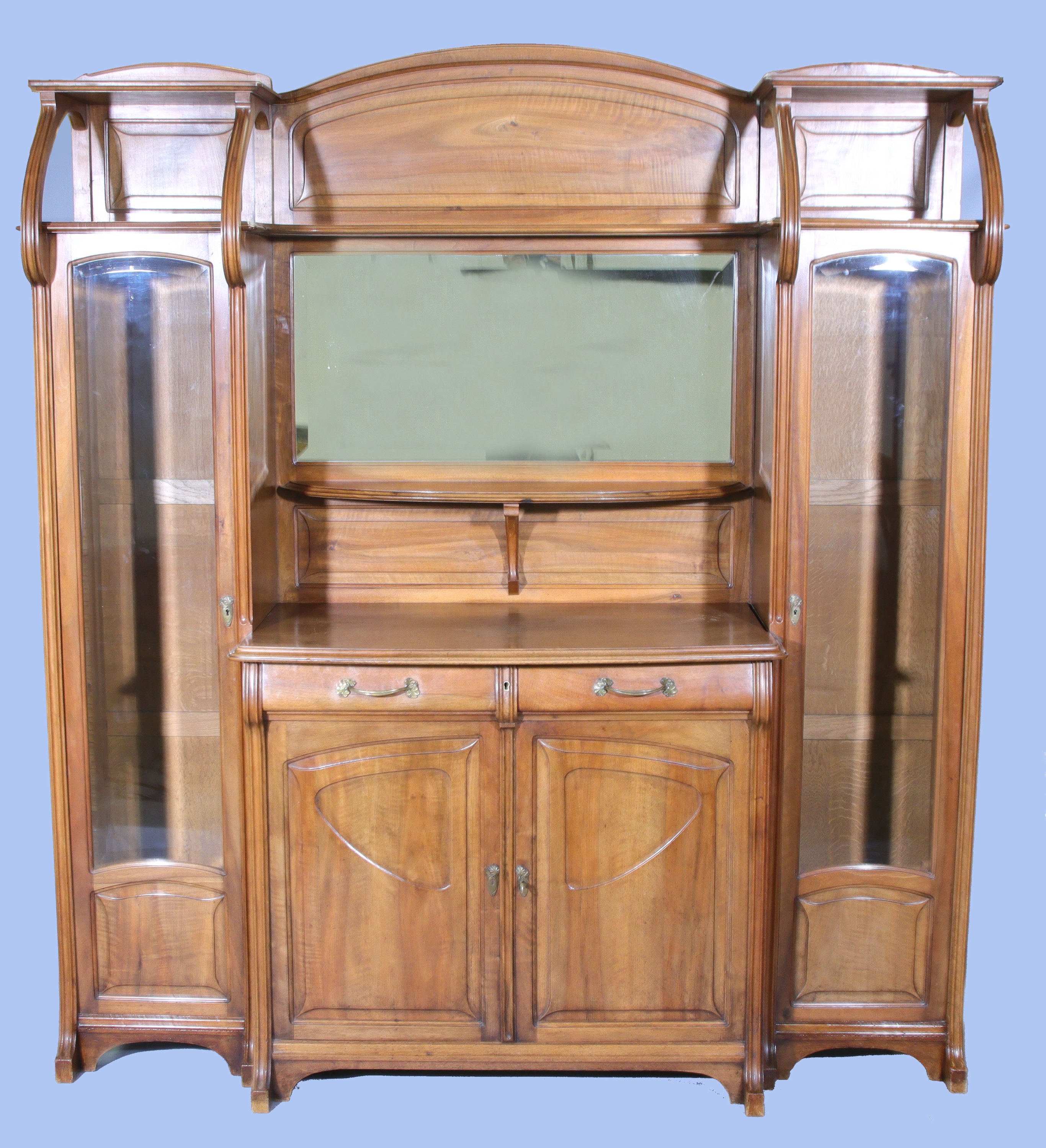 - Buffet-bibliothèque: buffet bas ouvrant à 2 portes et 2 tiroirs, plateau avec étagère à gradins surmonté d'un miroir encadré de 2 vitrines hautes et sommé d'étagères. Haut. 225, Long. 198, Prof. 57 cm.