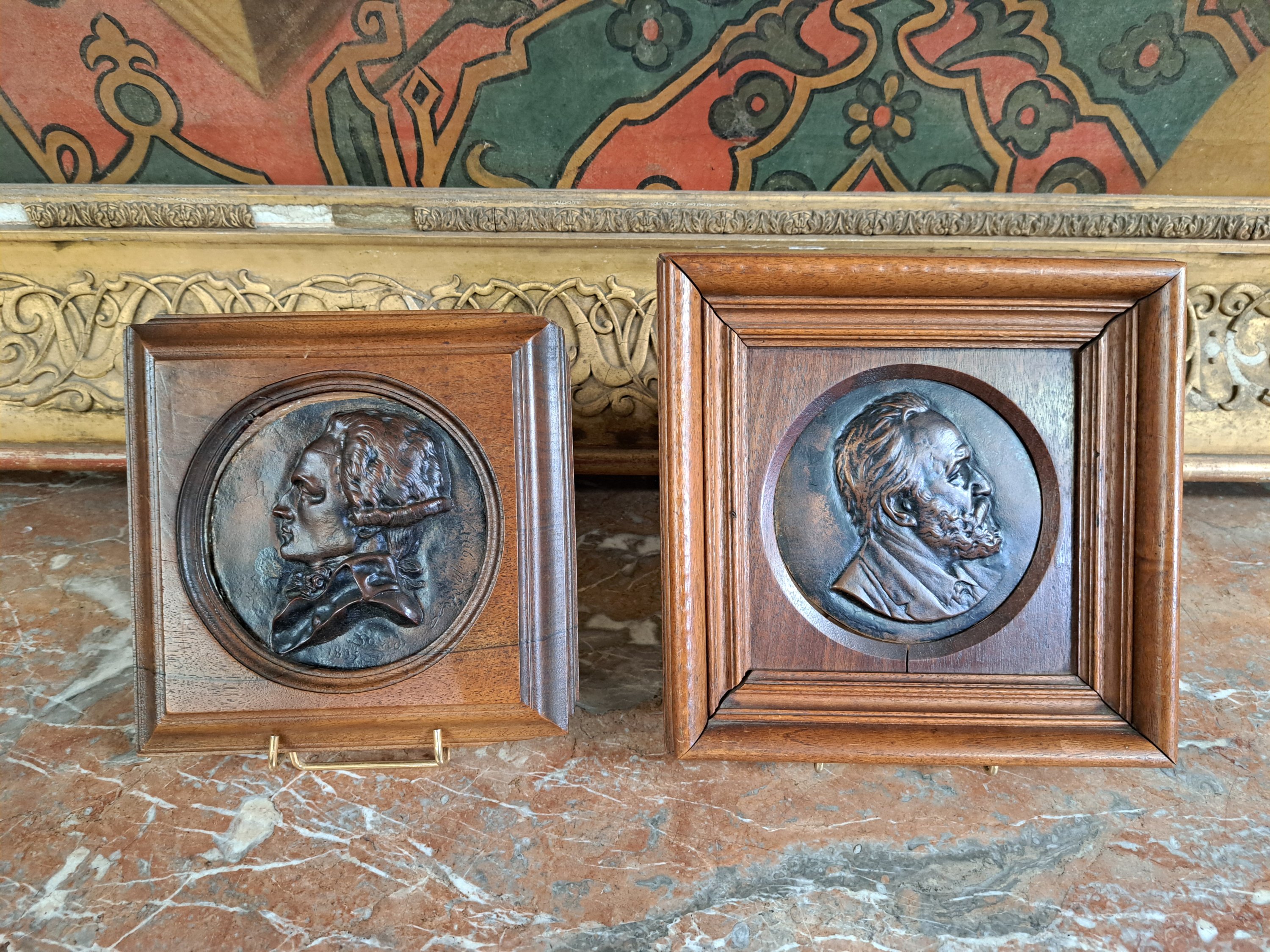 Deux médaillons en bronze pâtiné, dont un d'après David d'Angers, titré et signé.