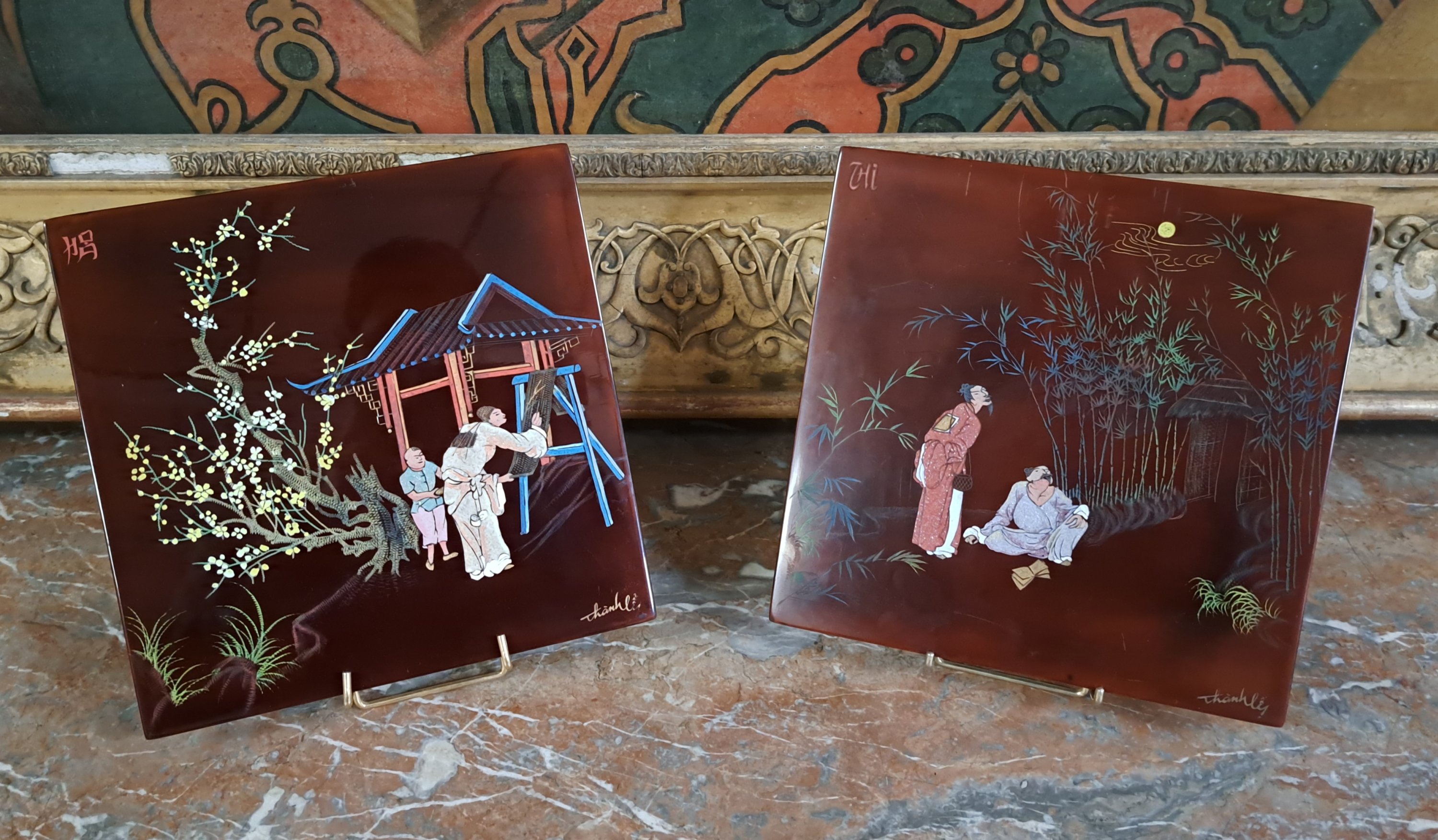 paire de panneaux en laque et incrustation pailletée.