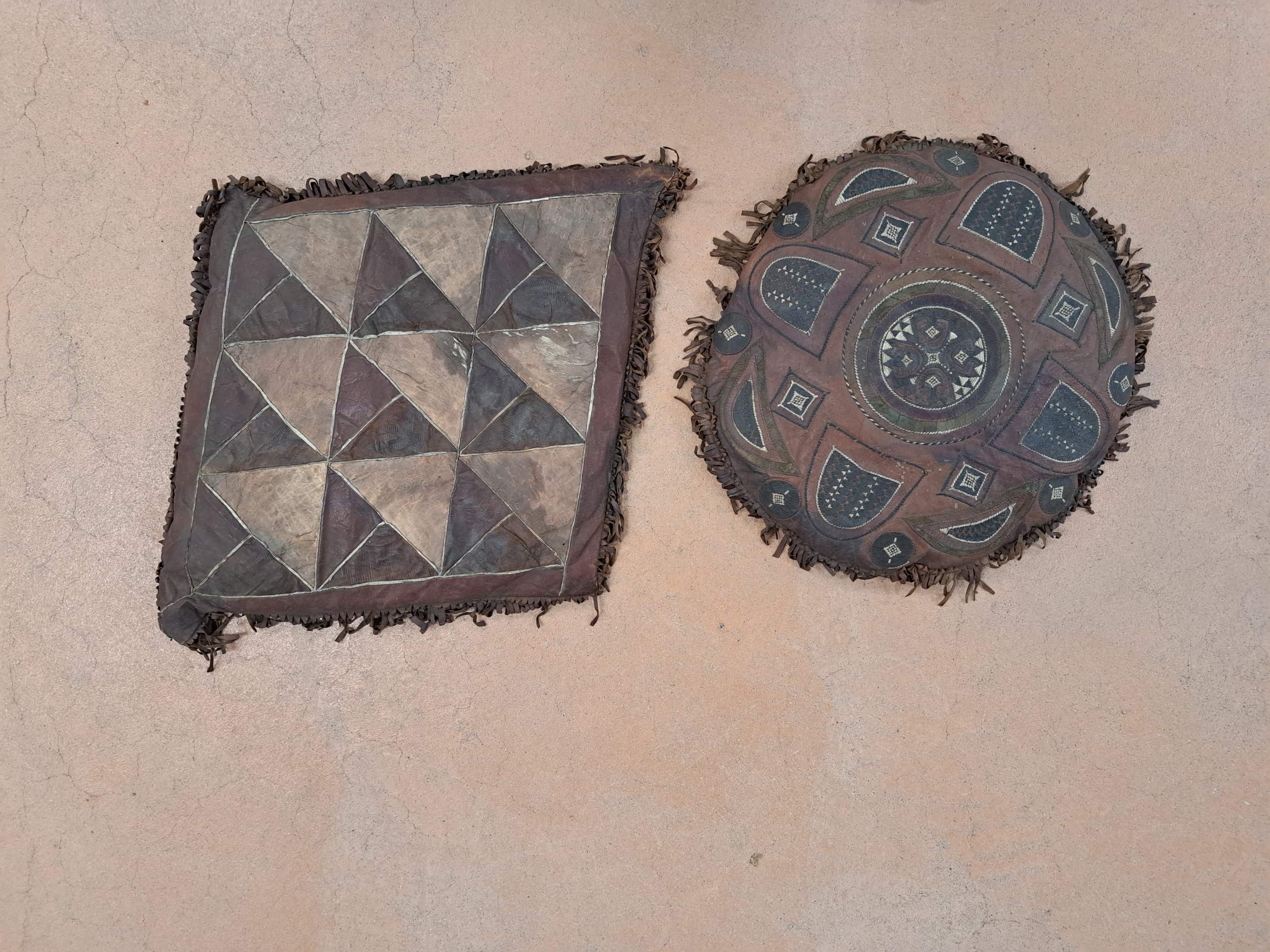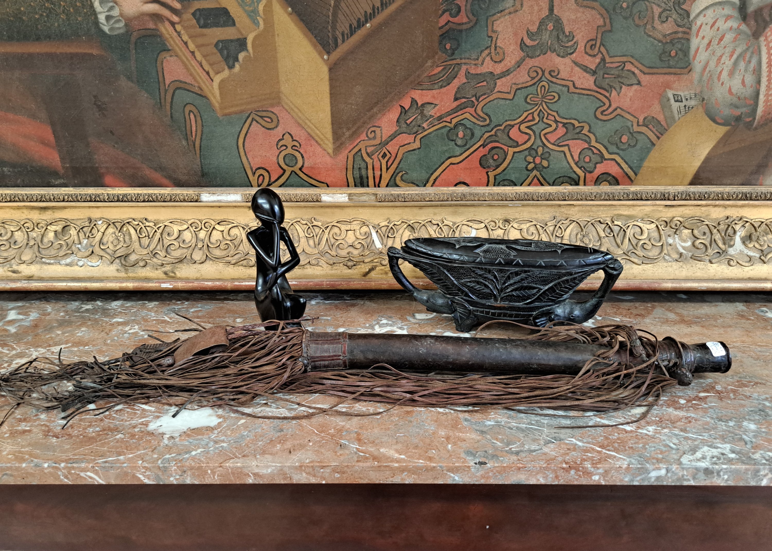 une partie bois comprenant une pirogue, un sage et une boîte anthropomorphe, l'autre en corne figurant des poissons, ainsi que deux en bronze doré.
