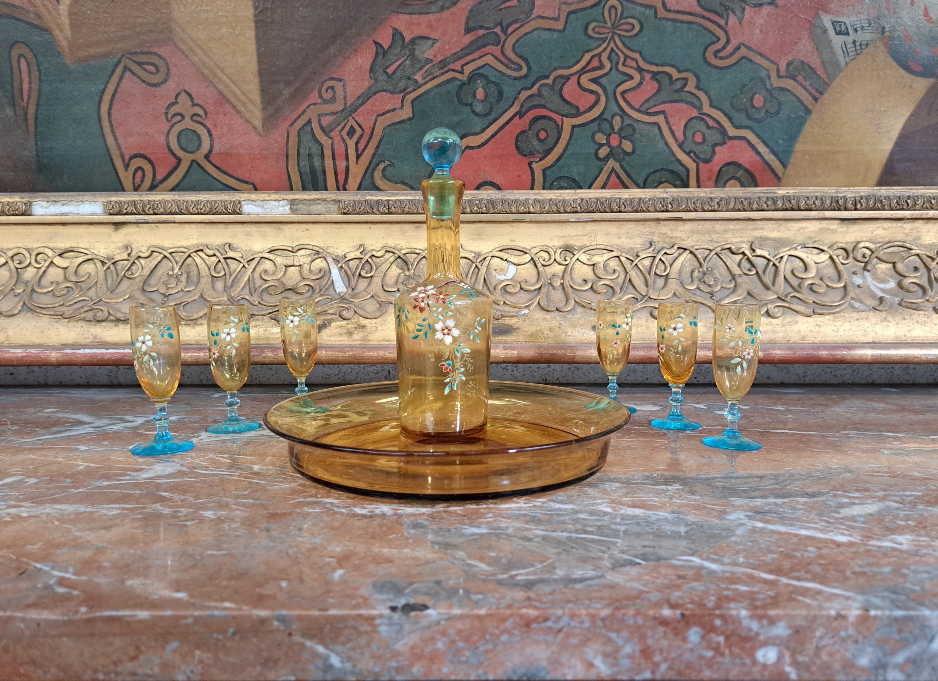 en verre teinté jaune et bleu à décor émaillé et gravé de fleurs, comprenant un plateau, six verres et une carafe. Numéroté "39" sous la carafe.
