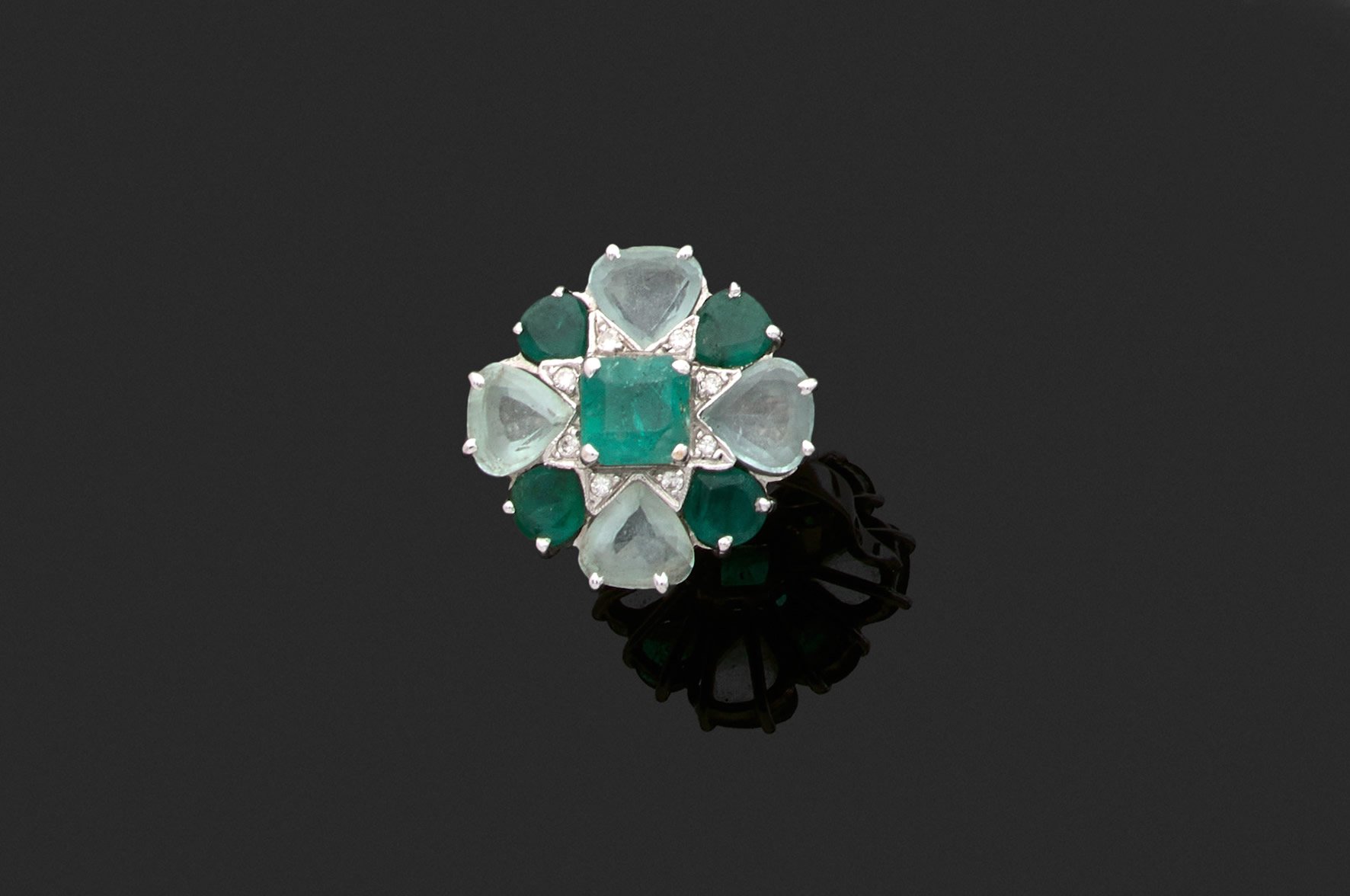 en or gris 750 millièmes, le centre à décor de fleur ornée d'émeraudes, pierres fines bleues et diamants ronds de taille brillant.
