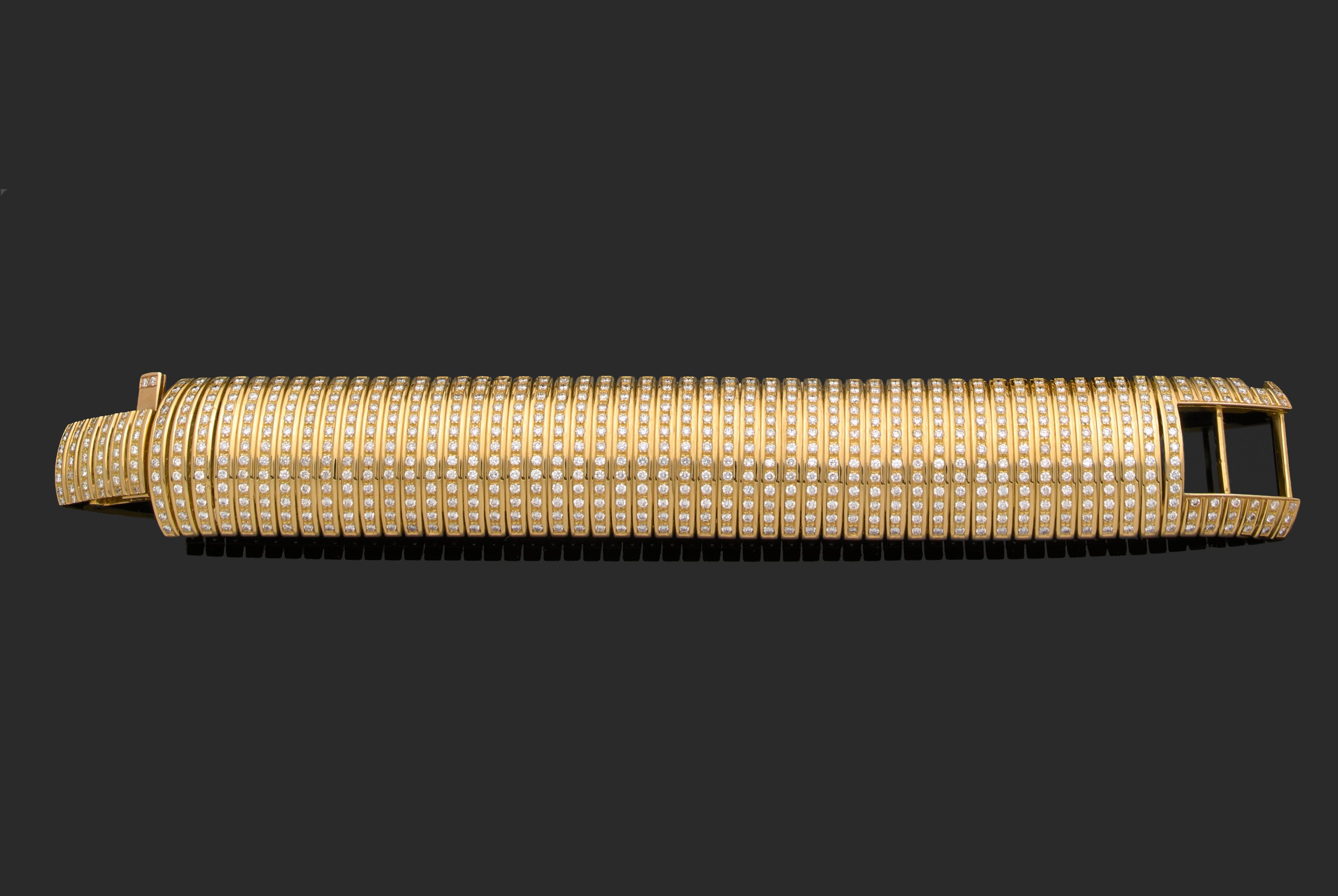 en or jaune 750 millièmes, les maillons de forme bombée entièrement sertis de diamants ronds de taille brillant.
