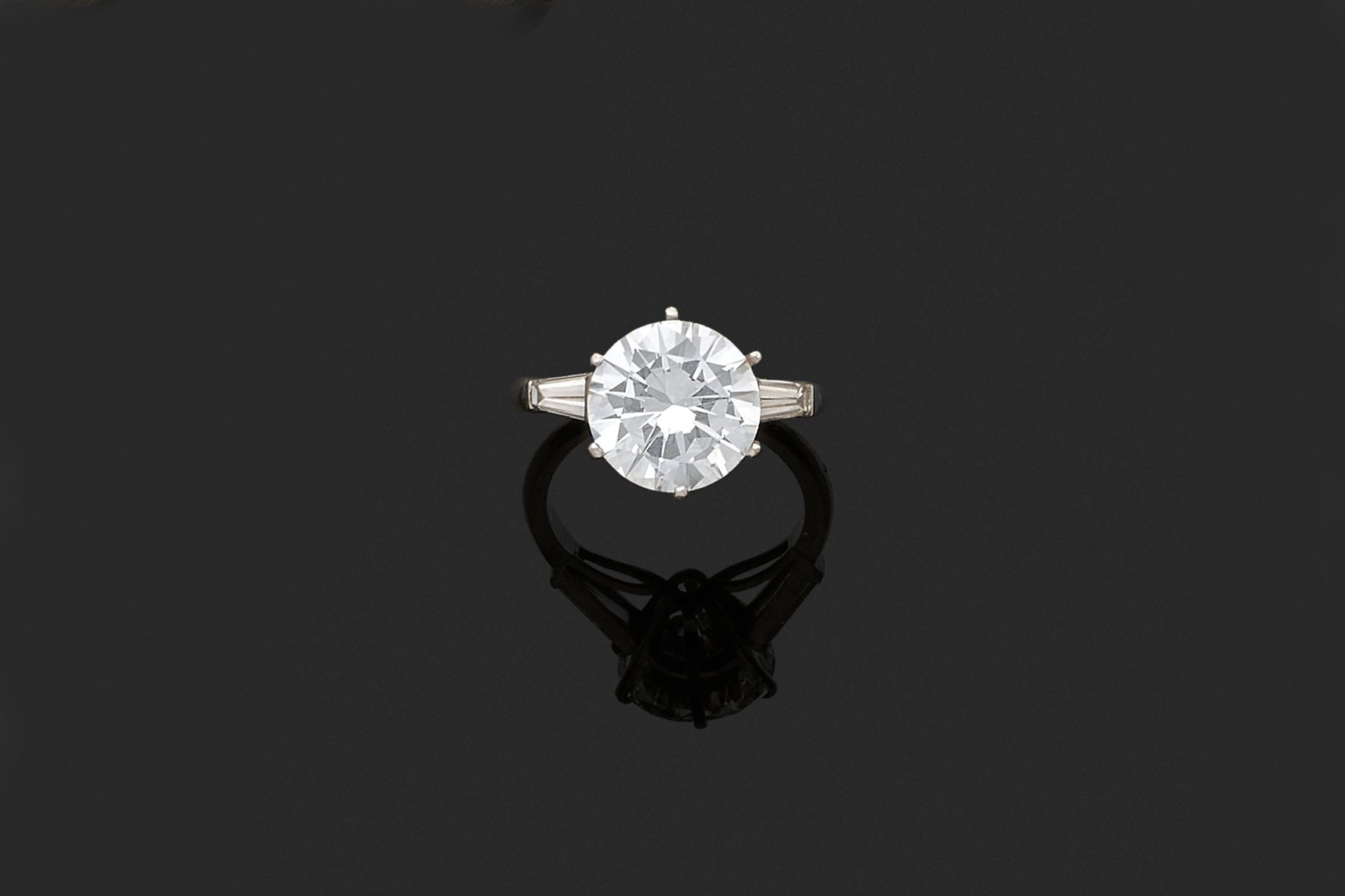 en or gris 750 millièmes et platine 850 millièmes, ornée au centre d'un diamant rond de taille brillant entre deux diamants de forme trapèze.