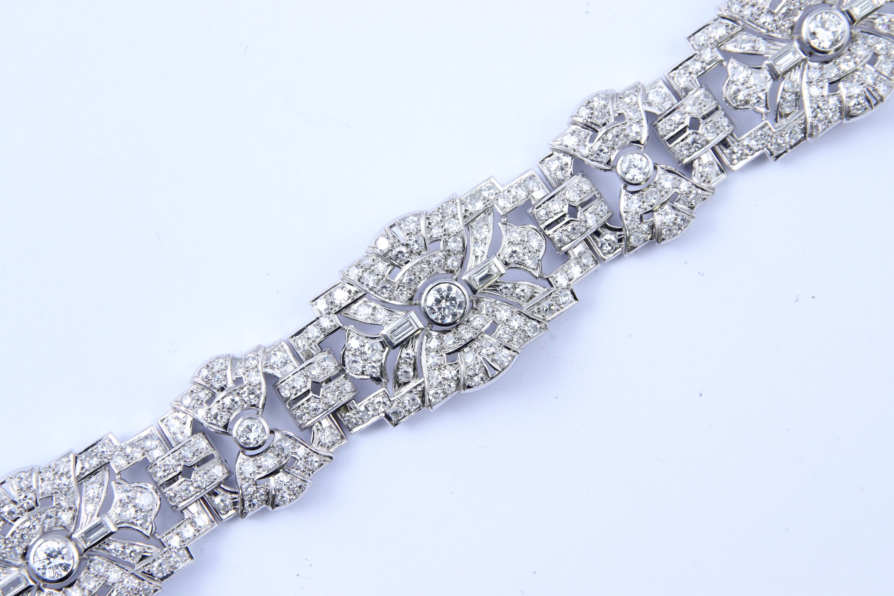 en or gris 750 millièmes et platine 850 millièmes, les maillons ajourés à décor de motifs géométriques entièrement sertis de diamants rectangulaires et ronds taillés en huit-huit, de taille ancienne ou de taille brillant, les trois du centre plus importants, environ 0,35 à 0,40 ct chacun.