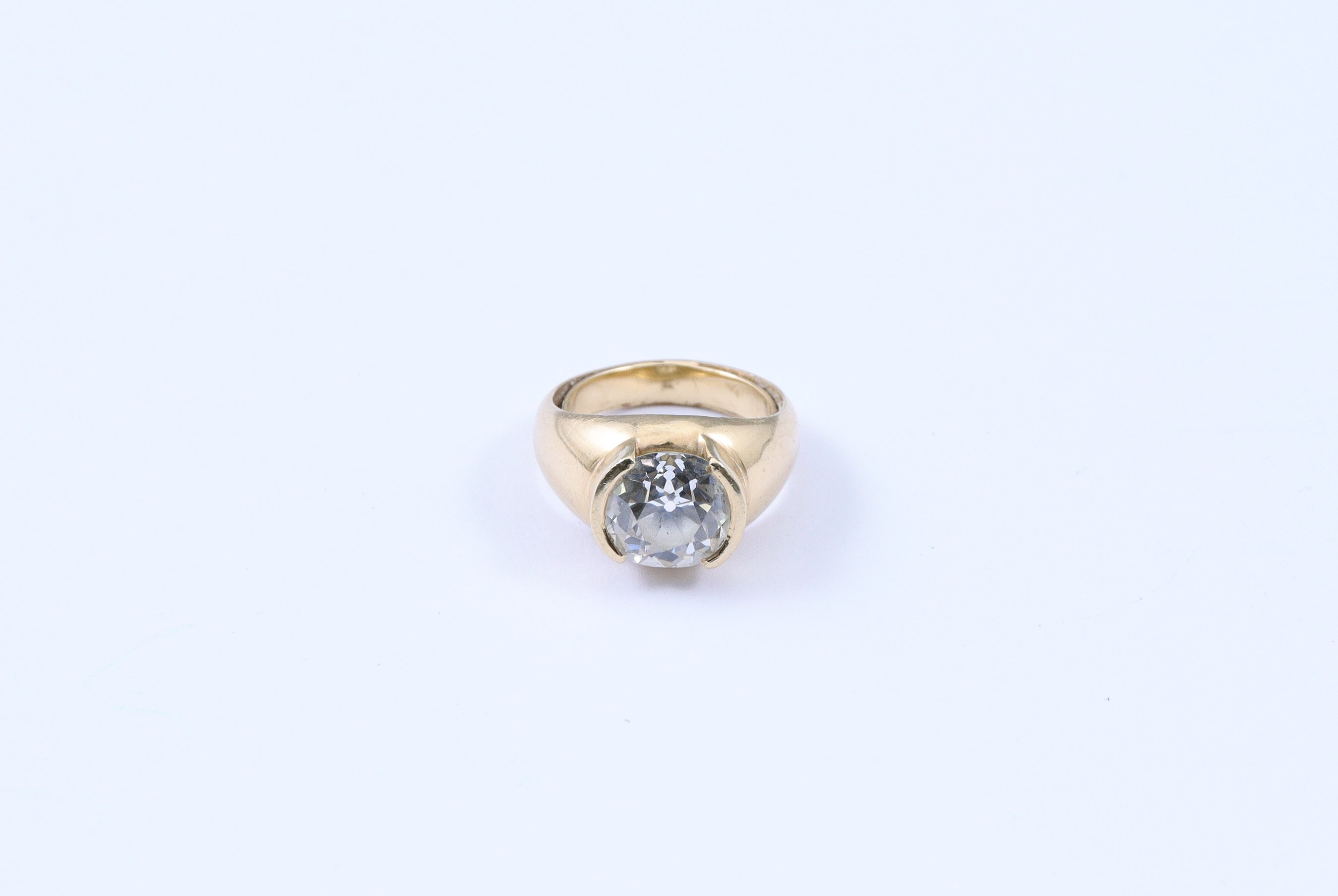 en or jaune 750 millièmes ornée au centre d'un diamant rond de taille ancienne demi serti-clos, d'environ 3,00/3.30 ct.