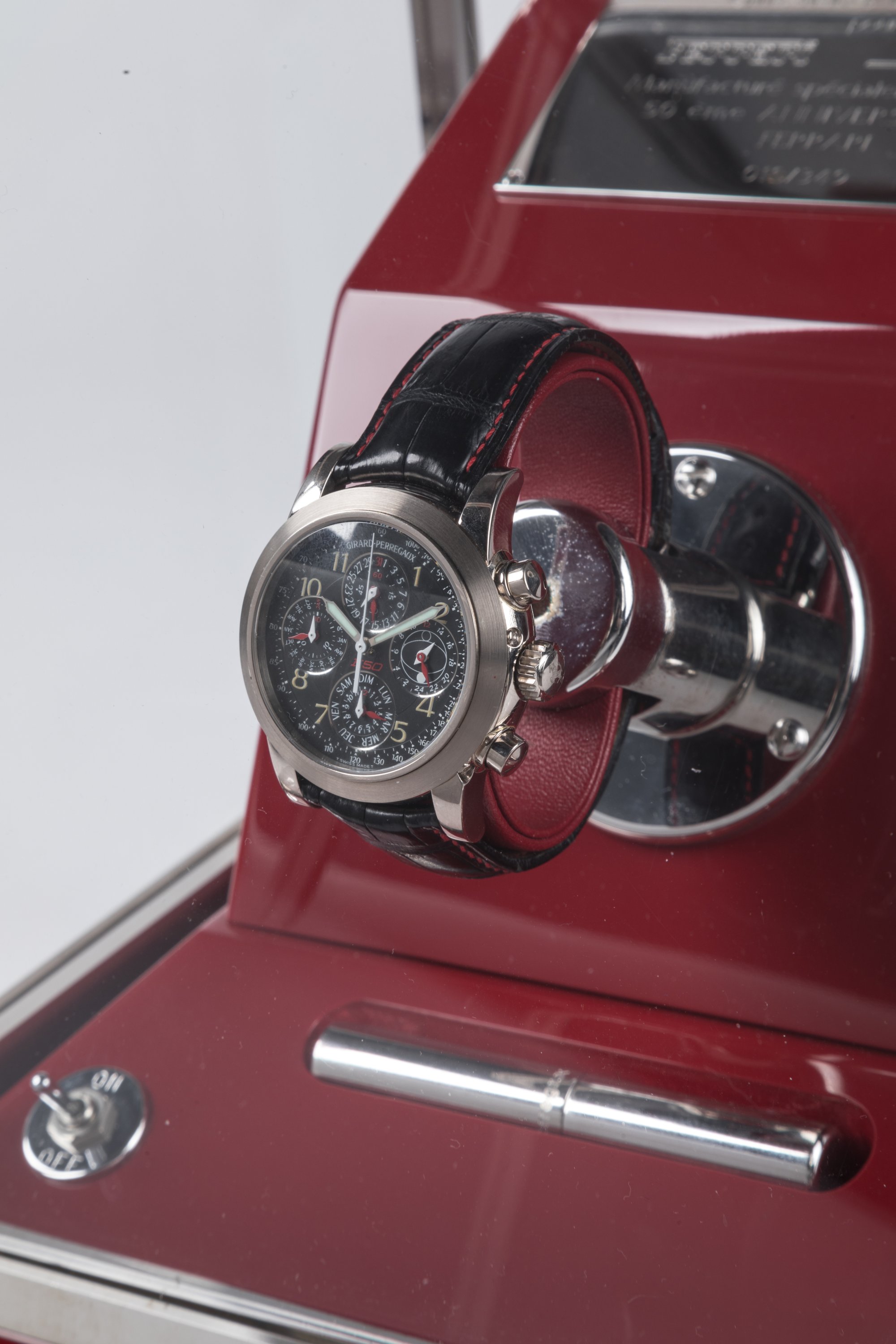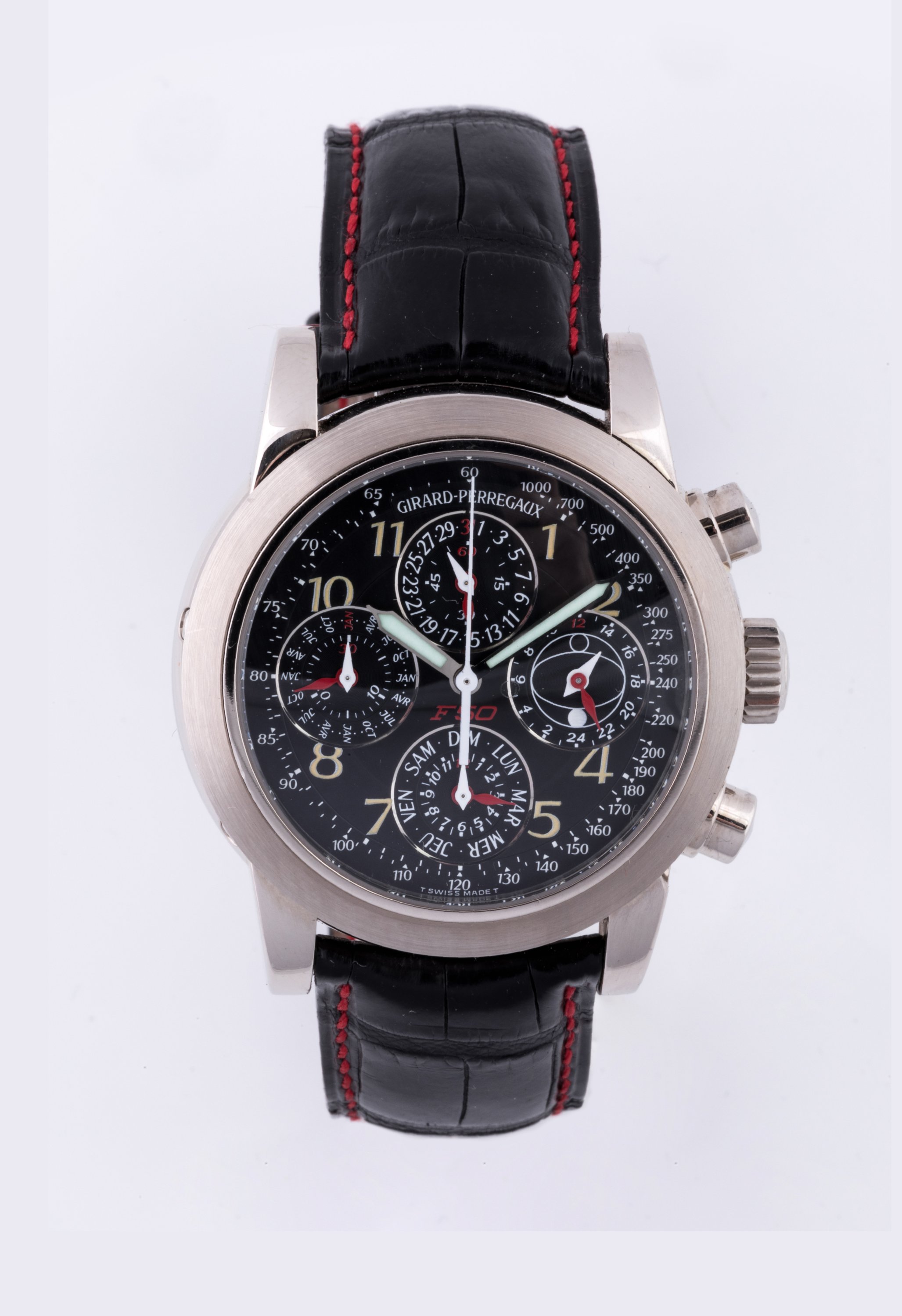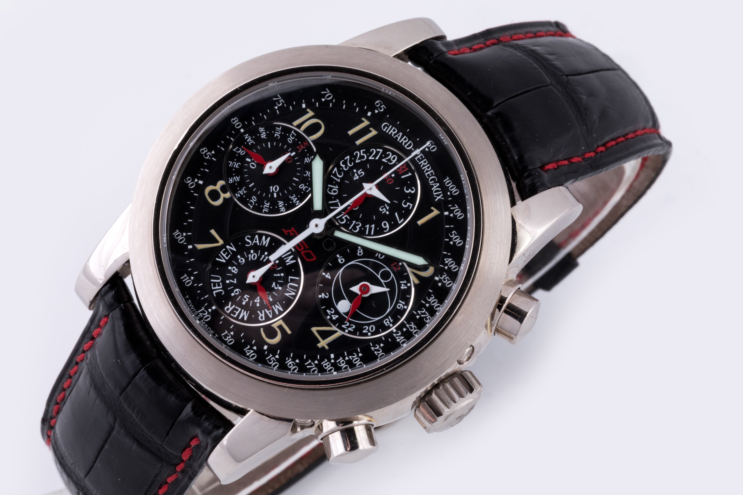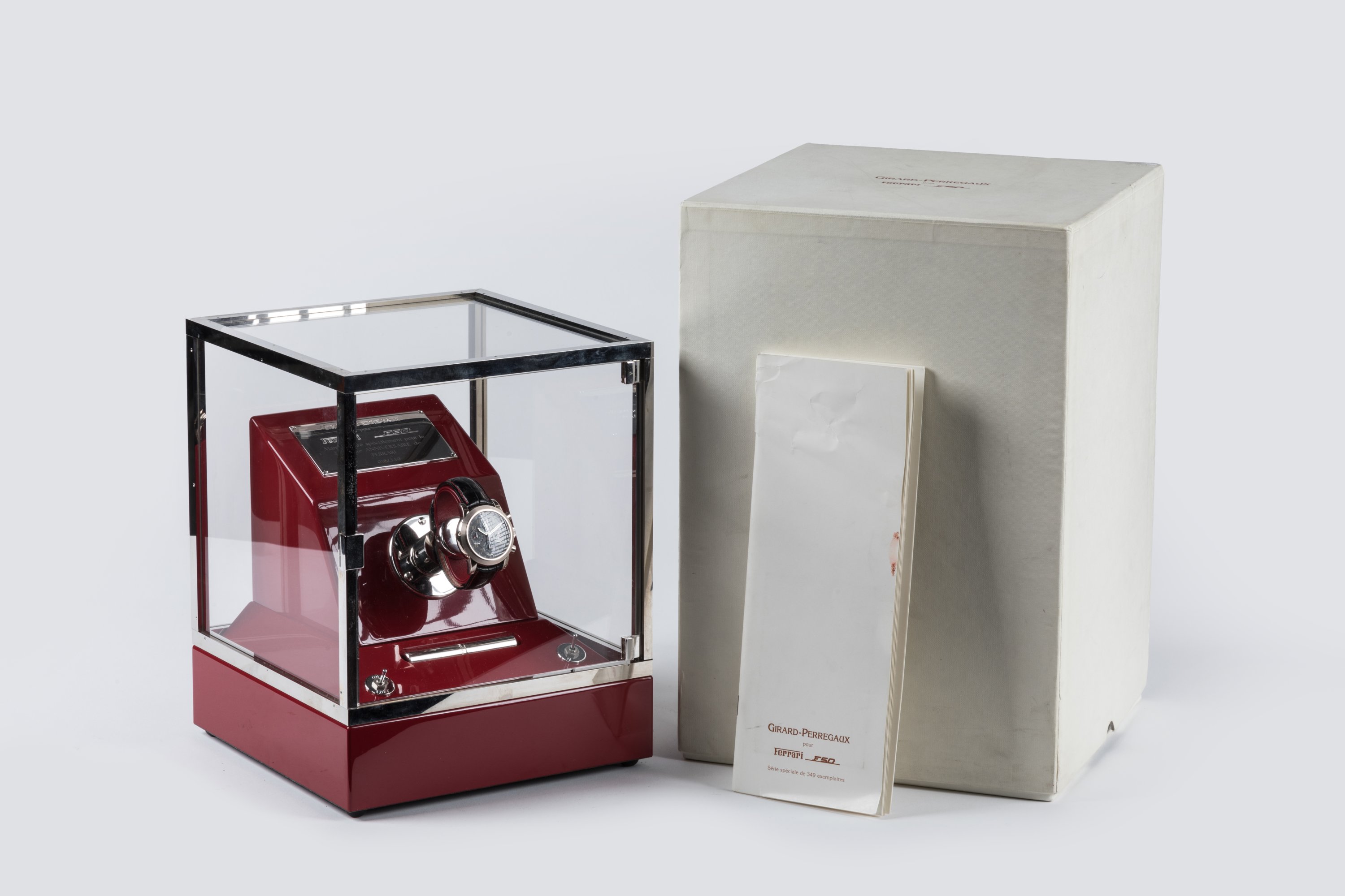 Cette montre a été réalisée pour le 50e anniversaire de Ferrari, fêté en 1997. Fondée en 1947 par Enzo Ferrari, l'écurie est riche de succès en course automobile. Outre la 25 GTO qui reste l'un des fleurons de Maranello, l'entreprise au cheval cabré, commercialise en 1995, la F50 à 349 exemplaires. En hommage à ce modèle en particulier et à Ferrari en général, Girard Perregaux crée le modèle F50. Comme le précise sa notice, "on peut aisément dire que cette montre exceptionnelle est conçue pour aller vers l'ère de la future F100, puisque son micro-mécanisme a été conçu pour donner la date exacte jusqu'en 2099! Au-delà de cette date, un petit réglage du mécanisme garantira à la montre une nouvelle part d'éternité".