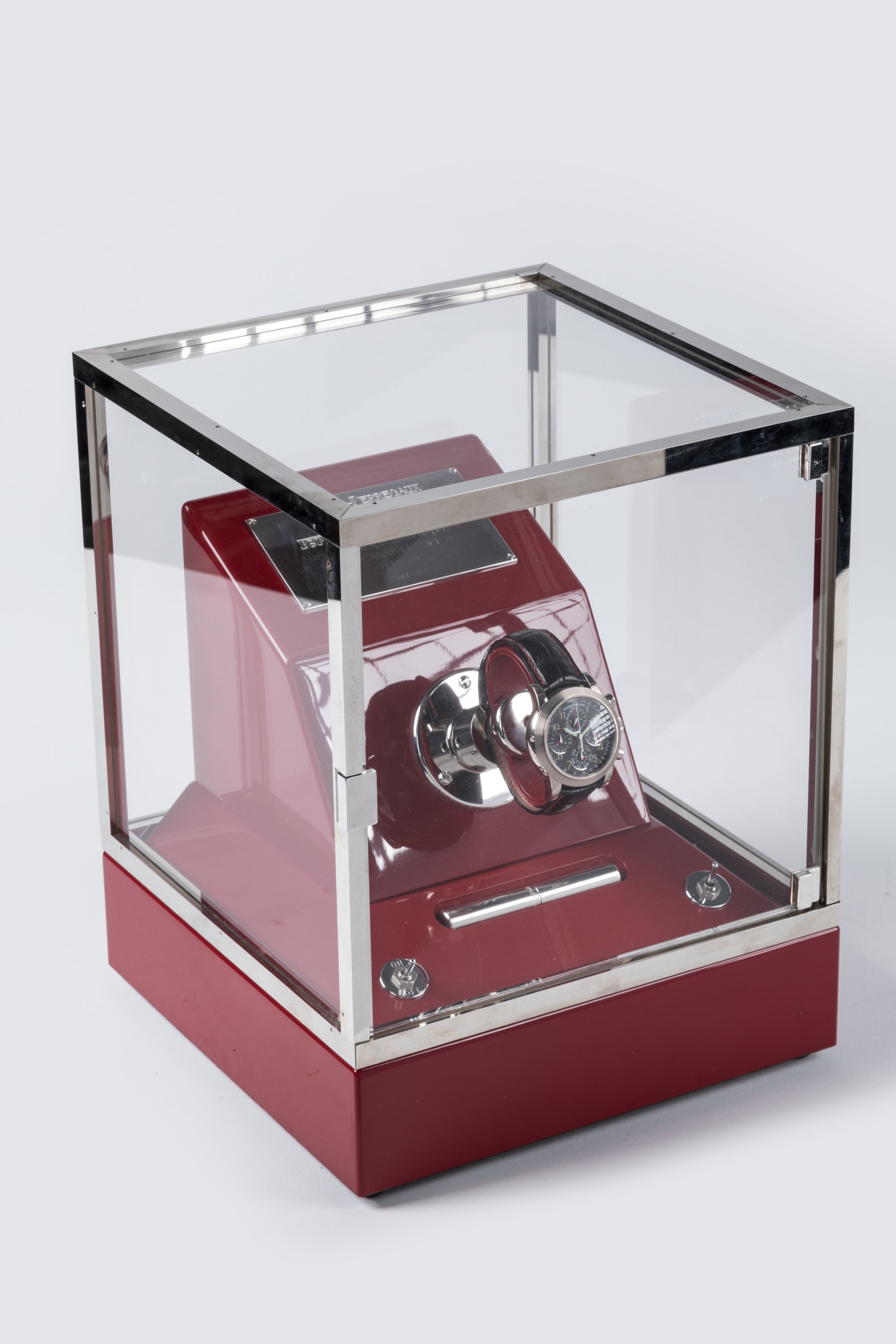 Coffret d'exposition en bois décoré de laque et équipé d'un moteur animant une broche rotative assurant le nombre de tours nécessaires au remontage du mécanisme. Avec ses papiers.