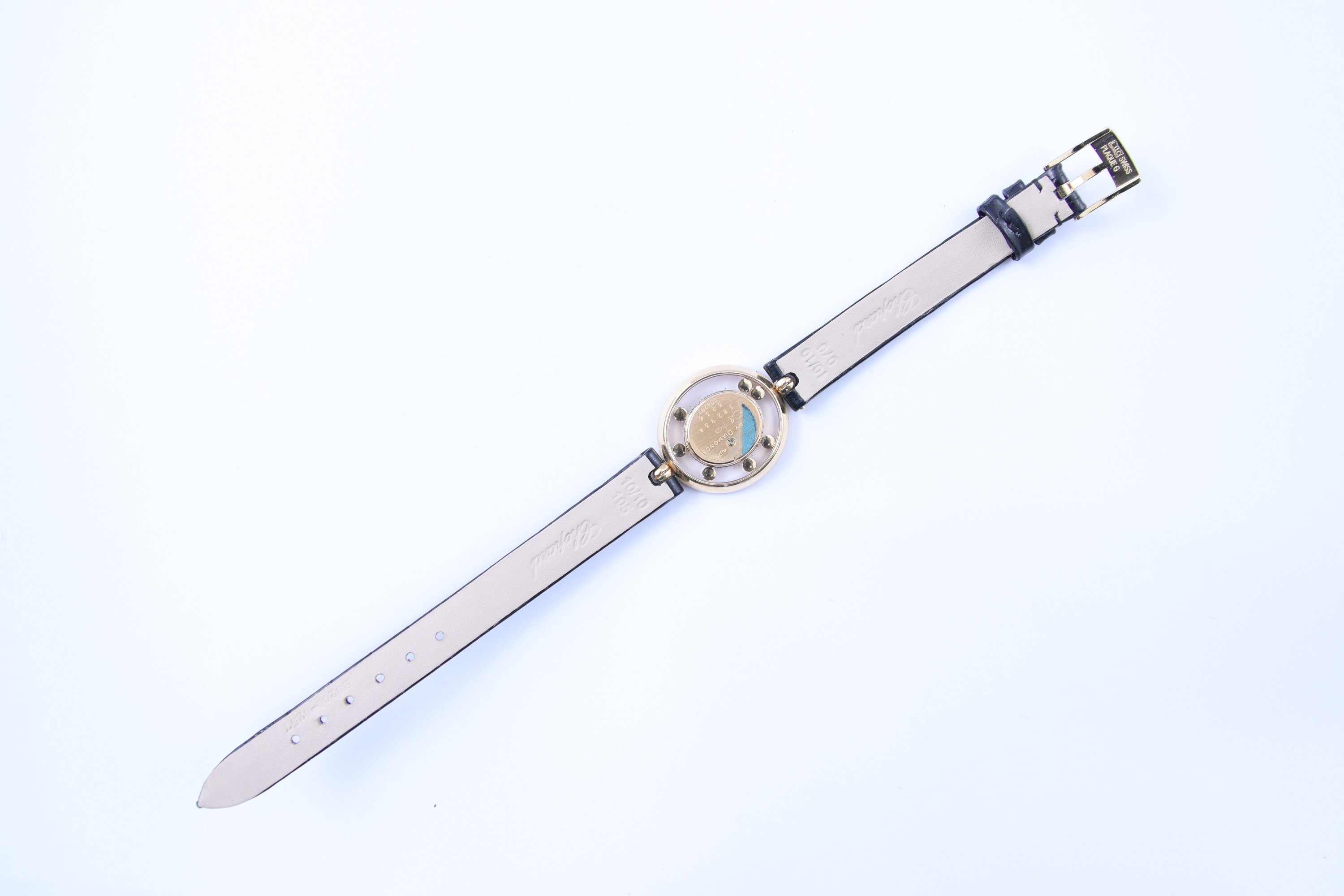 Bracelet en cuir noir et boucle ardillon en métal plaqué doré de la marque.