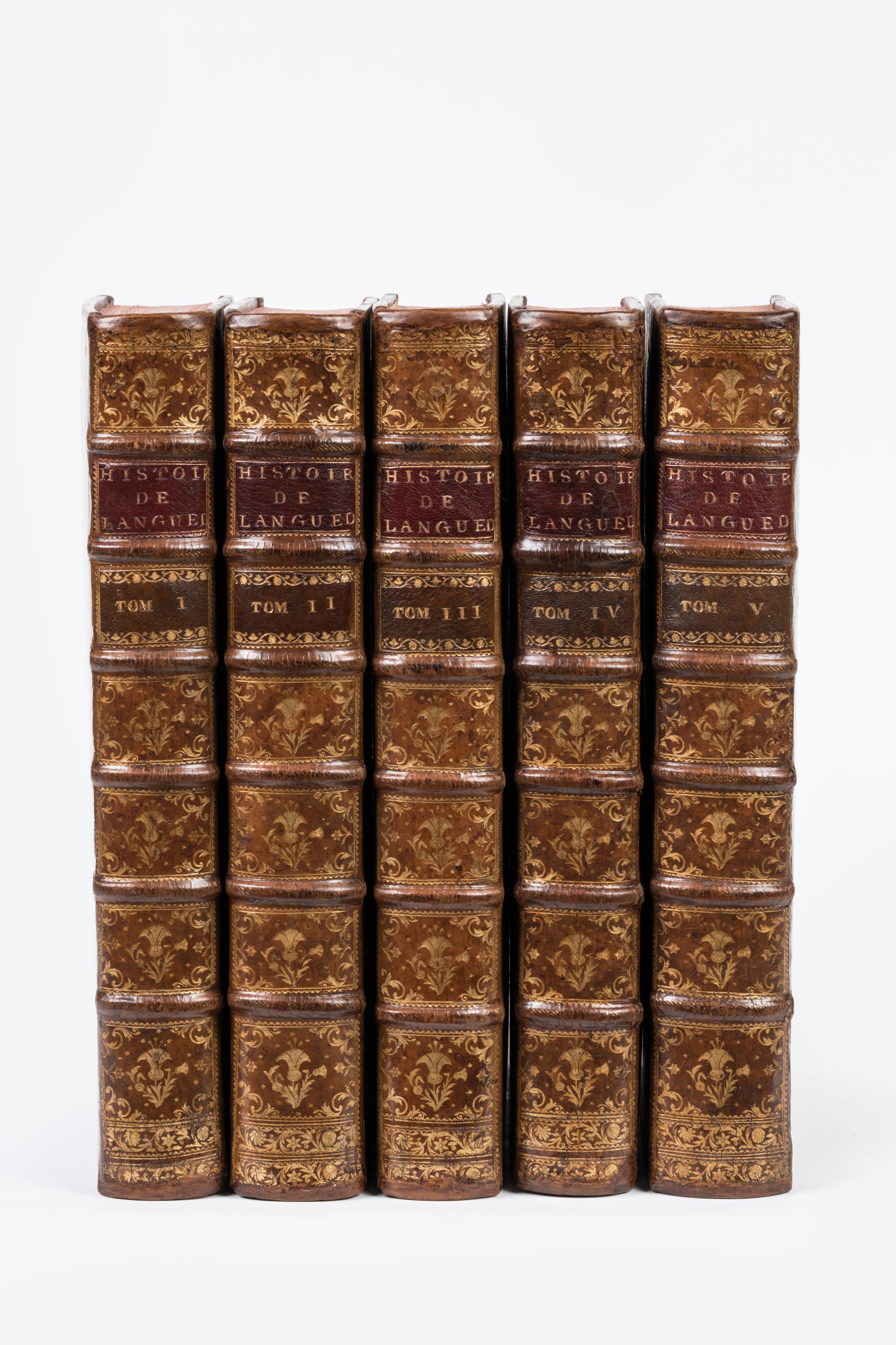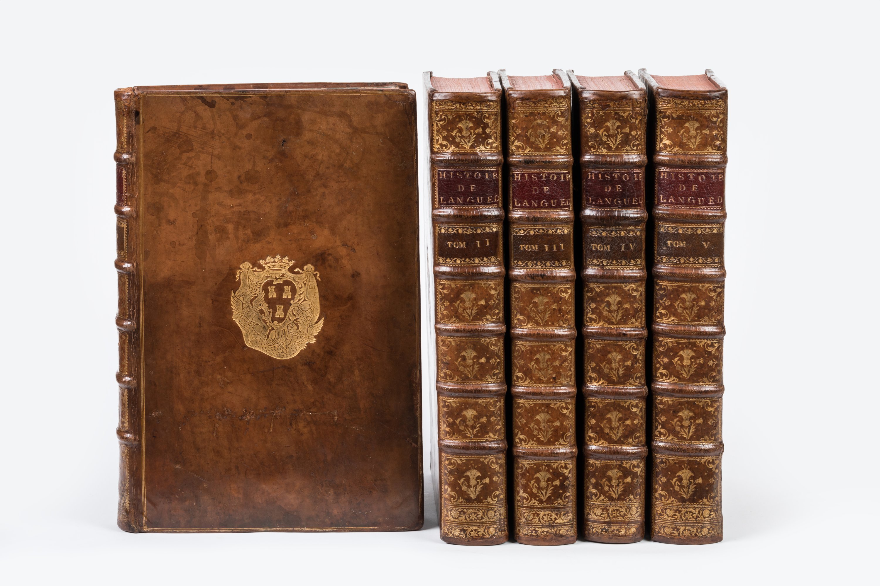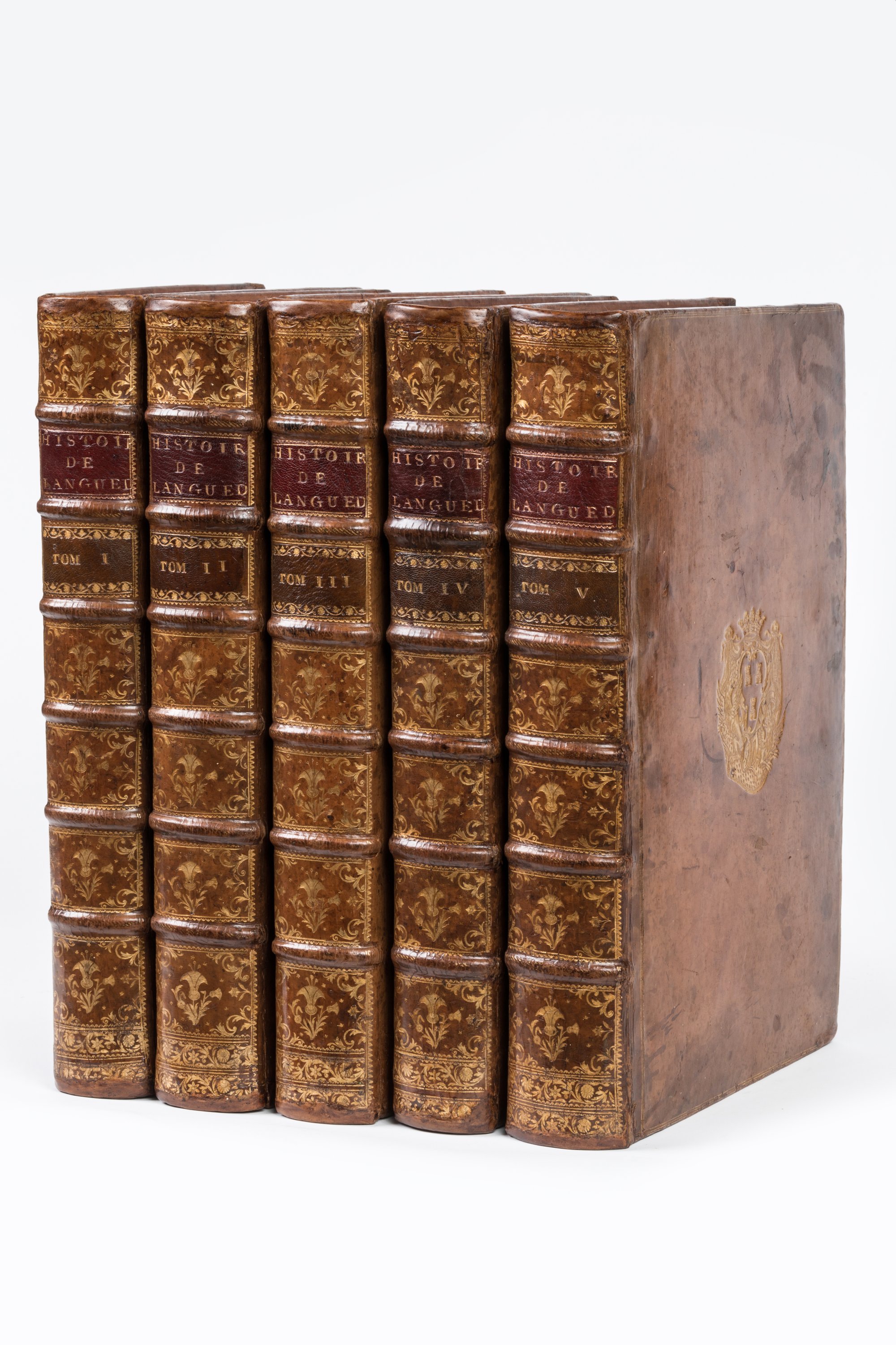 Bel exemplaire de cet ouvrage fondamental sur l'histoire du Languedoc, dont le dernier des volumes s'arrête à la mort de Louis XIII. Il est orné de quatre cartes dépliantes en coloris du temps et de 35 planches en noir, pour la plupart dépliantes.