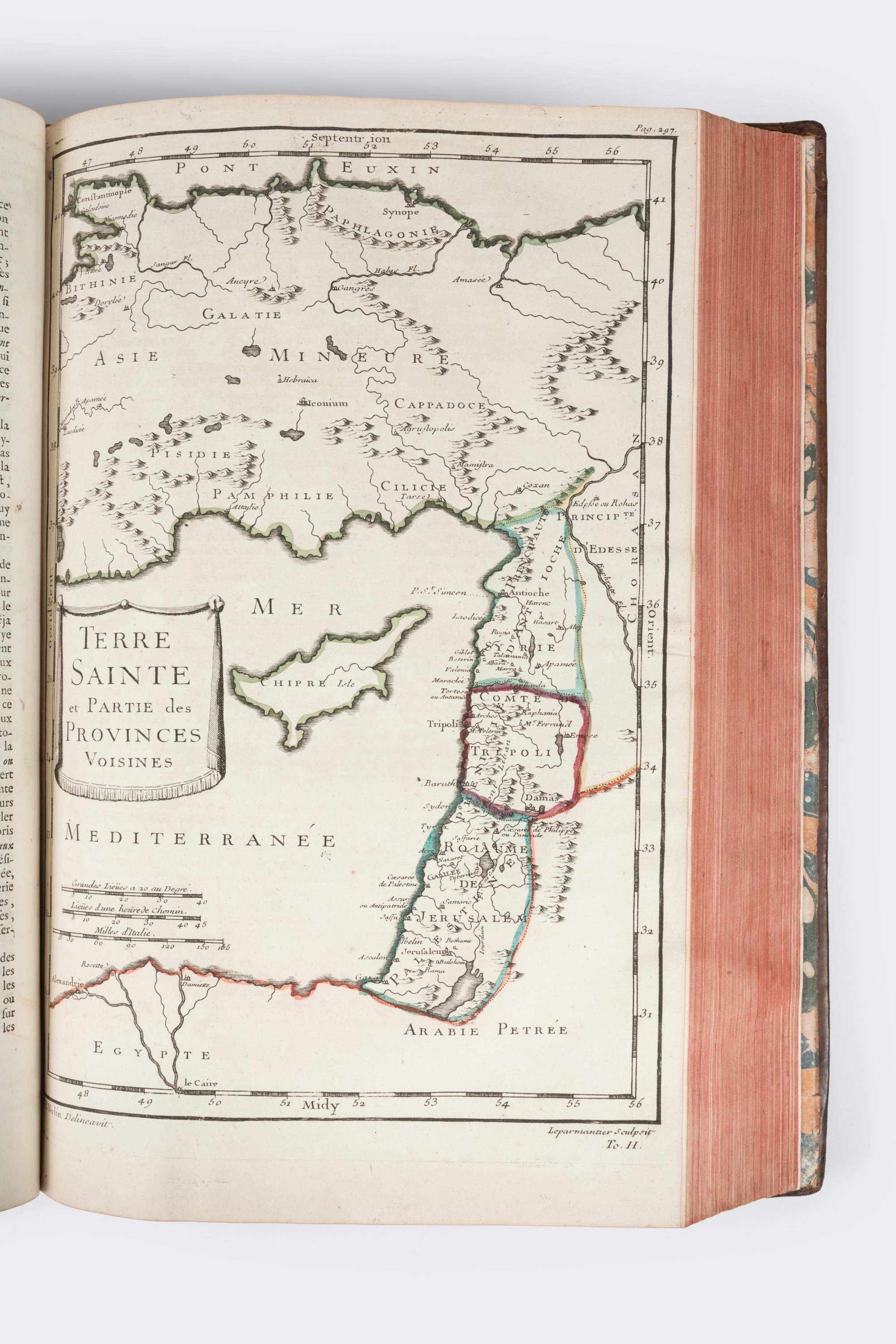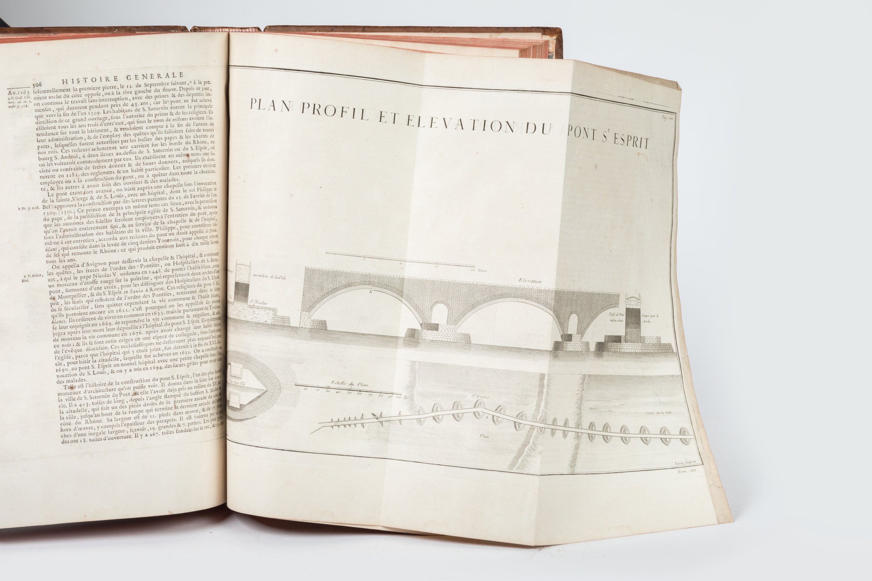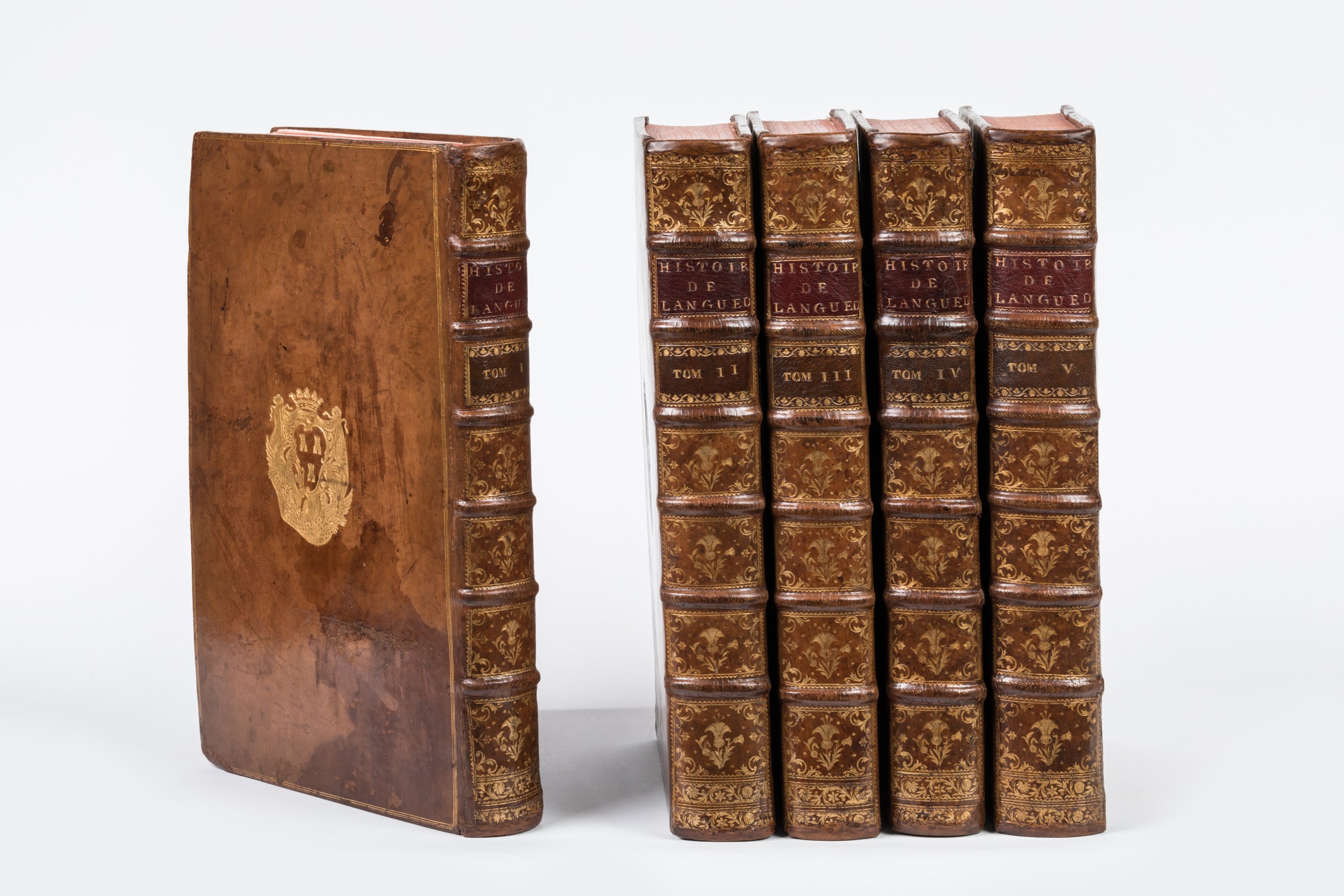 Bel exemplaire de cet ouvrage fondamental sur l'histoire du Languedoc, dont le dernier des volumes s'arrête à la mort de Louis XIII. Il est orné de quatre cartes dépliantes en coloris du temps et de 35 planches en noir, pour la plupart dépliantes.