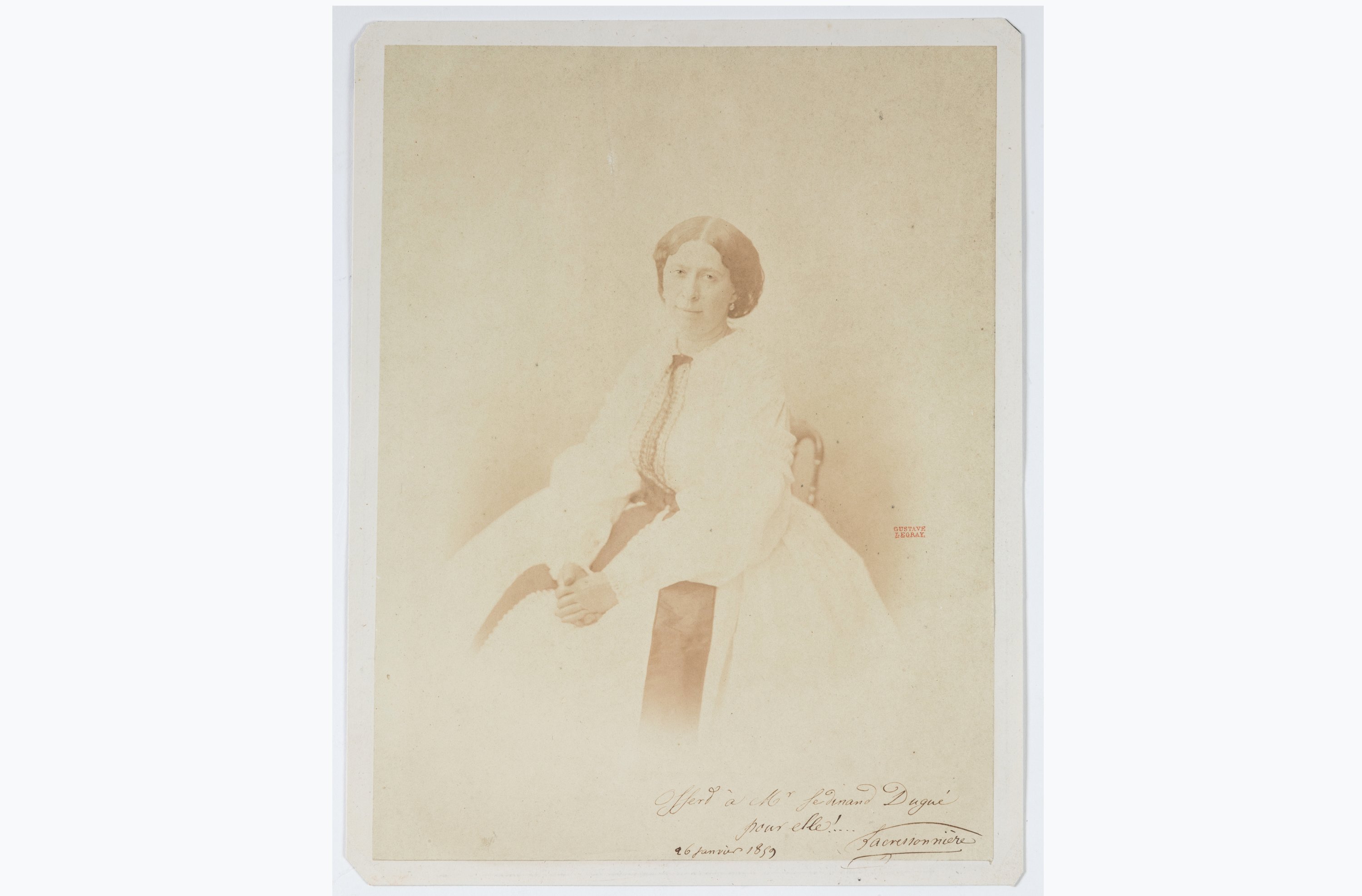 Très rare portrait de Madame Lacressonnière (Lyon, 1815 - Paris, 1859) dont on ne connait que deux épreuves différentes d’une même séance de pose: celui présenté dans cette vente et sa variante, non signée par Le Gray, qui se trouve dans l’album des portraits de personnalités composé par Léon Maufras, conservé à la BnF (feuillet 88 vue 179).