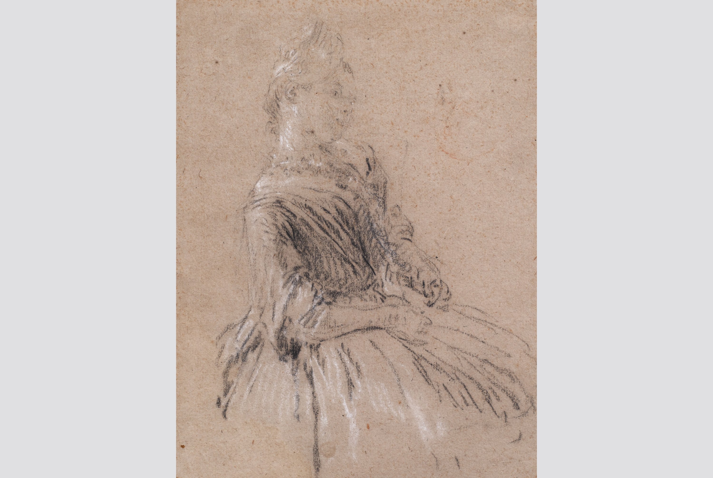 La position de notre modèle est proche des deux figures en bas à gauche du tableau intitulé « Le moulinet devant la charmille » et son pendant, « La danse dans un pavillon », conservés au château de Postdam (voir: G. Wildenstein, Nicolas Lancret, édition Georges Servant, Paris, 1924, p.78, n°132, fig.34, repr.)