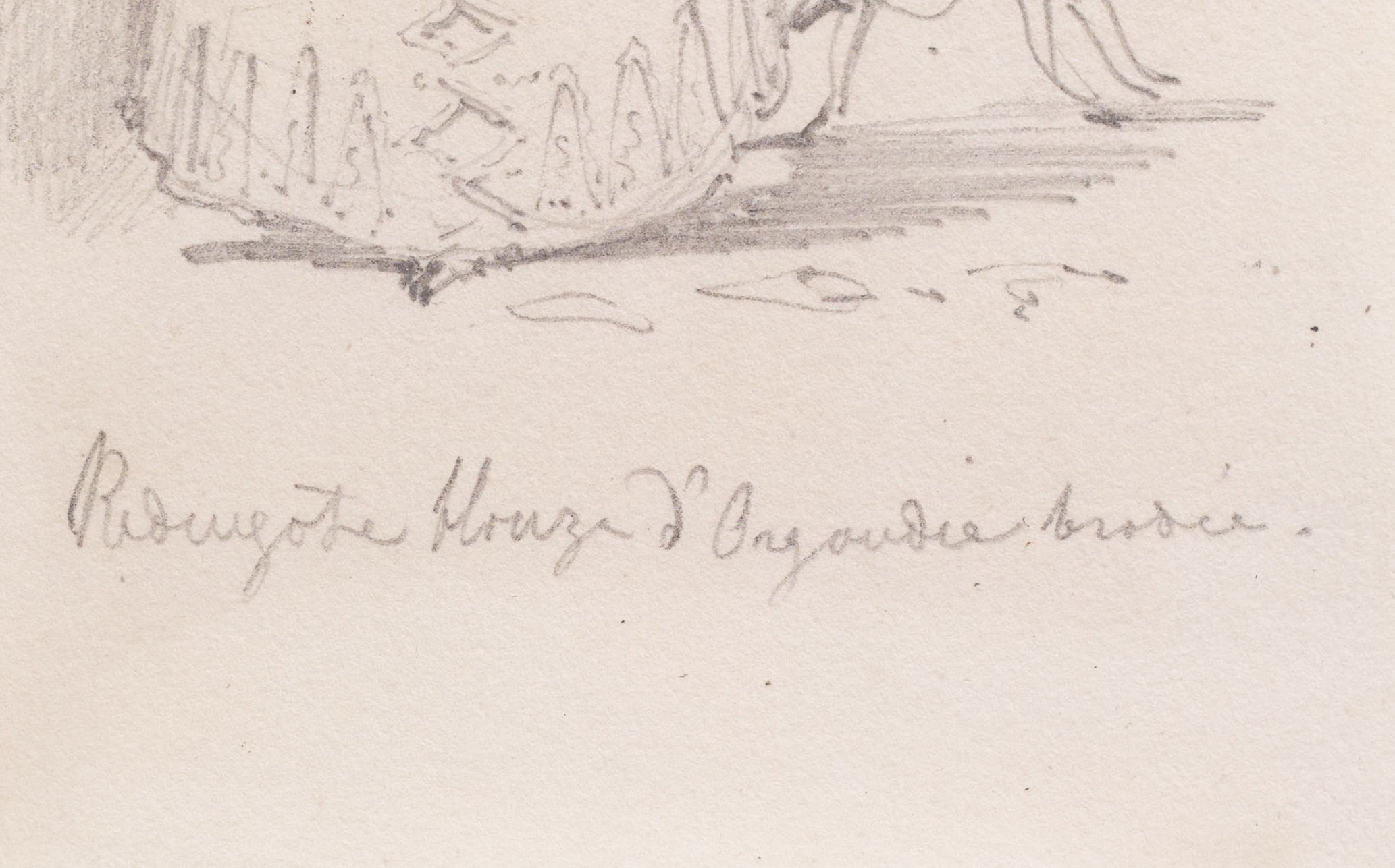 Notre dessin a été détaché d’un montage comprenant une dizaine de dessins envoyés par Bonington à Mme Perrier, à Dunkerque. Madame Perrier demande à Bonington de lui envoyer, en 1824, des exemples des tendances vestimentaires parisiennes pour ses filles et elle. Dans une lettre du 3 décembre 1824 à Mme Perrier (perdue, mais connue par une transcription à la Bibliothèque Nationale de France), Bonington mentionne passer du temps dans les magasins à étudier la mode. Dans une autre lettre du 31 décembre (perdue, mais également connue par une transcription à la Bibliothèque Nationale de France), Bonington écrit qu’il va envoyer les dessins.
