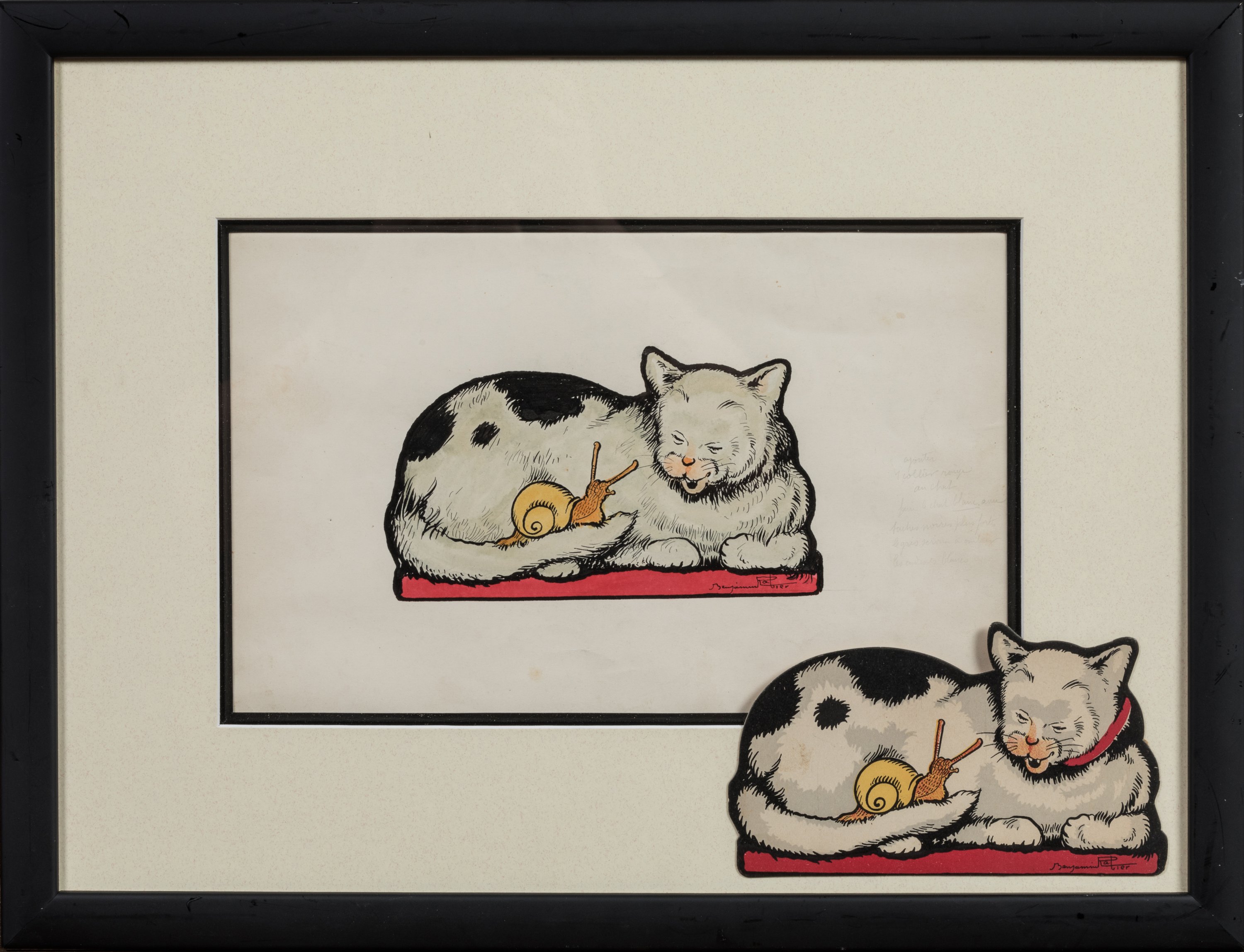 Le dessin préparatoire du chat et de l’escargot est un rare témoignage du travail en atelier de Benjamin Rabier, au regard de ses indications. Il sert à la décoration d'une boite à gaufrettes. Par ses couleurs, ce chat n'est pas sans rappeler "Bob", qui partage ses aventures avec "Titine", la "petite sarcelle du Midi". Benjamin Rabier conte leur histoire dans un album publié en 1938.