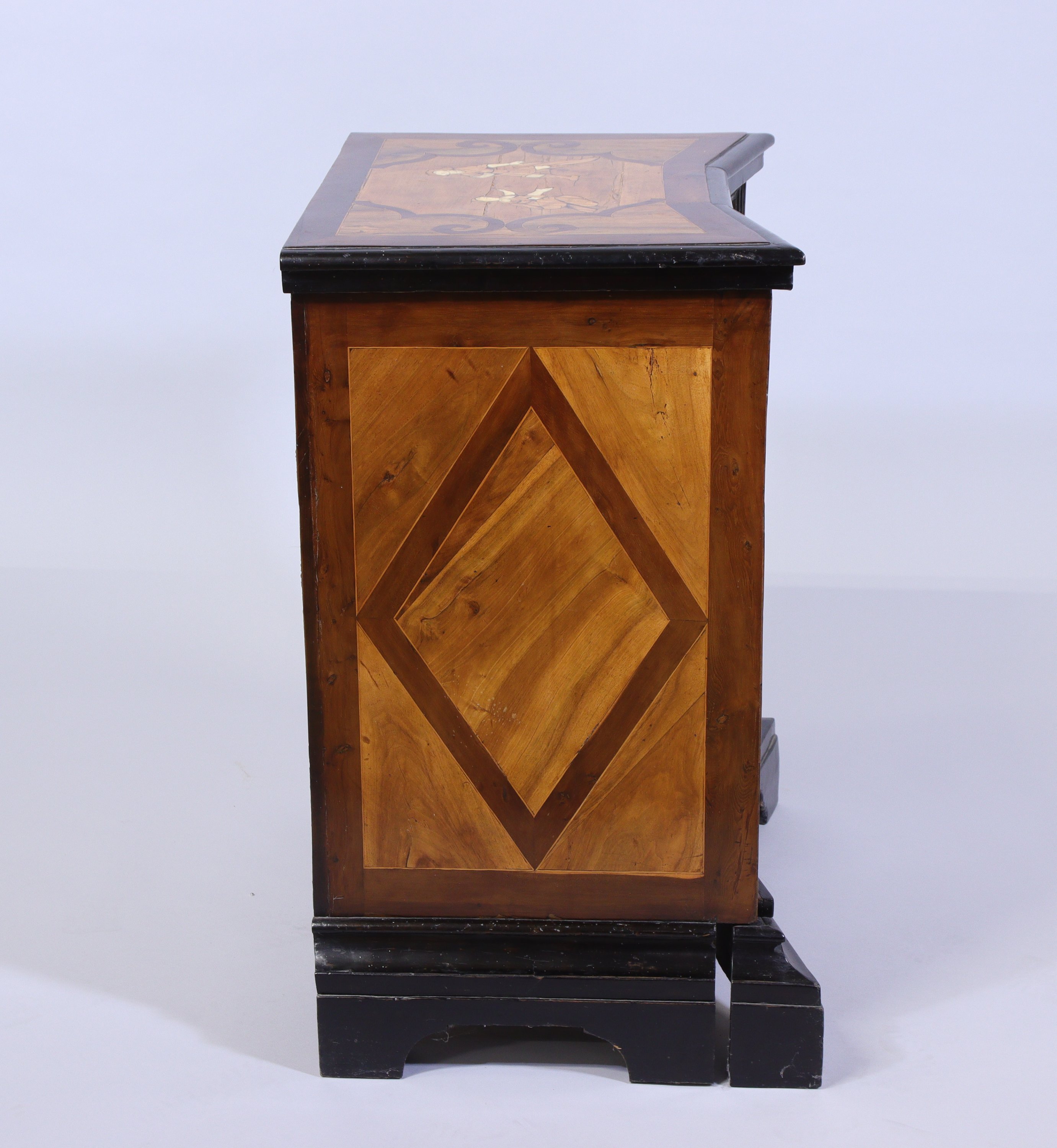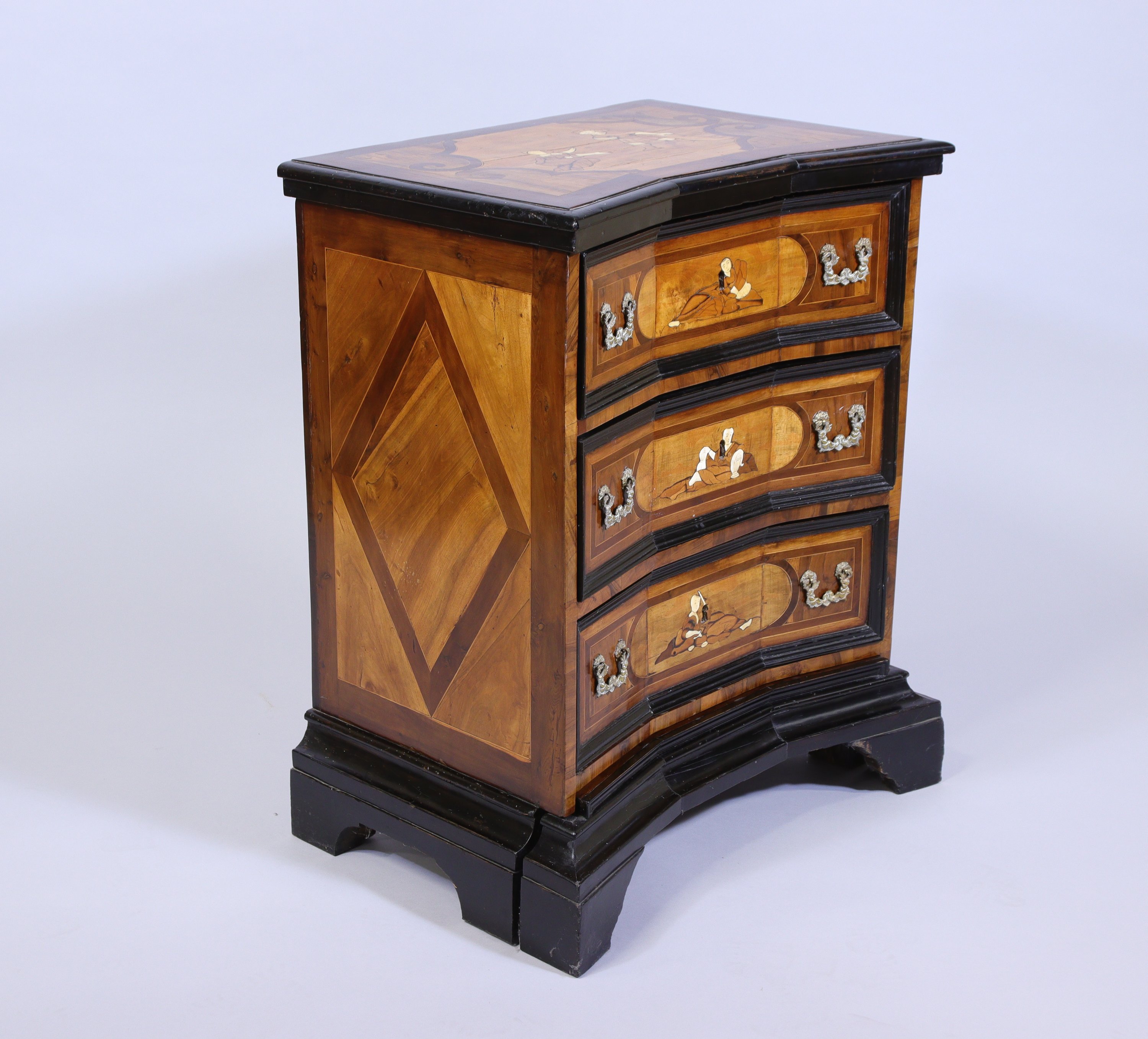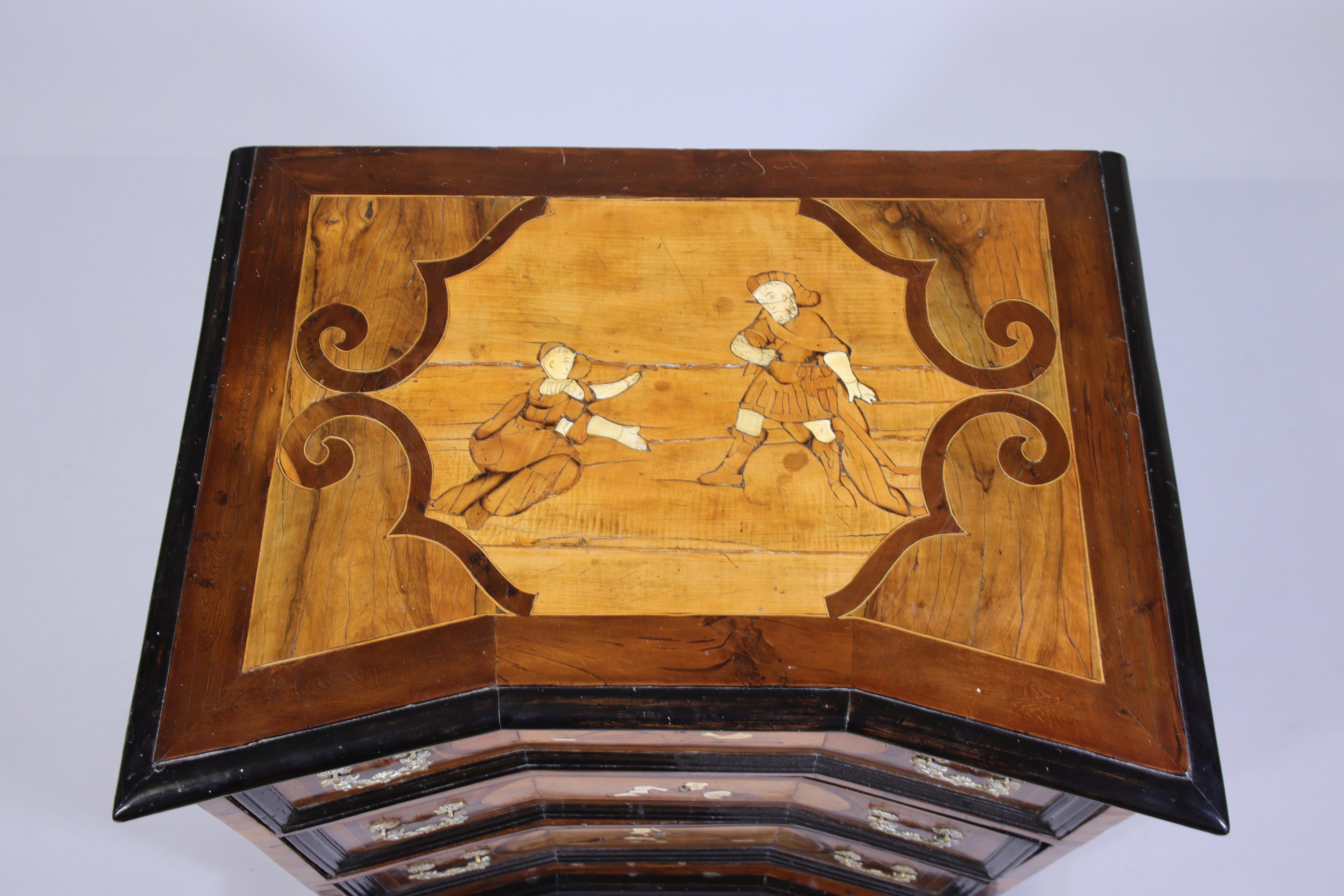 Austria, 18th C. A sycamore, olive and blackened wood marquetry chest of drawer-oratory with bone inlays. Brass mounts added later.