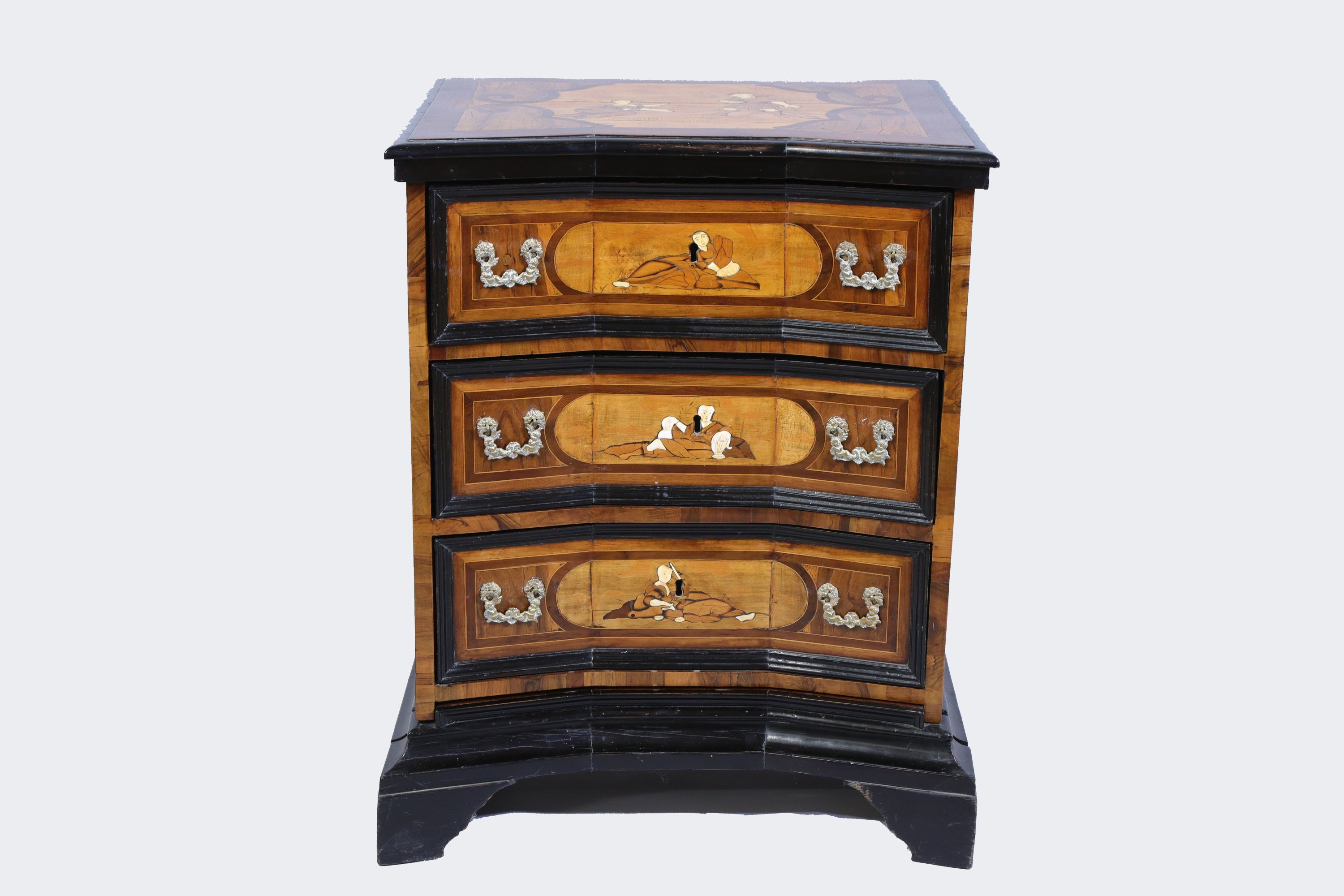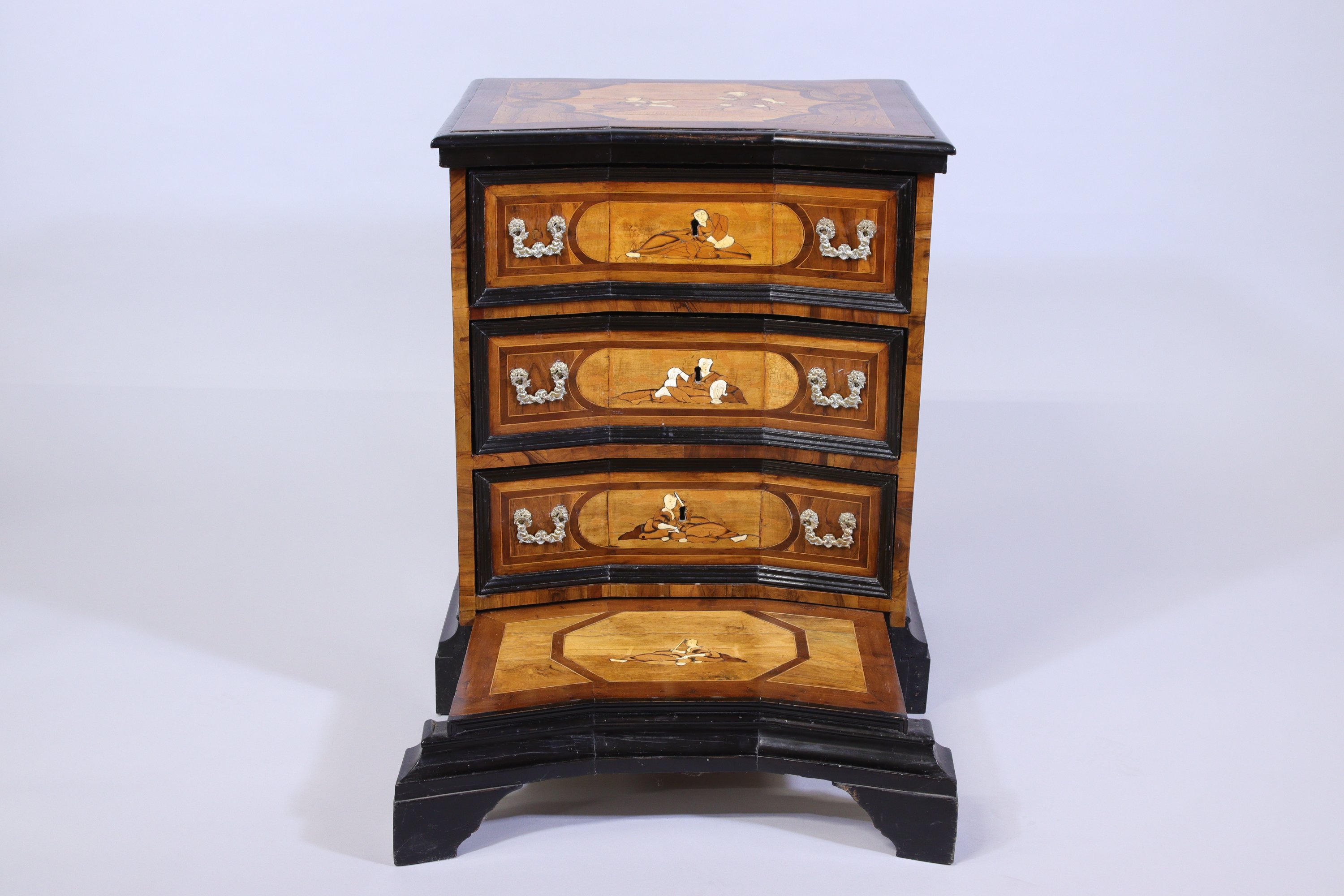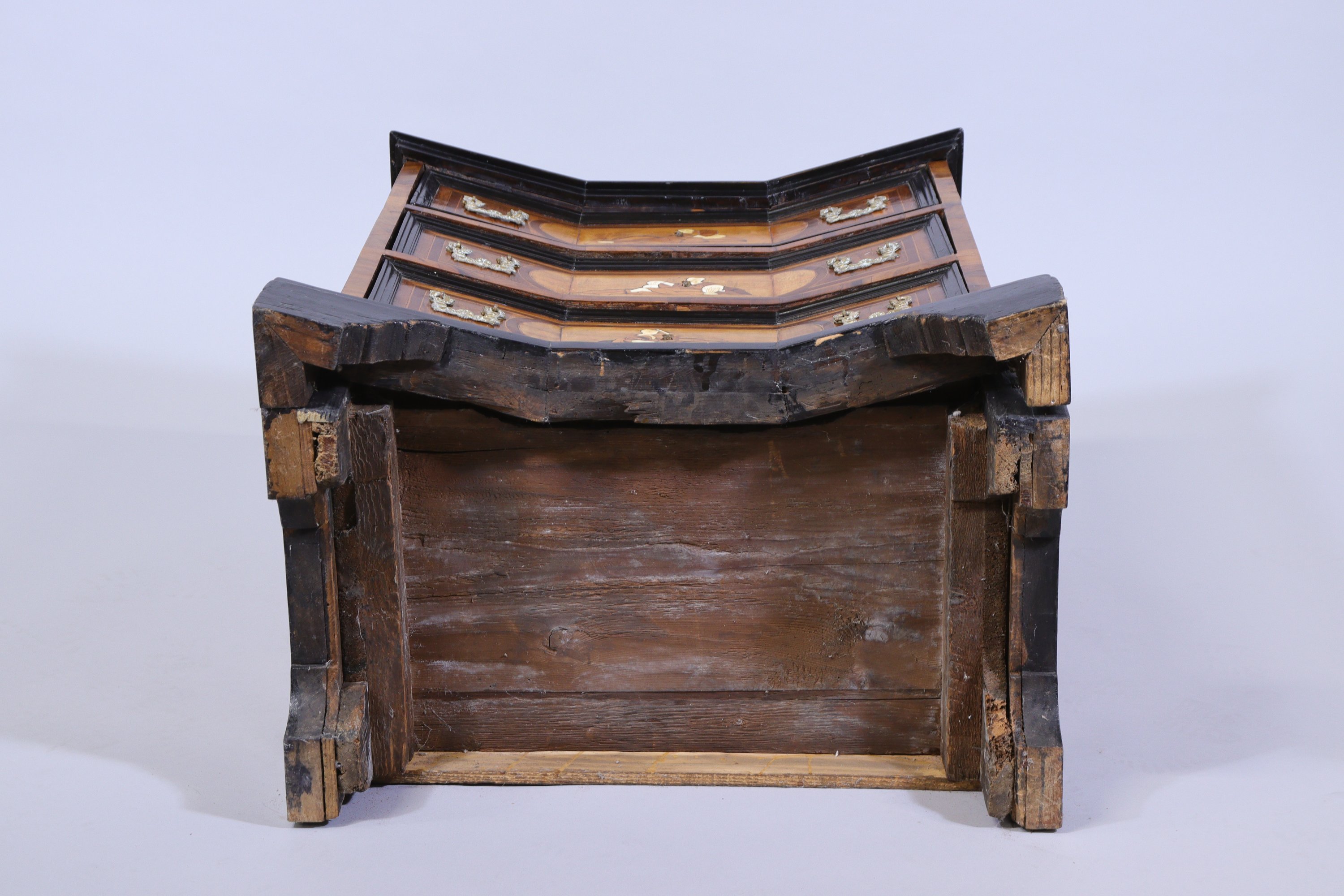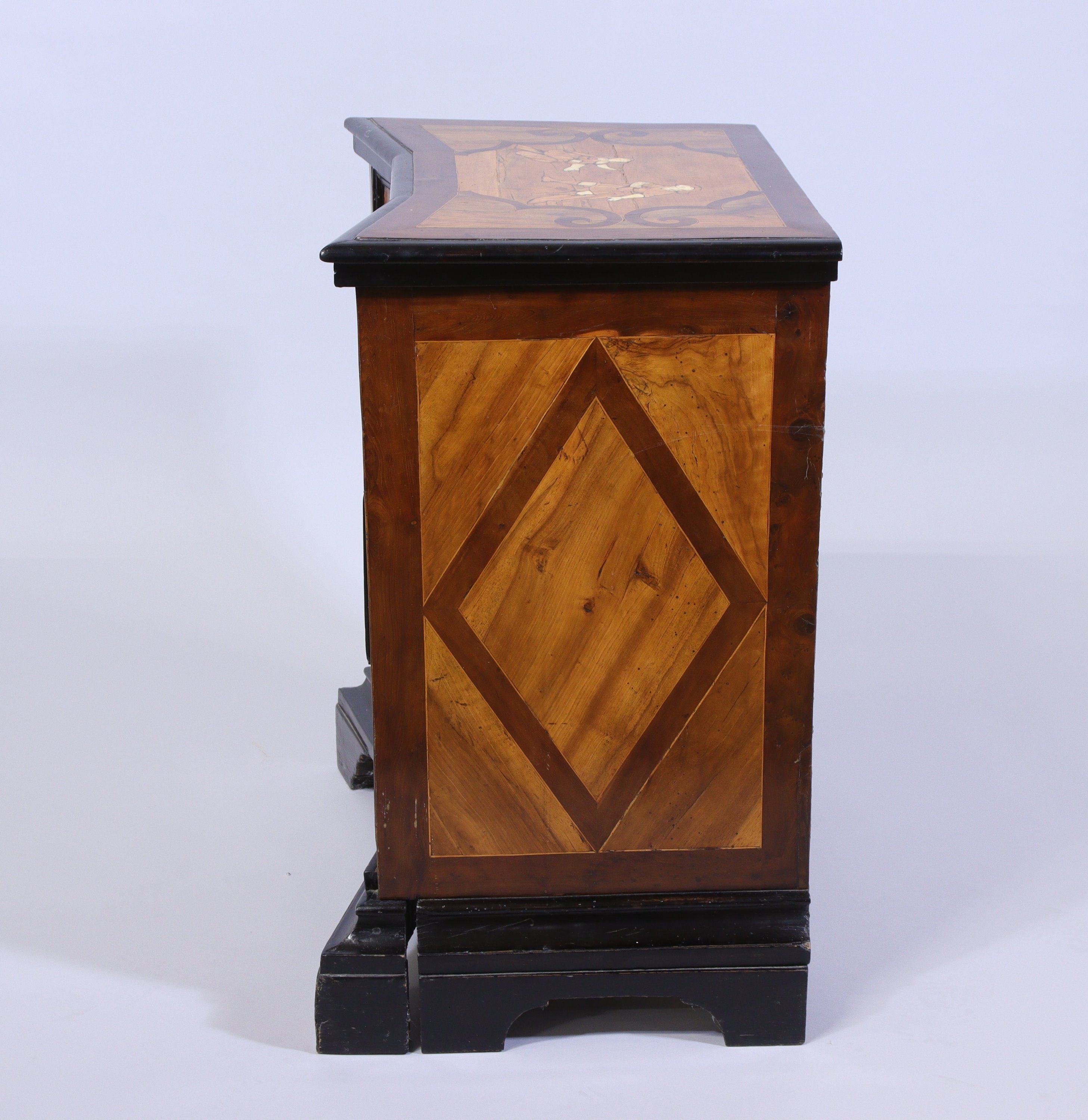 Austria, 18th C. A sycamore, olive and blackened wood marquetry chest of drawer-oratory with bone inlays. Brass mounts added later.