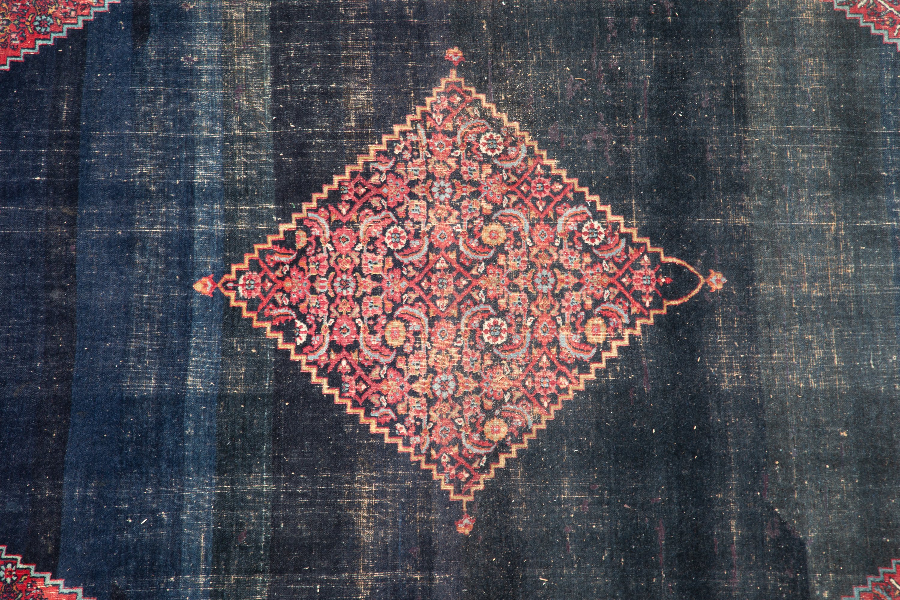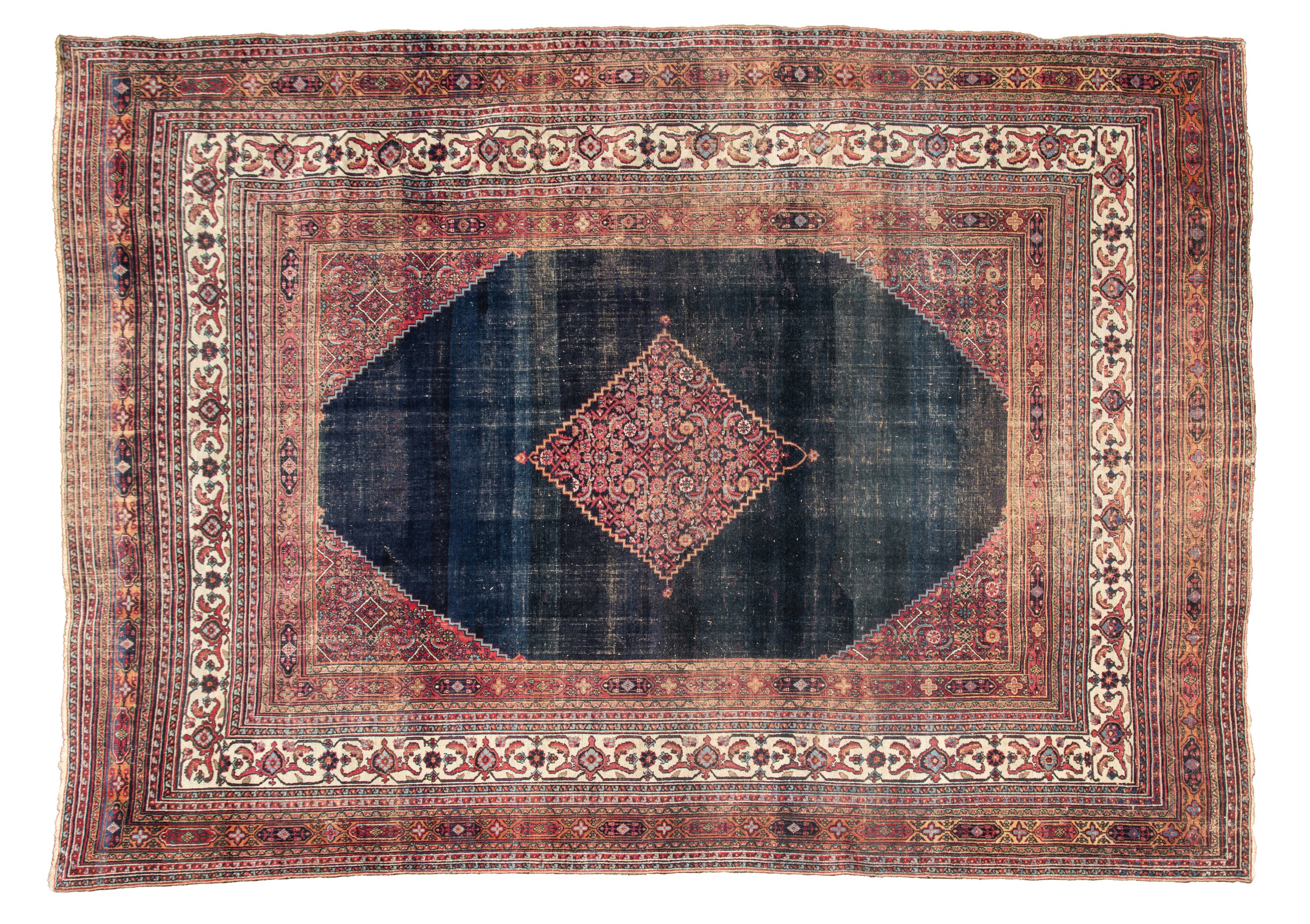 à fond noir, décor rhylla d’un médaillon losangique, écoinçons rhylla, large bordure crème de fleurs entre de multiples galons.