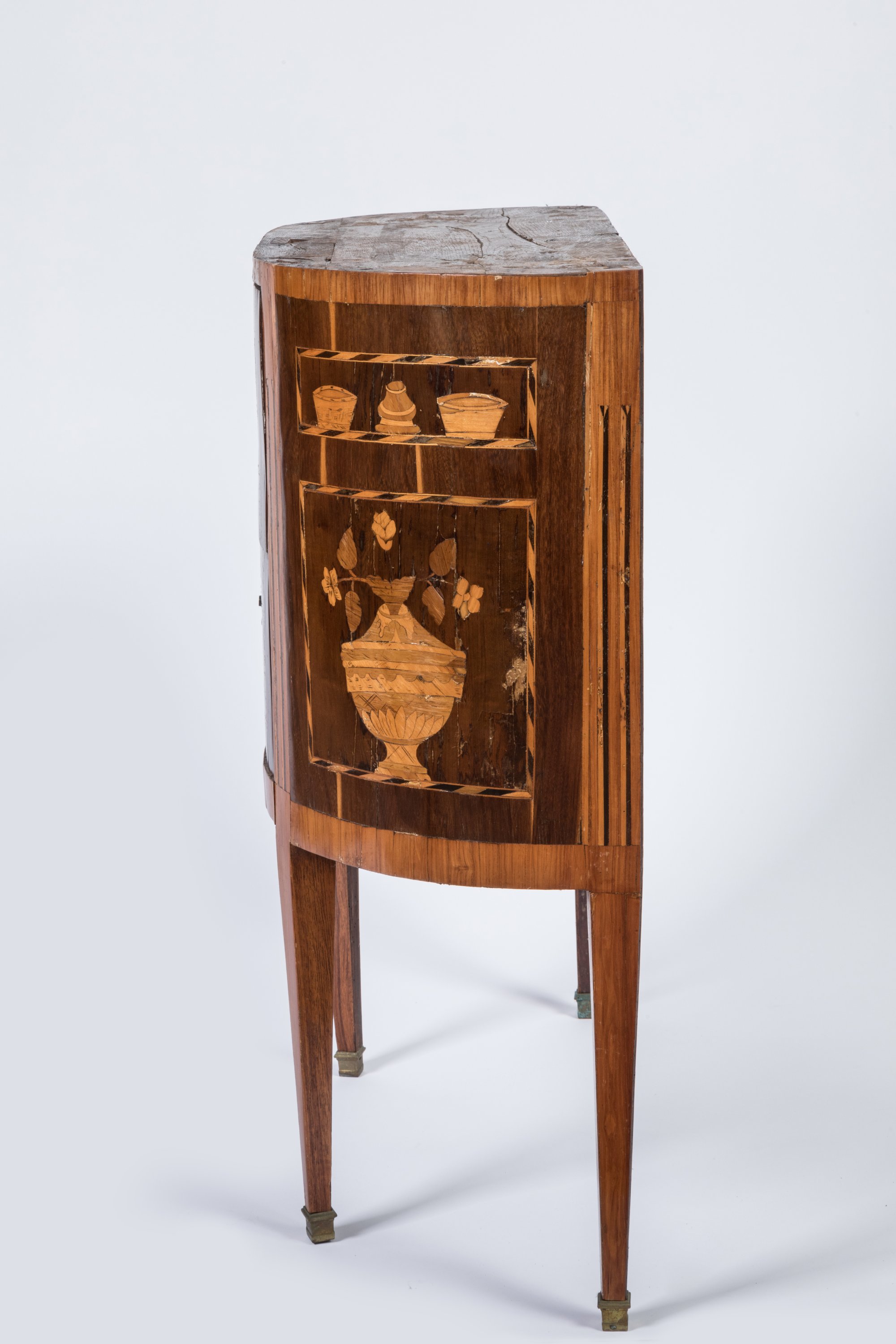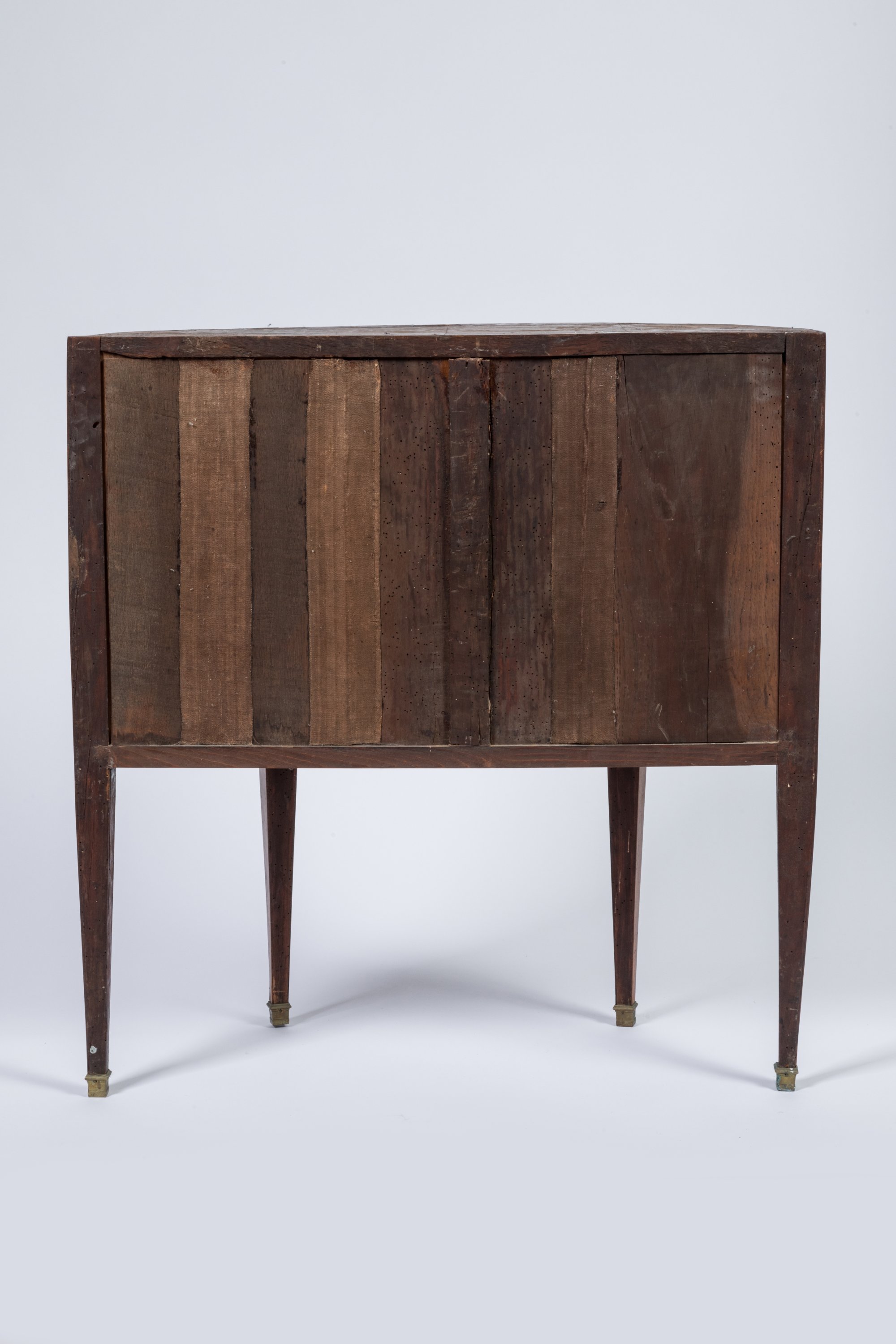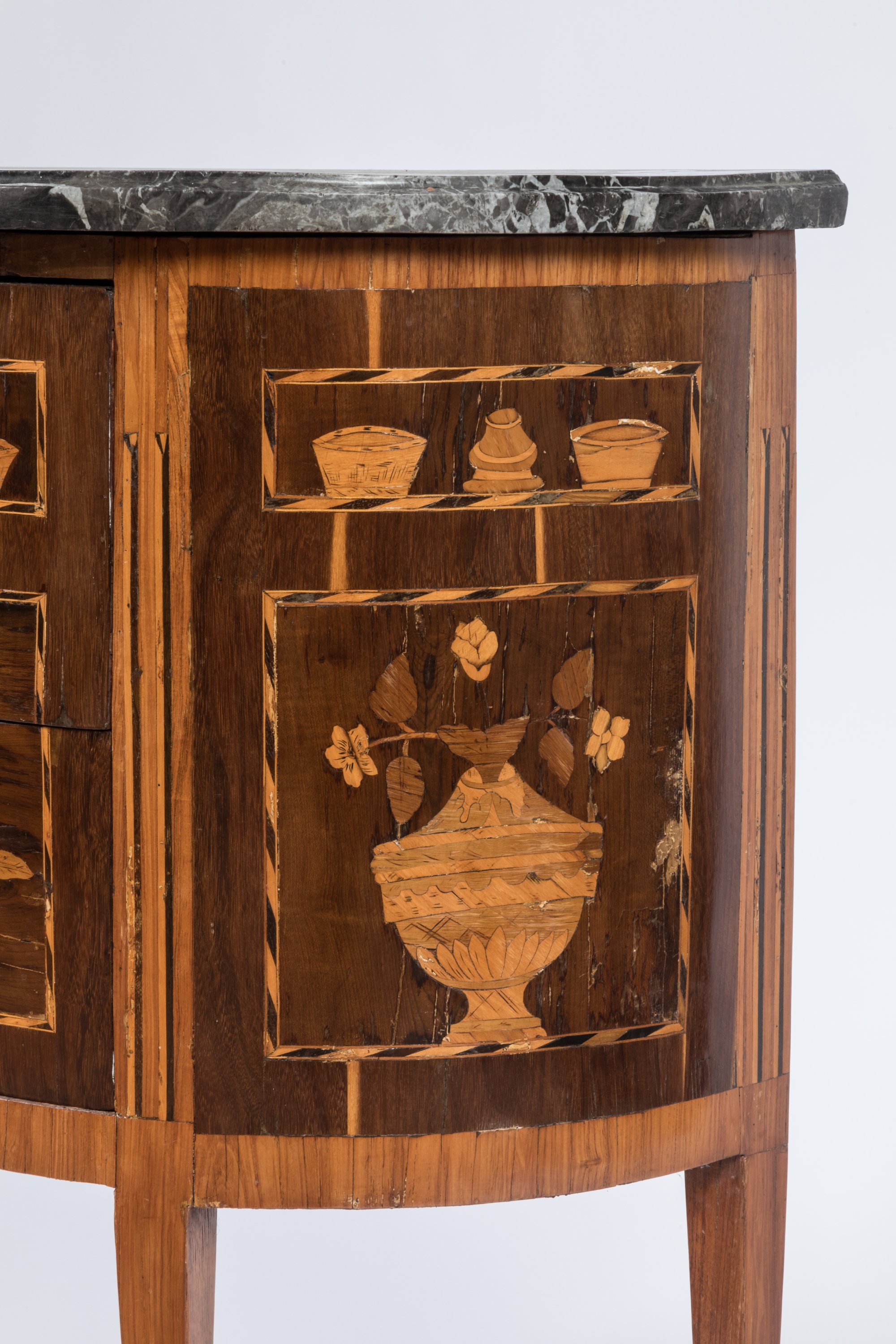 Attributed to Fidelys Schey. A half-moon rosewood, amaranth, boxwood and sycamore veneer chest of drawers. Brass mounts. Grey marble top.