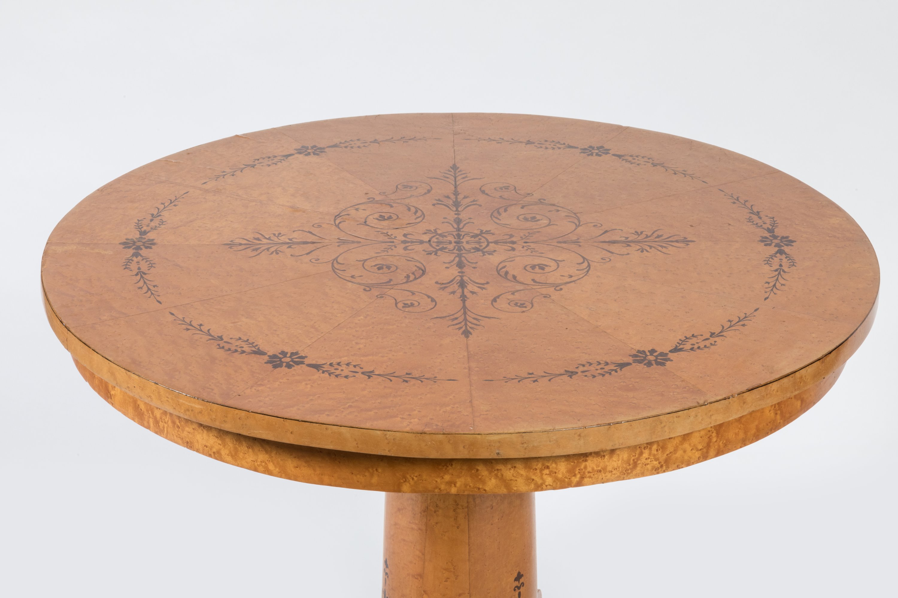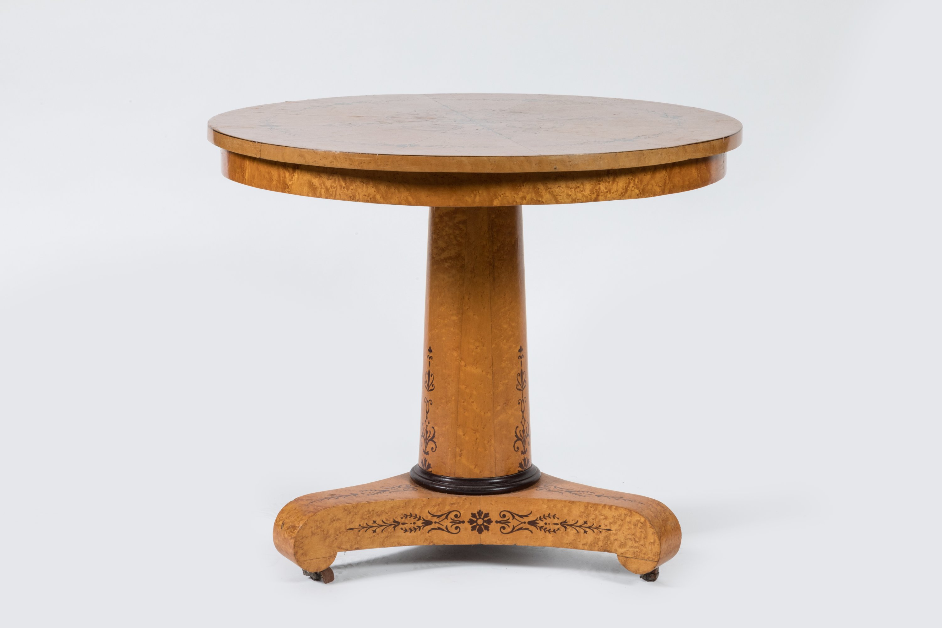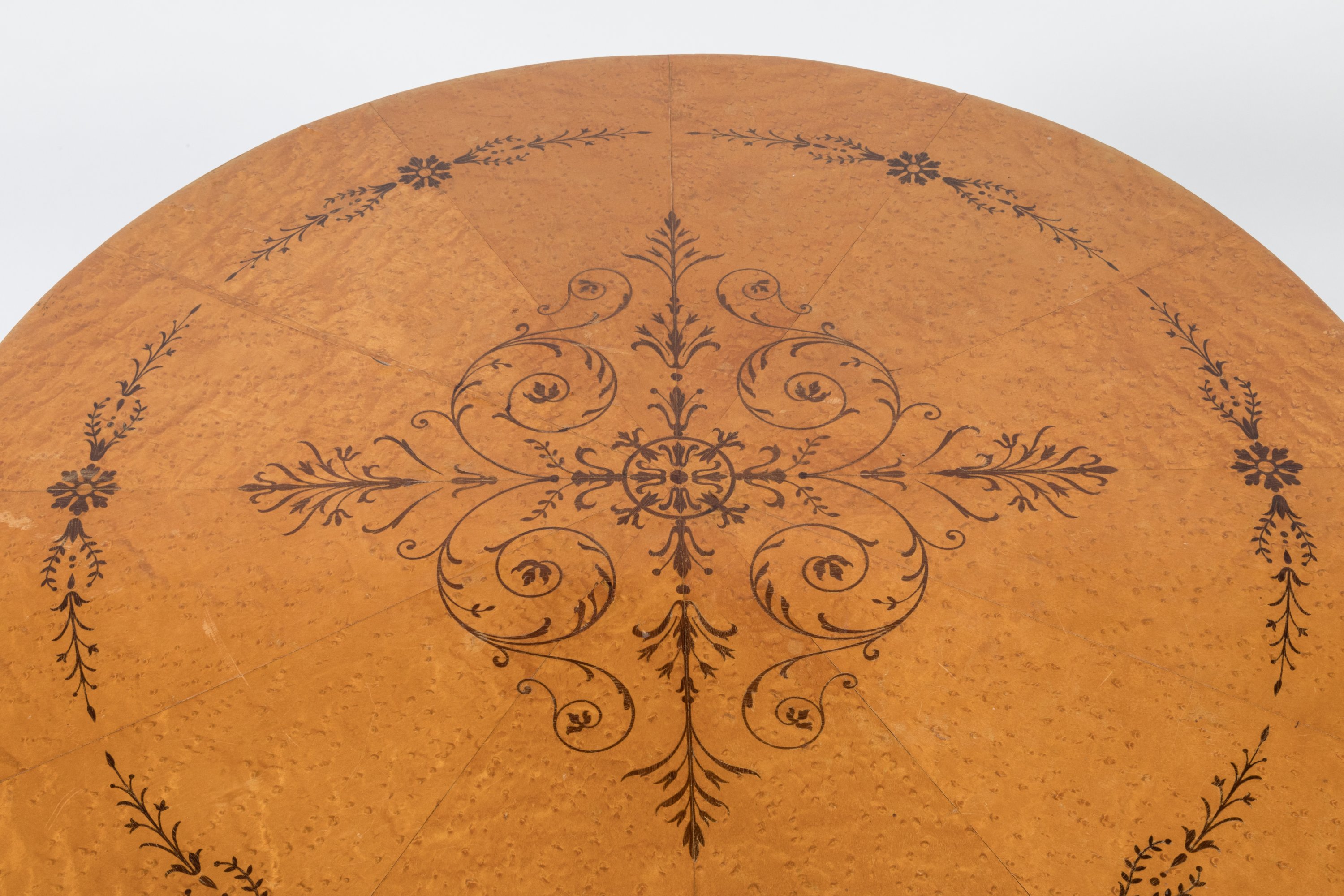 en placage d'érable moucheté et amarante, le plateau circulaire décoré d'une rosace dans un entourage de rinceaux souligné par une frise de fleurs et de lauriers. Le fût se termine par une bague et repose sur un piétement tripode sur roulettes.