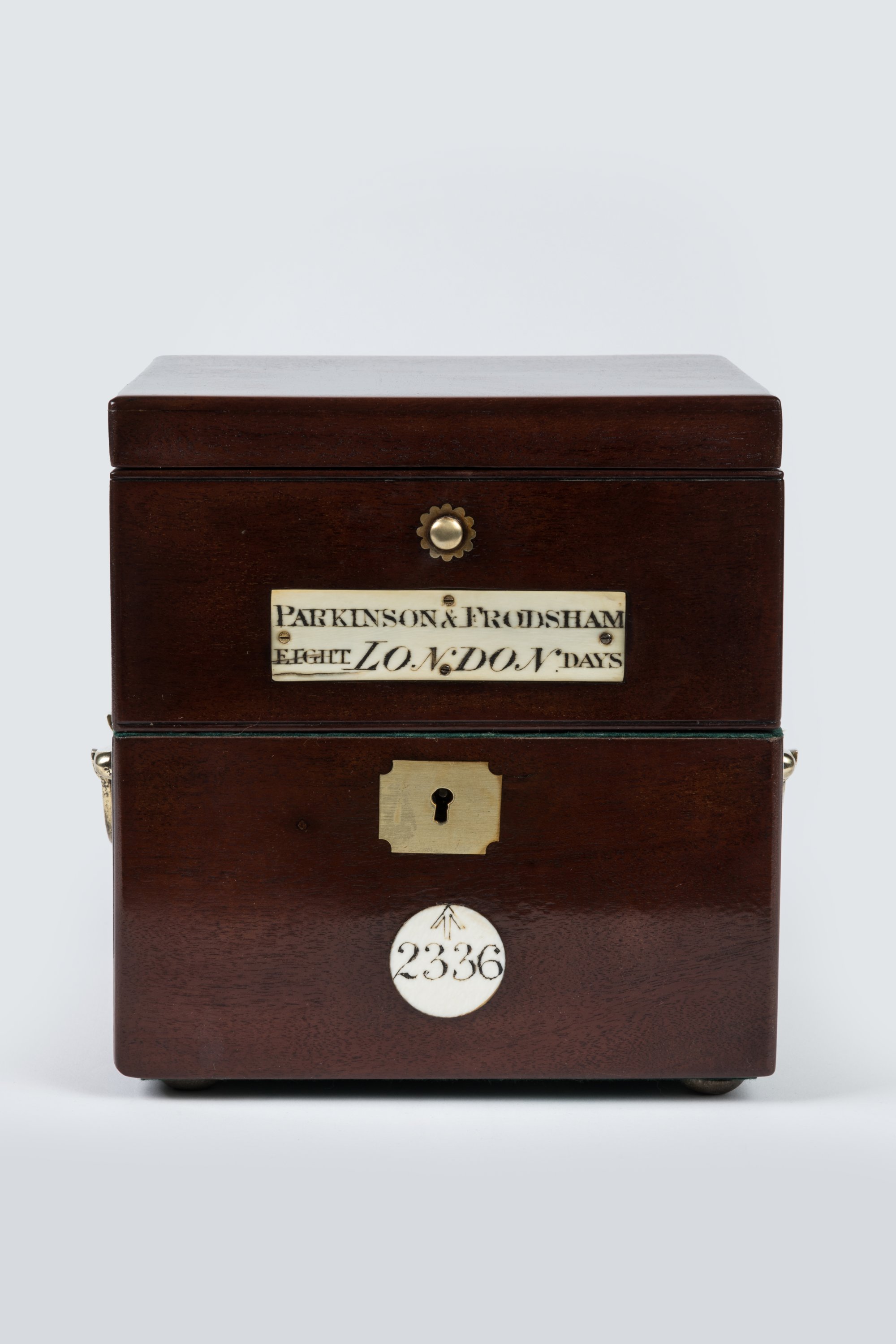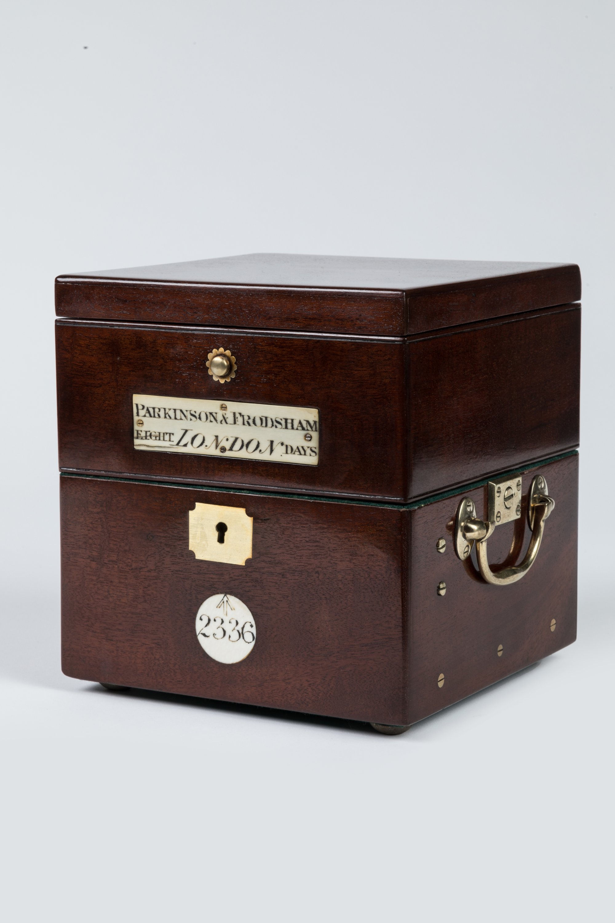 Parkinson & Frodsham, second half of 19th C. Eight-day marine chronometer. In a mahogany box with brass handles and keyhole plate. Signed box, dial and movement. Number 2336 on box and dial.
