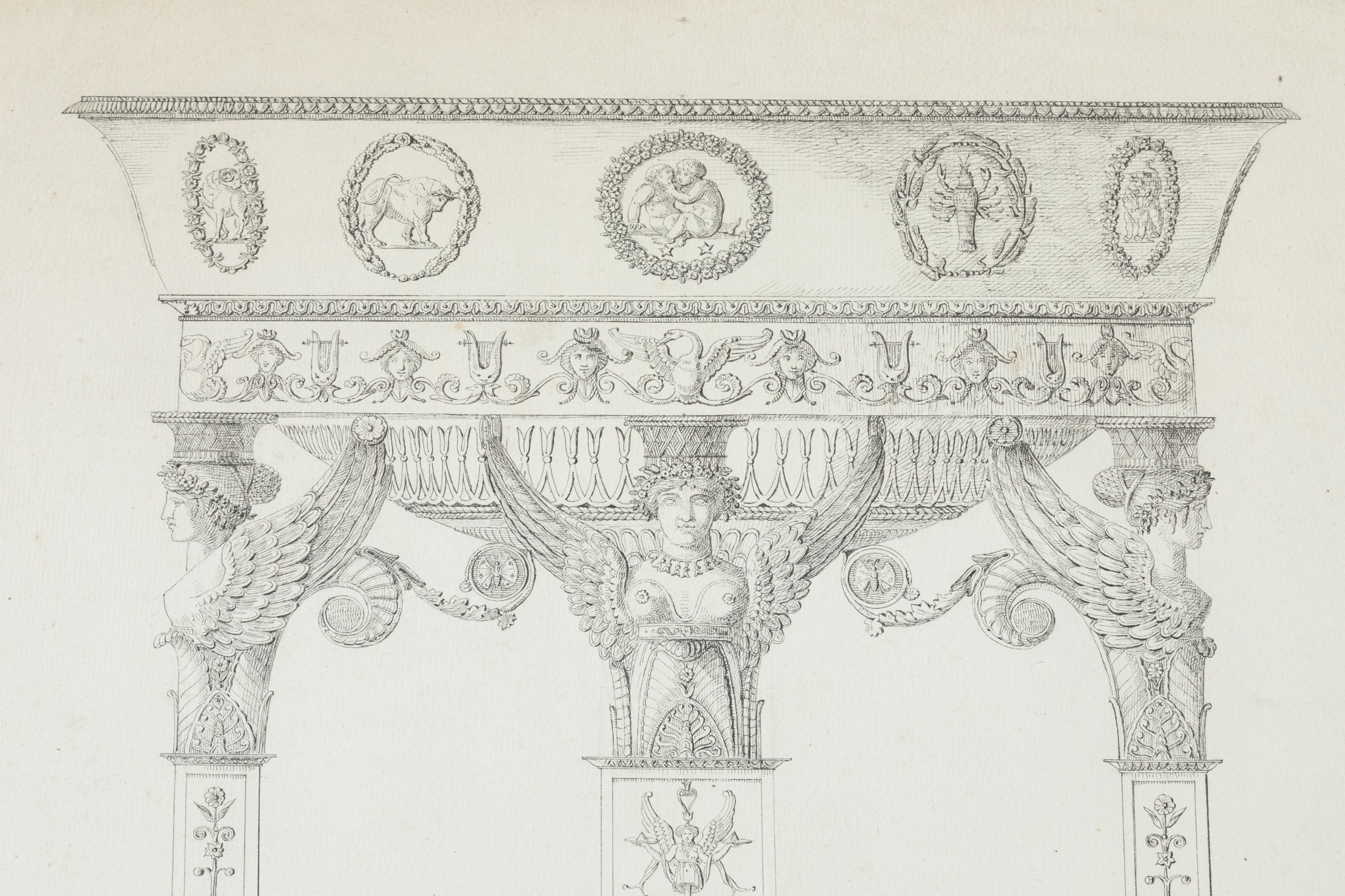 En 1806, Jean-Baptiste-Claude Odiot présente à l'Exposition des Produits des Arts et de l'Industrie une athénienne en or et argent, dont le bassin est orné de la composition d'Antoine-Denis Chaudet. Celle-ci est reproduite dans la "Gazette de l'amateur". Réalisée la même année que notre dessin, elle diffère toutefois par la composition générale de son décor et par la présence d'une tablette d'entrejambe. Outre les mentions manuscrites attribuant la commande à l'Impératrice Joséphine, la présence de médaillons à son effigie montre la destination du meuble. En 1810, en collaboration avec Thomire, Odiot livre également deux autres athéniennes pour l'Impératrice Marie-Louise. Si les pilastres sont coiffés de bustes de femmes ailées à l'instar de notre projet, ils sont en revanche terminés par des cygnes.