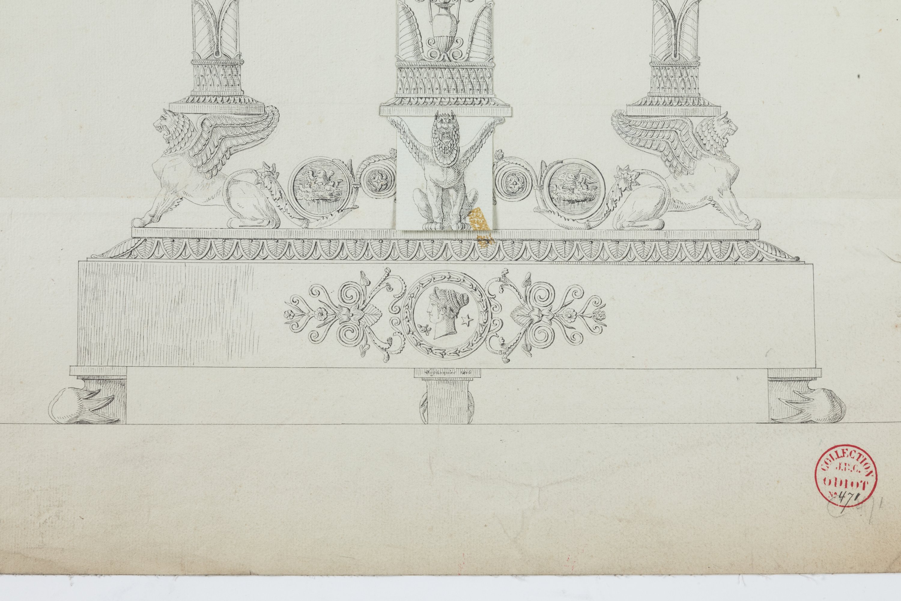 Ce dessin est référencé dans les archives Odiot sous le numéro « 471 »: « Dessin à la plume grandeur d’exécution. Trépied et cuvette riche destinés à l’Impératrice Joséphine - sur trois griffes d’angle, soubassement mouluré à palmettes [ ] face ornée d’un médaillon portrait de Joséphine encadré [ ] avec volet couchant au centre du trépied un fût à culot coiffé d’un feu. Dessin de Dupasquier 1806. Encadré d’une couronne de culots avec deux motifs rouleaux de chaque côté, trois lions ailés, assis, [?] de rinceaux avec rosaces médaillons colombes, supportent trois pilastres droits reliés par une barrette large, plate, ayant au centre un dauphin pilastres dont la face est ornée de cigognes écureuil, colombes et mascarons superposés en arabesque, un profil est orné de baguettes de lierre. Au sommet, trois cariatides femmes ailées sur chapiteau feuilles d’eau et palmettes. Cercle avec frise femmes, mascarons et lyres, corps de cuvette, médaillons avec signes du zodiaque".