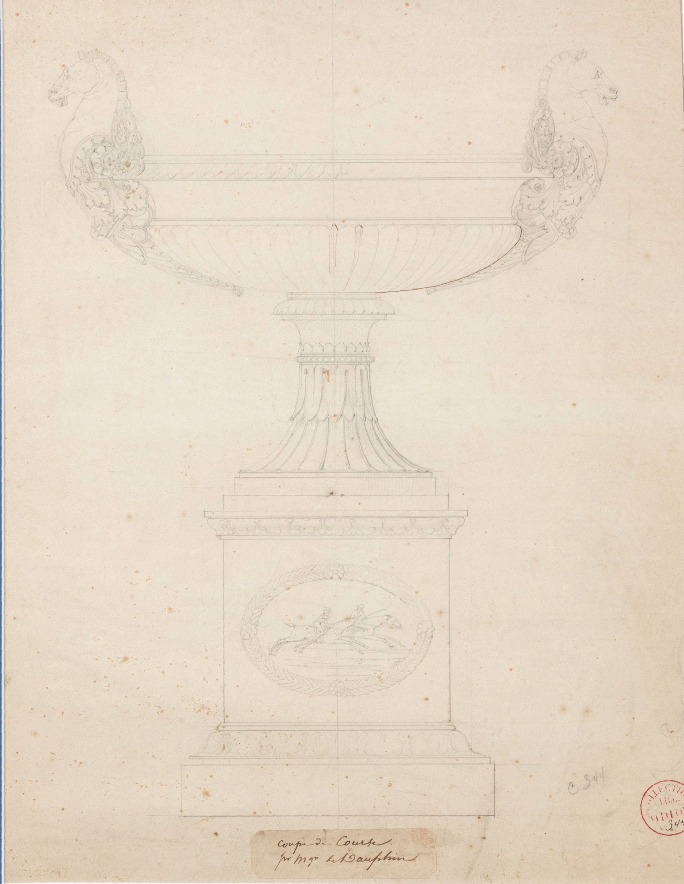 Ce projet de trophée est un travail préparatoire, destiné à répondre à une commande du Dauphin, Louis-Antoine de France, duc d'Angoulême - fils aîné de Charles X et de Marie Thérèse de Savoie. Il n'est pas certain que cette composition ait été retenue, comme en témoigne un autre trophée de course référencé sous le n°430 dans les archives de l'orfèvre. Les têtes de chevaux ne sont plus disposées sur les anses mais habillent le piétement de la coupe. Quoi qu'il en soit, Odiot présente à l'Exposition des Produits de l'Industrie en 1827 l'oeuvre finale qui est décrite comme "une coupe commandée par Monseigneur le Dauphin [qui] est destinée aux prix des prochaines courses de chevaux".