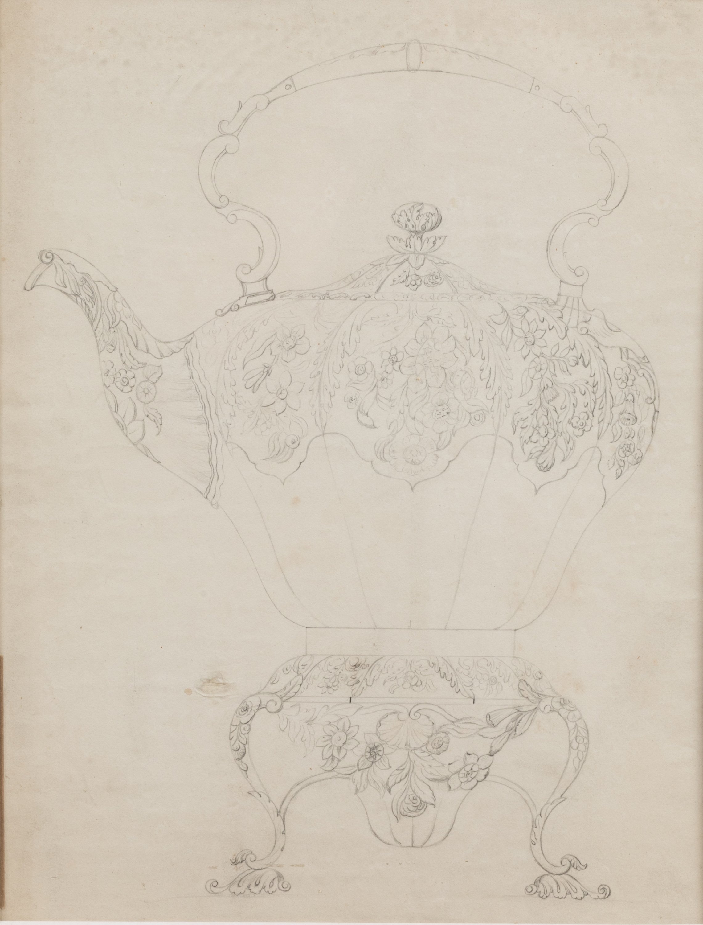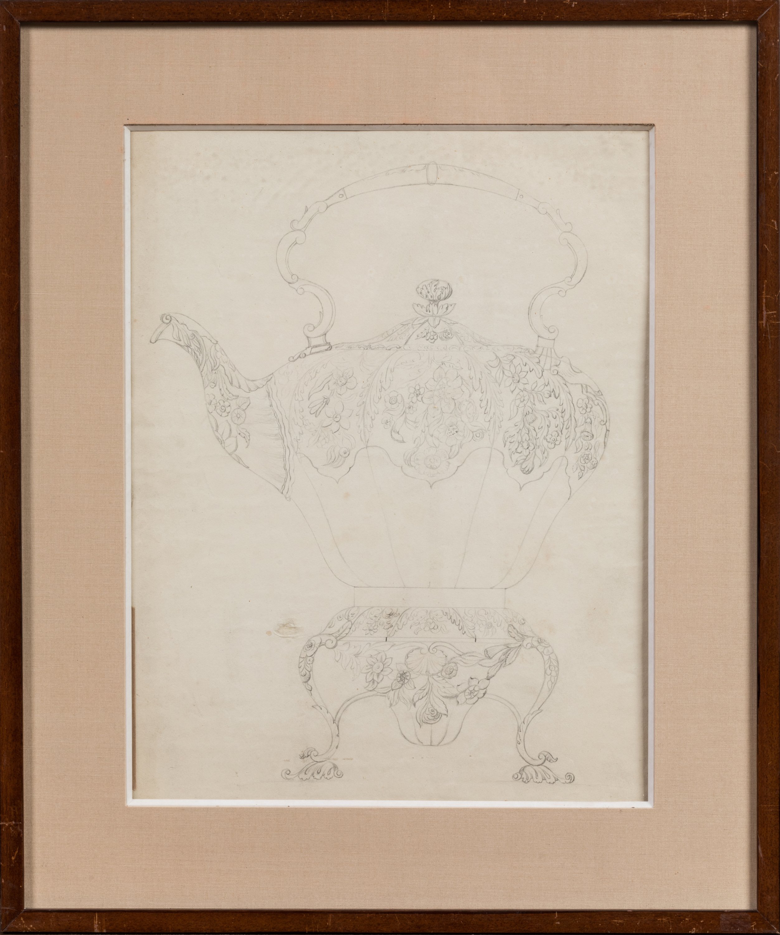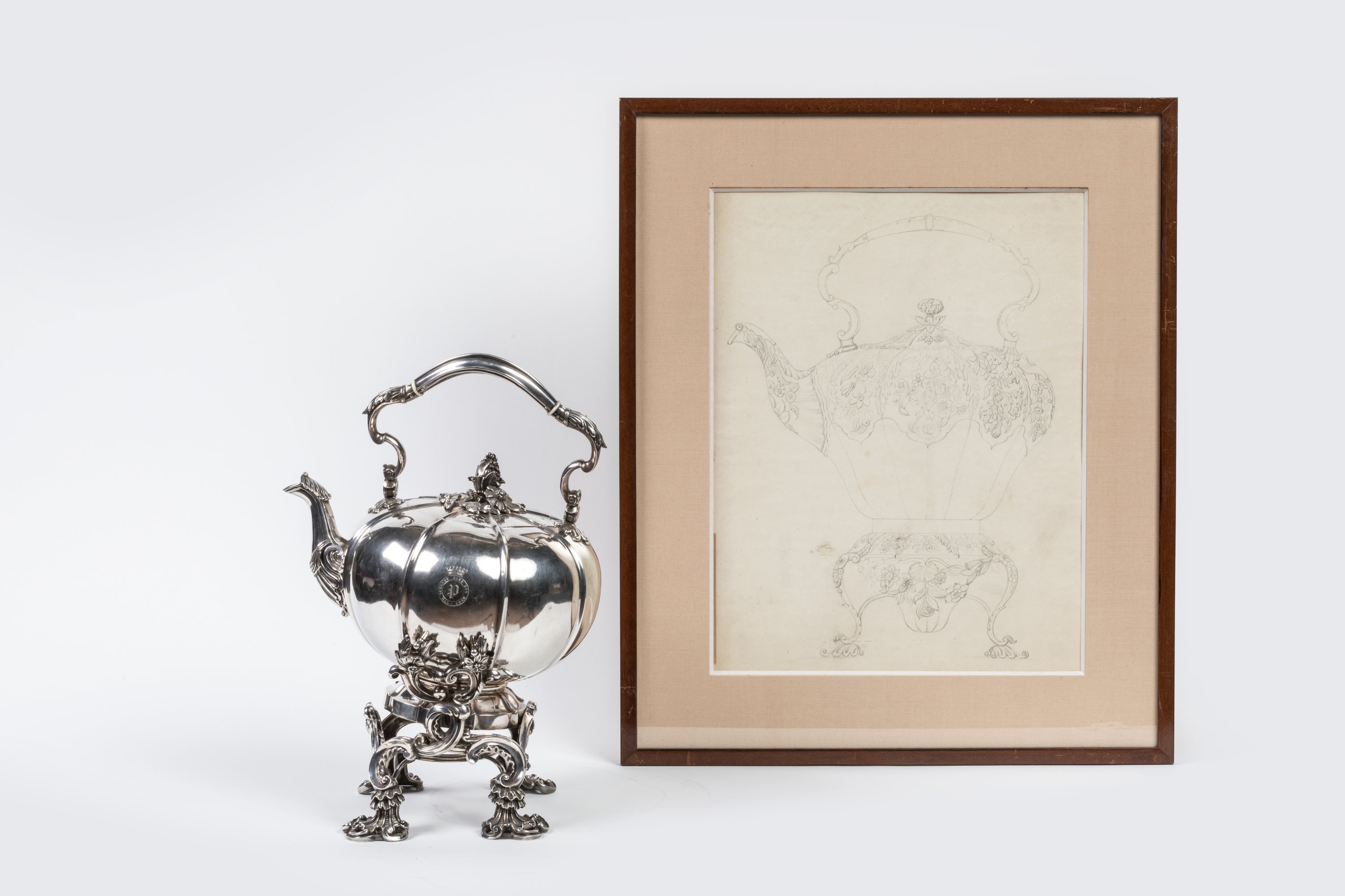 Charles Nicolas Odiot. A silver kettle bearing the von Pfeffel family motto and its preparatory drawing. From the Maison Odiot collections.