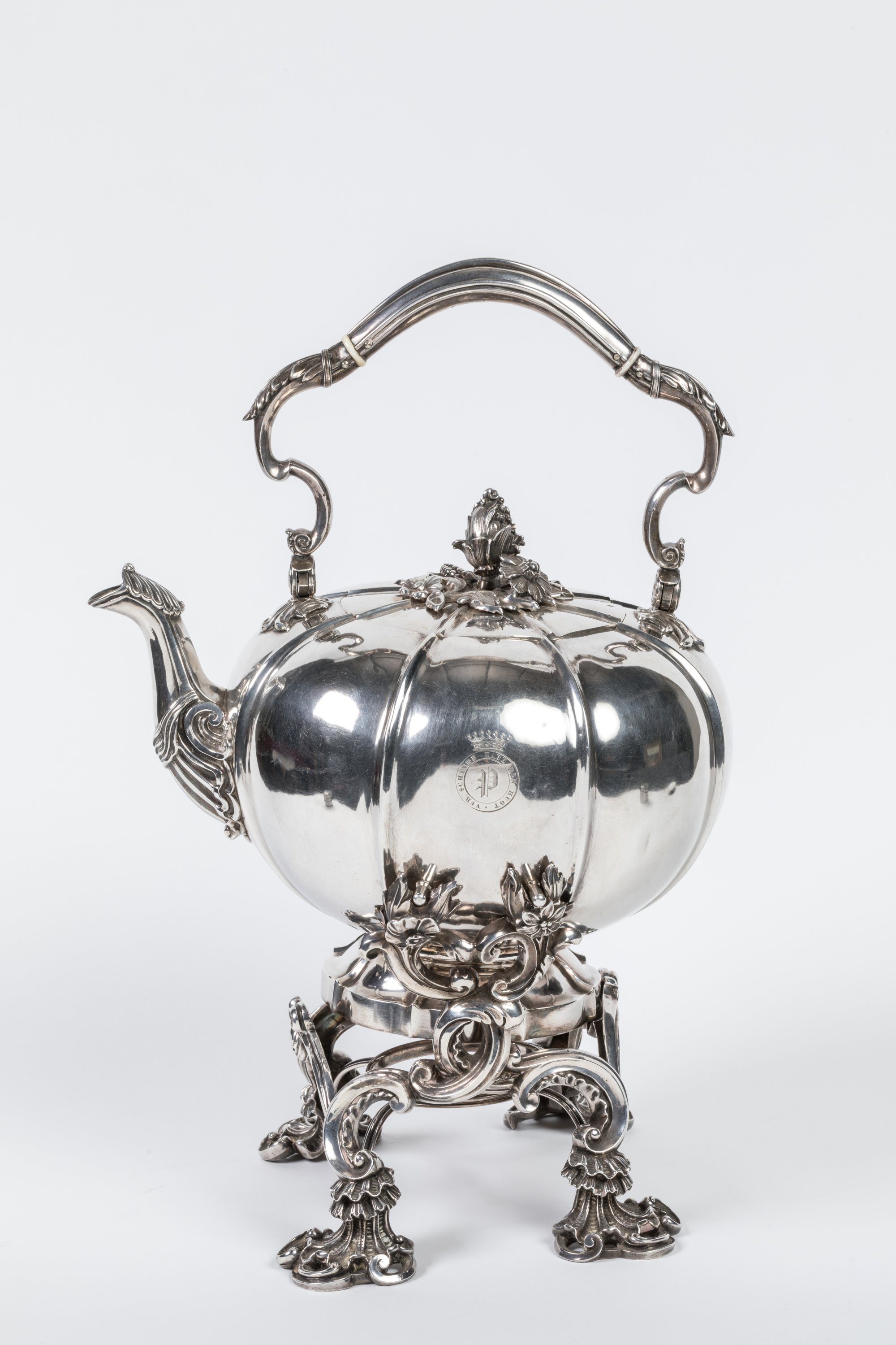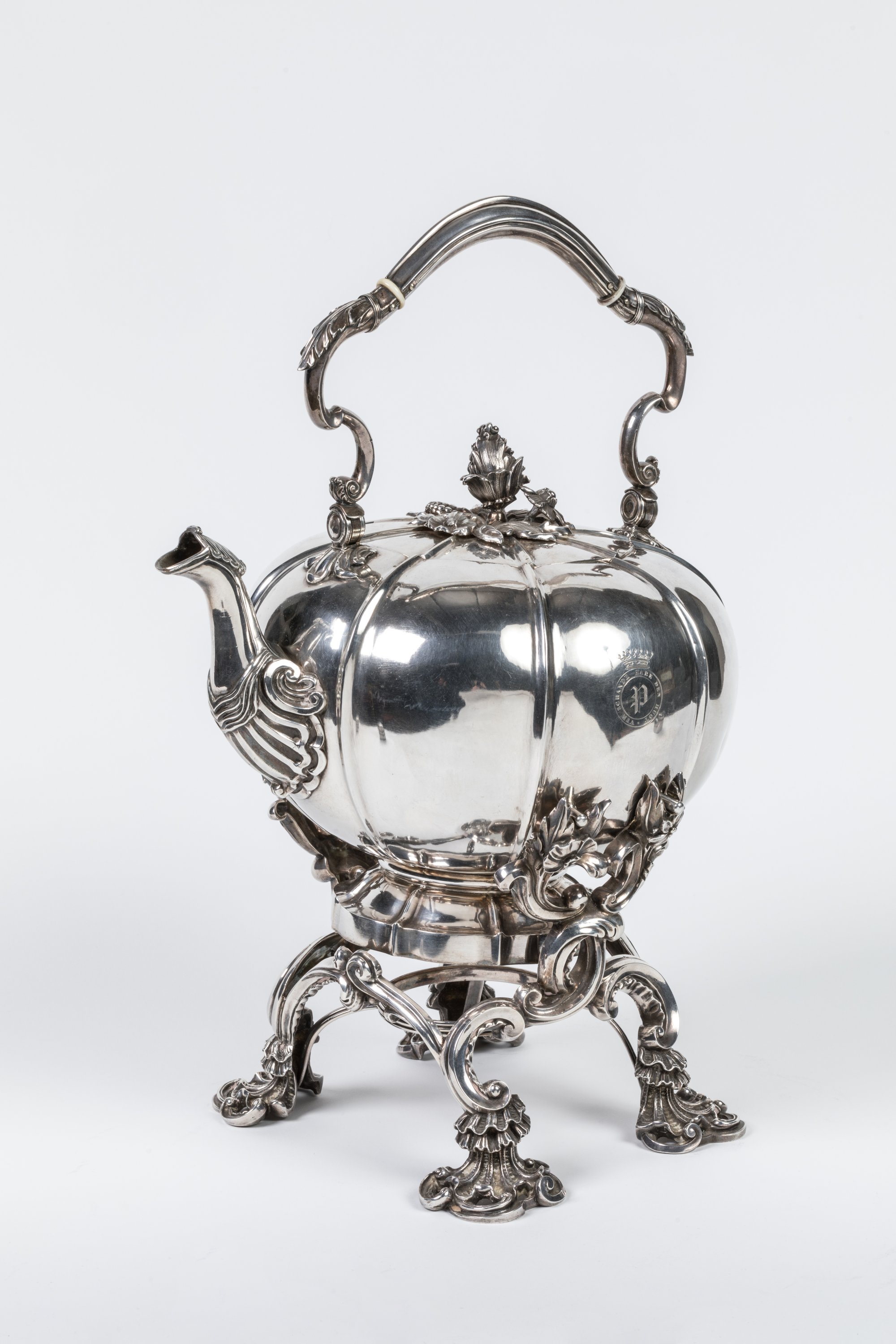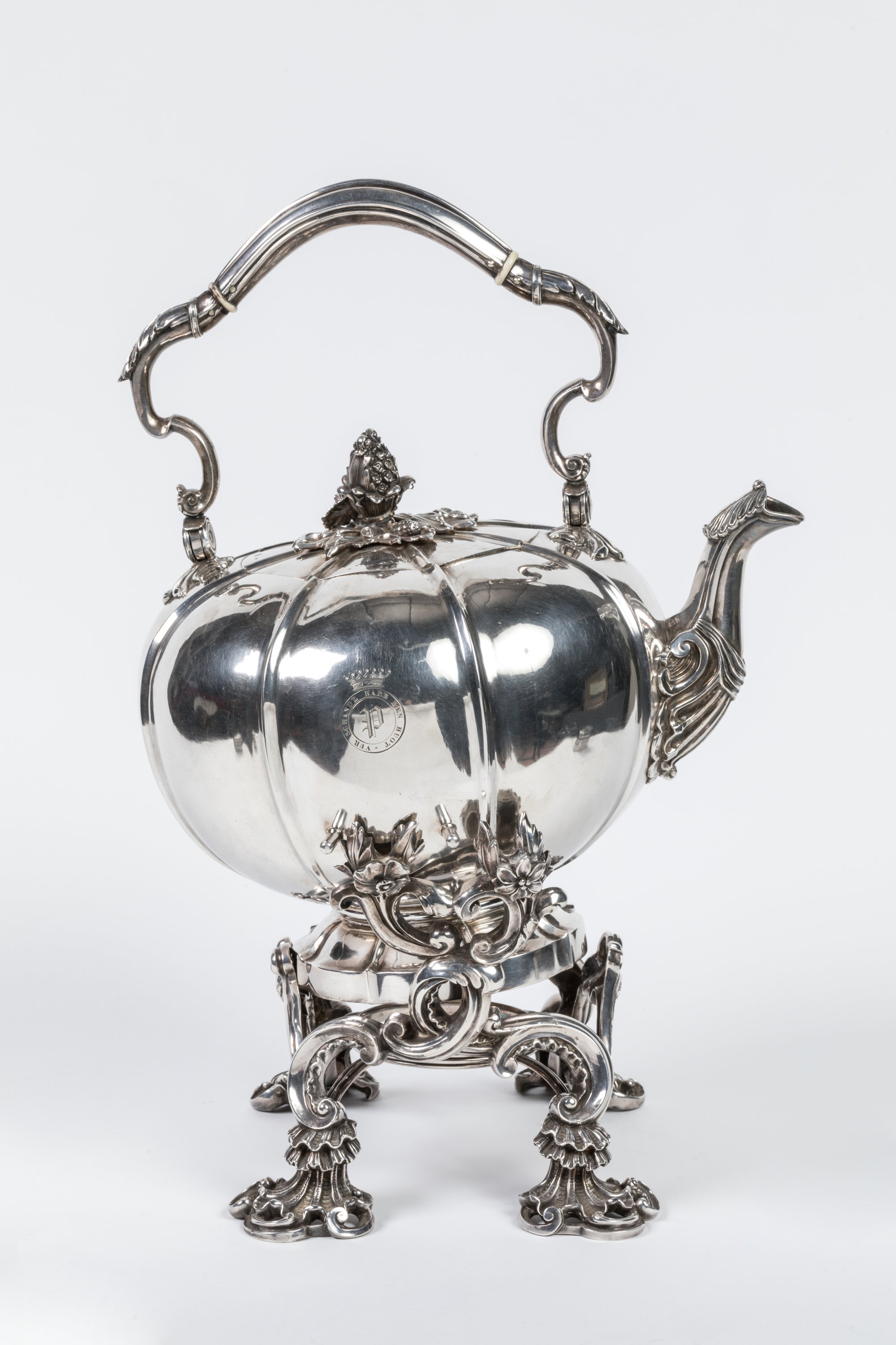 - La bouilloire et son support en argent aux armes de la famille von Pfeffel, avec sa devise "VUR SCHANDE HABE DEN HUOT" ("PRENDS GARDE A LA HONTE"). La prise en grenade éclatée, anses et piétement mouvementés, avec feuilles et coquilles stylisées.