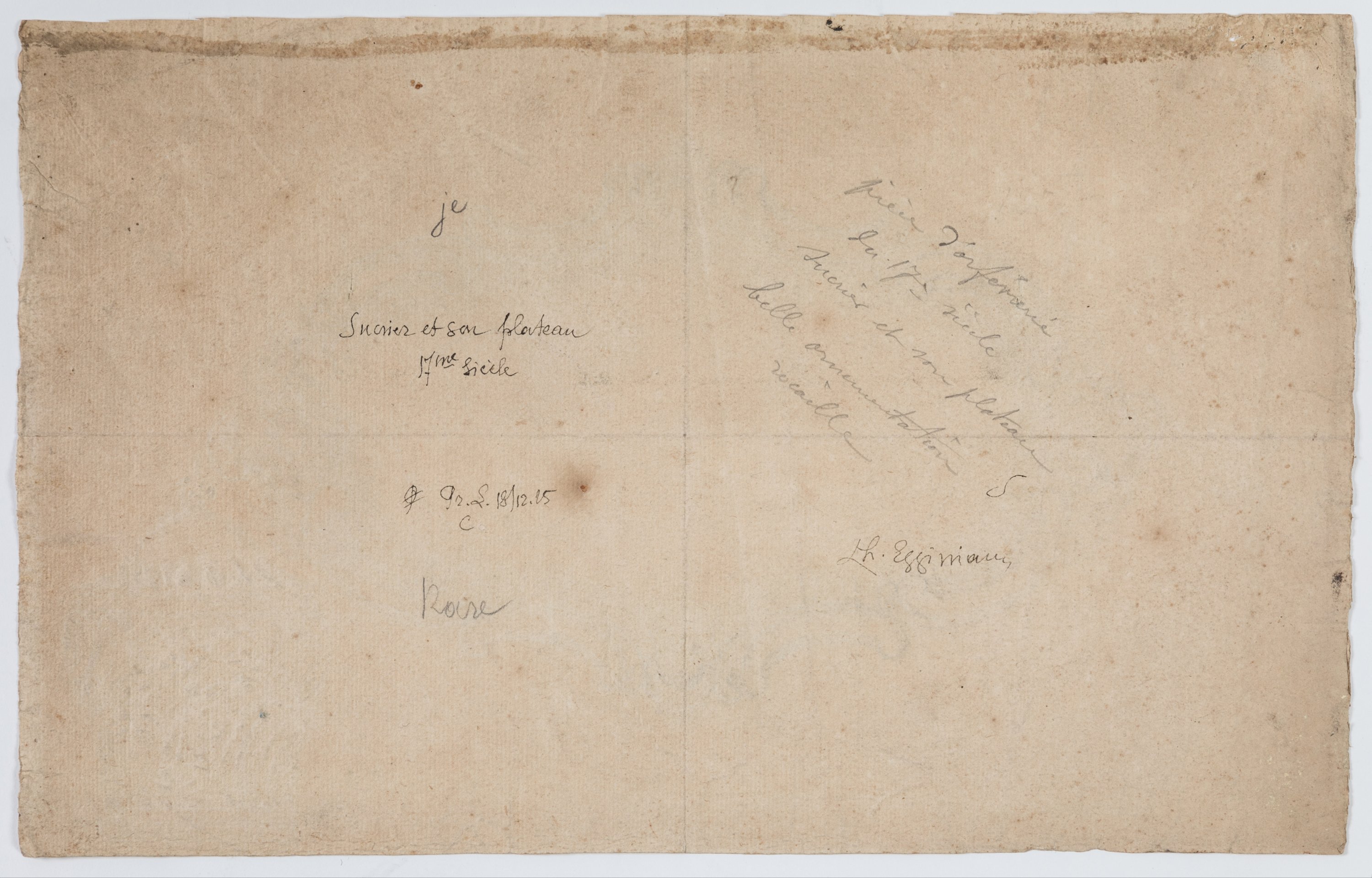 Signé (?) à l’encre en haut à gauche, numéroté au crayon en bas à gauche « C.3650 ». Monogrammé (?) et daté « 18/12/25 » au revers à l’encre, titré, annoté au crayon « pièce d’orfèvrerie du 17ème siècle sucrier et son plateau belle ornementation rocaille ». Signature du collectionneur Charles Eggiman.