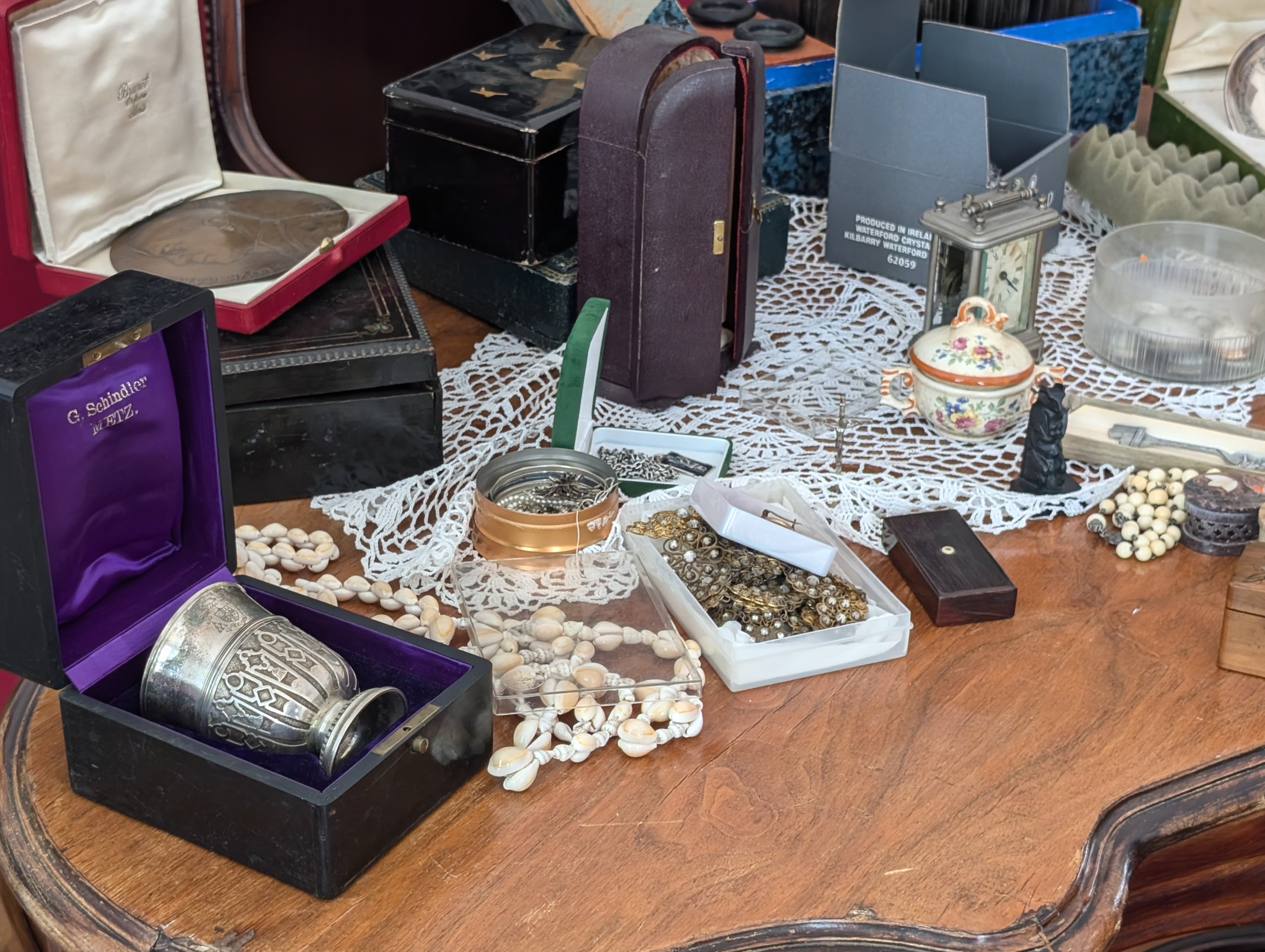 Contenu des greniers de la maison mère de la congrégation des soeurs du Bon Secours: vases d'autel, crucifix, lampes à pétrole, cadres, machine à tuyauter les coiffes, etc.