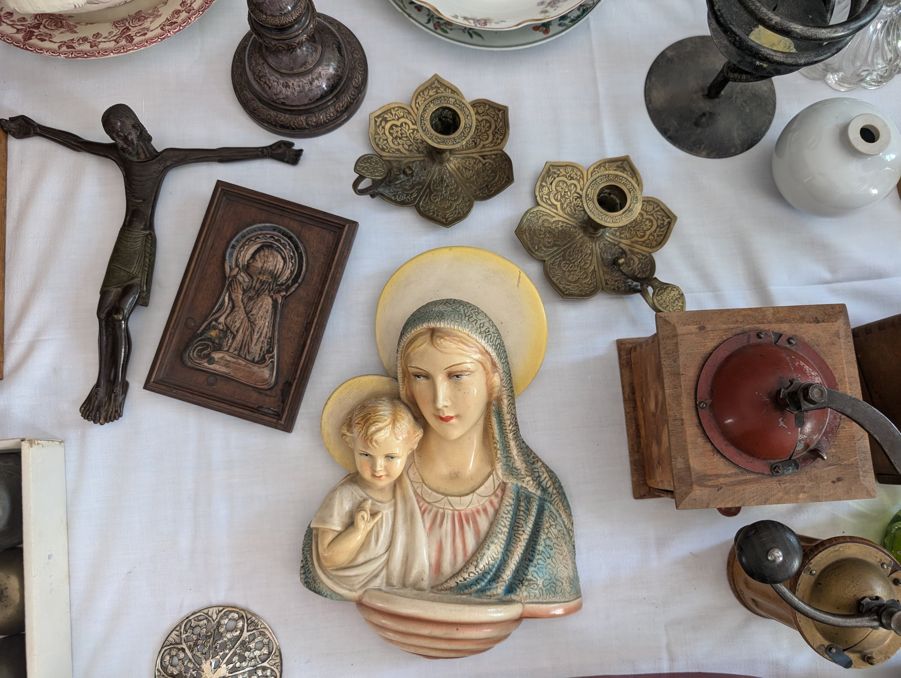 Contenu des greniers de la maison mère de la congrégation des soeurs du Bon Secours: vases d'autel, crucifix, lampes à pétrole, cadres, machine à tuyauter les coiffes, etc.