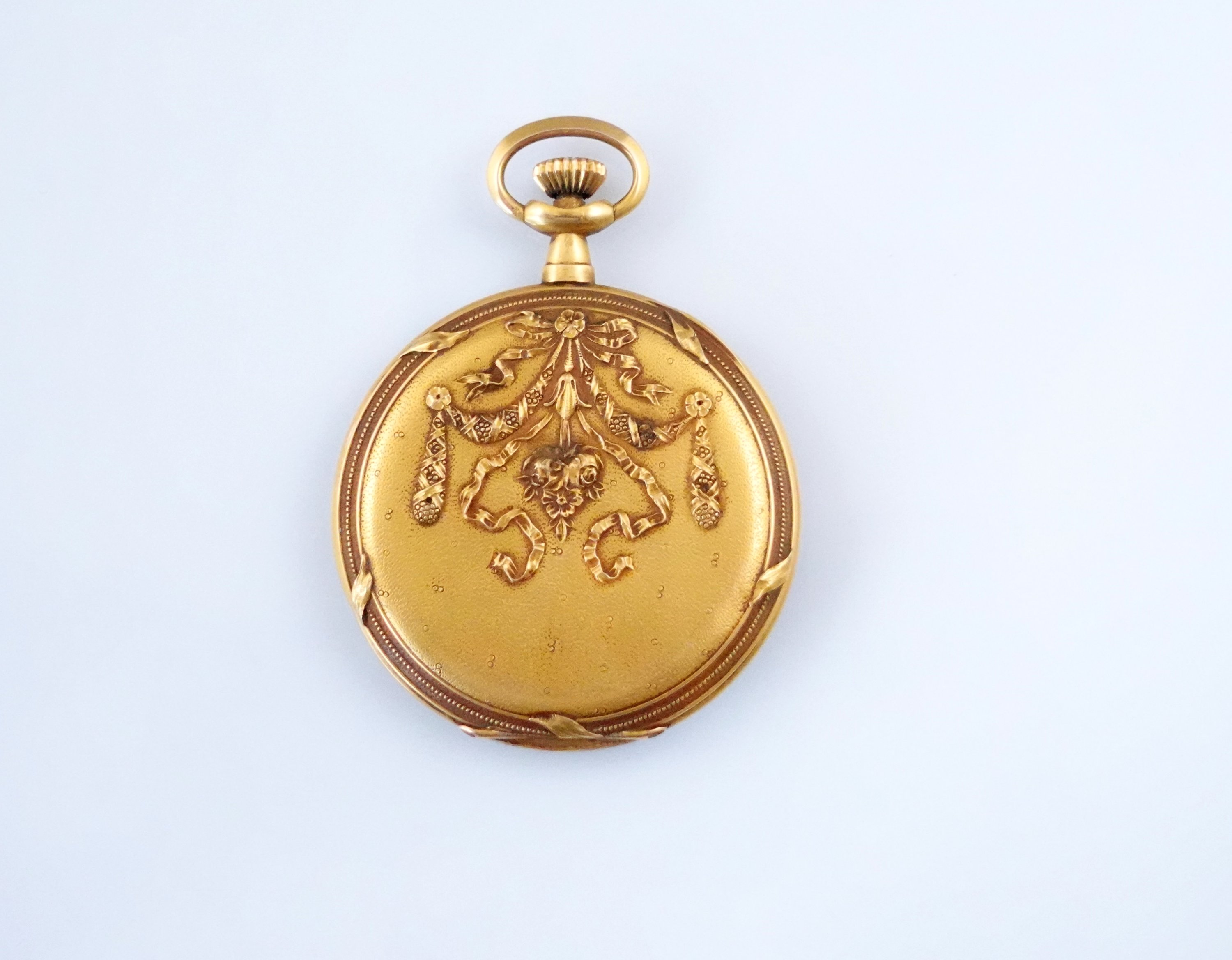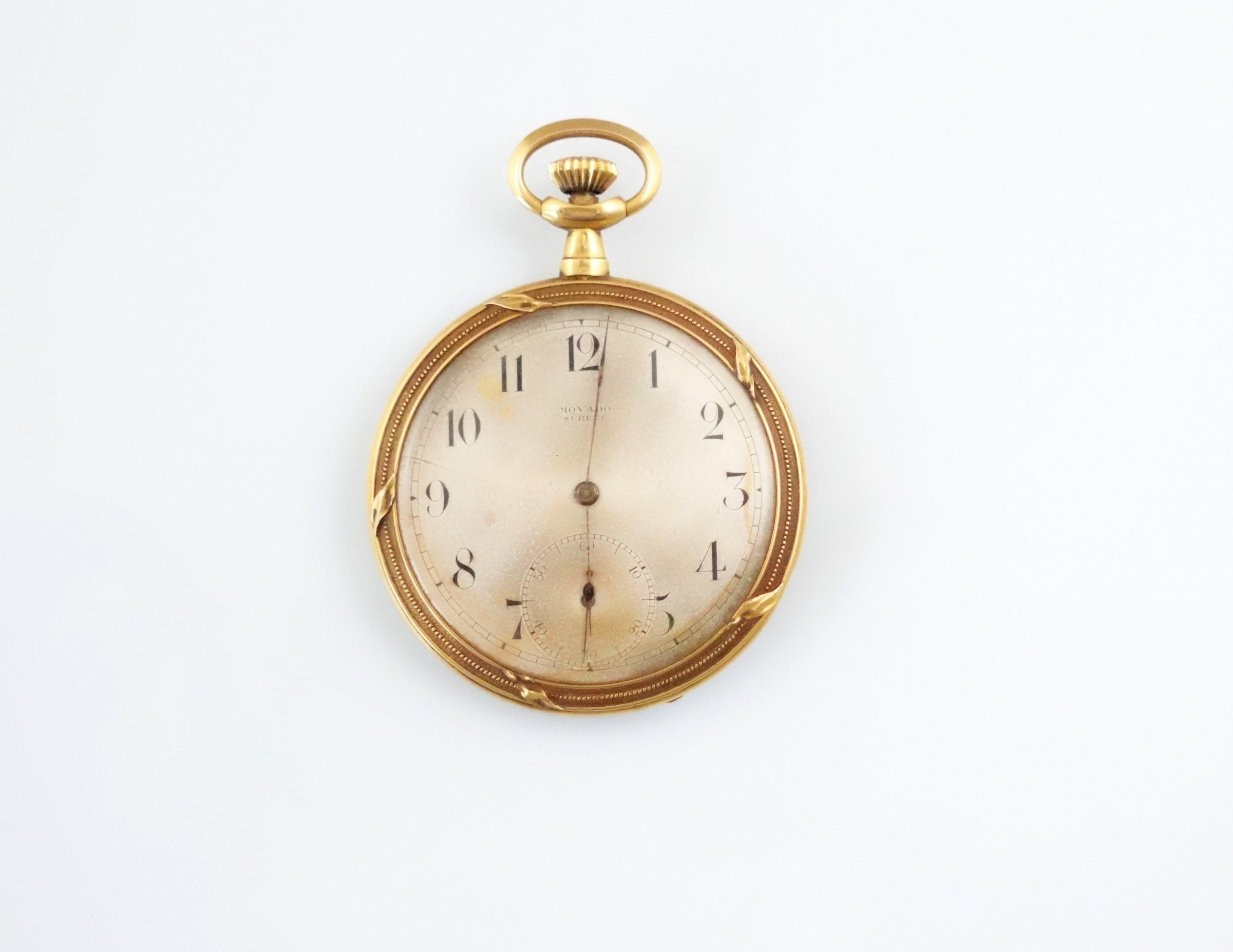 en or jaune 750 millièmes. Cadran signé "Movado sureté" indiquant les heures en chiffres arabes. Petite trotteuse à 6 heures. Le cache poussière intérieur en or jaune 750 millièmes marqué "Grand diplome d'honneur / fabrique Movado / Expositions universelles Paris 1900 Liège 1905". Numérotée 708351".