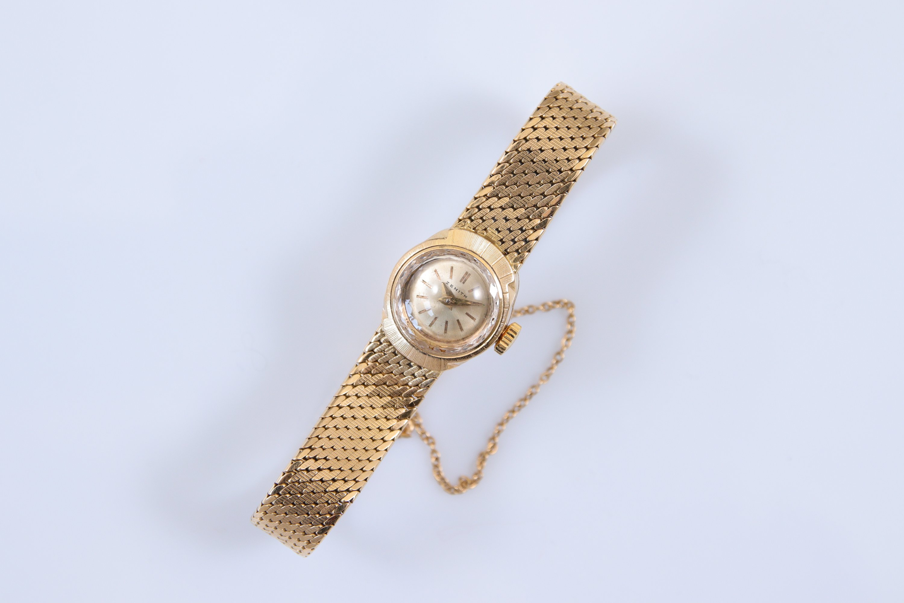 en or jaune 750 millièmes. Cadran champagne à index bâtonnets. Bracelet articulé avec boucle déployante et chaînette de sécurité.