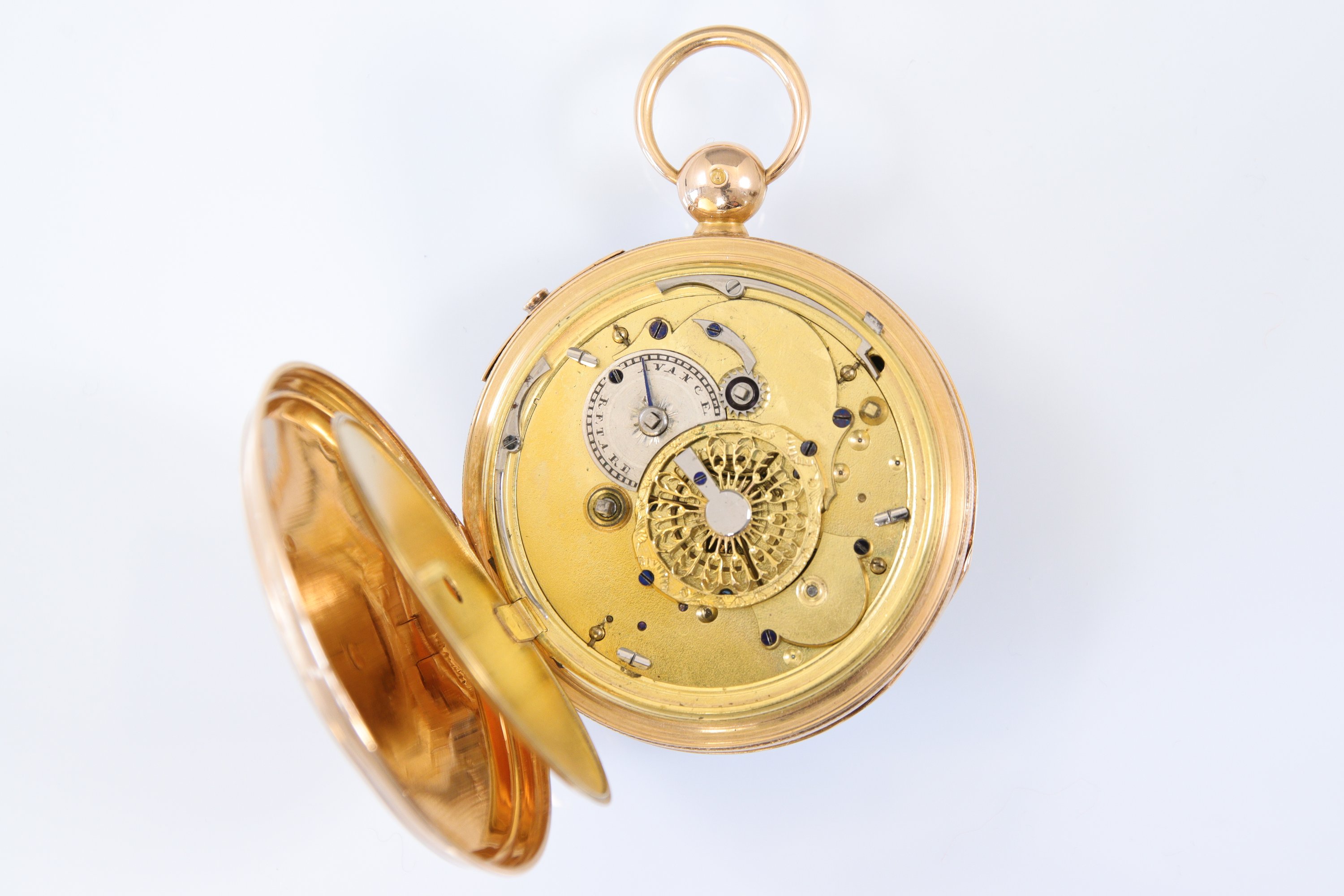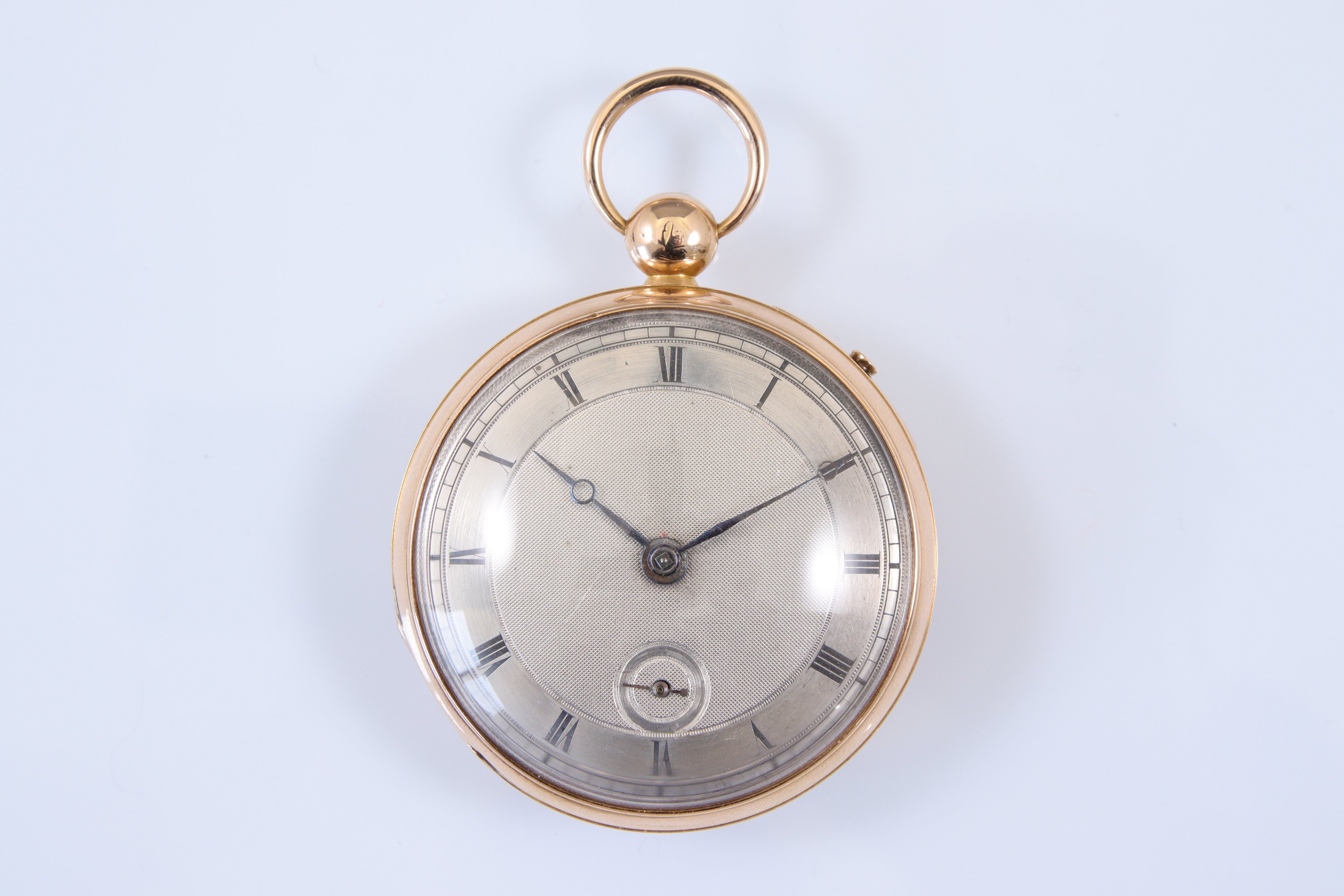 en or jaune 750 millièmes. Le cadran à fond guilloché indiquant les heures en chiffres romains. Petite trotteuse à 6 heures. Cache-poussière en métal. Bélière.
