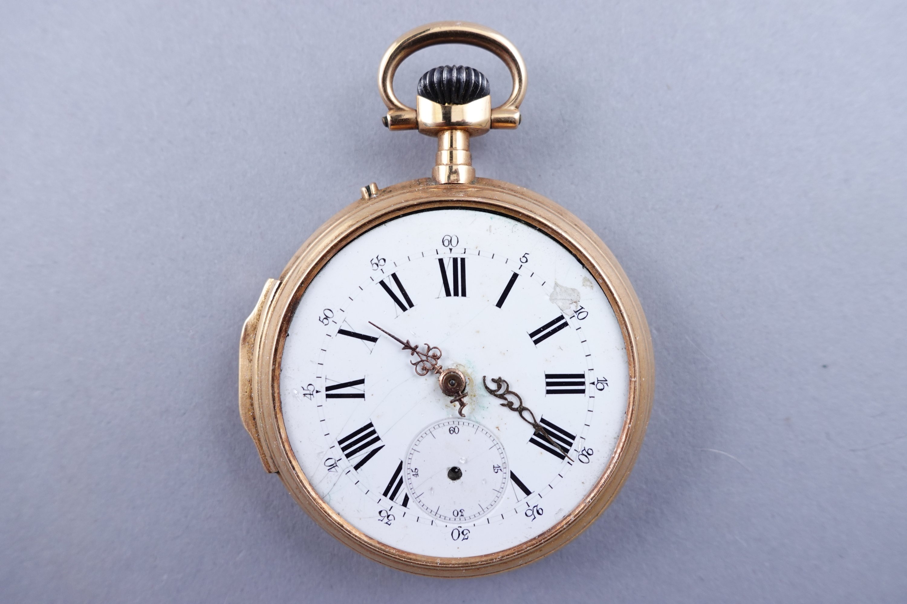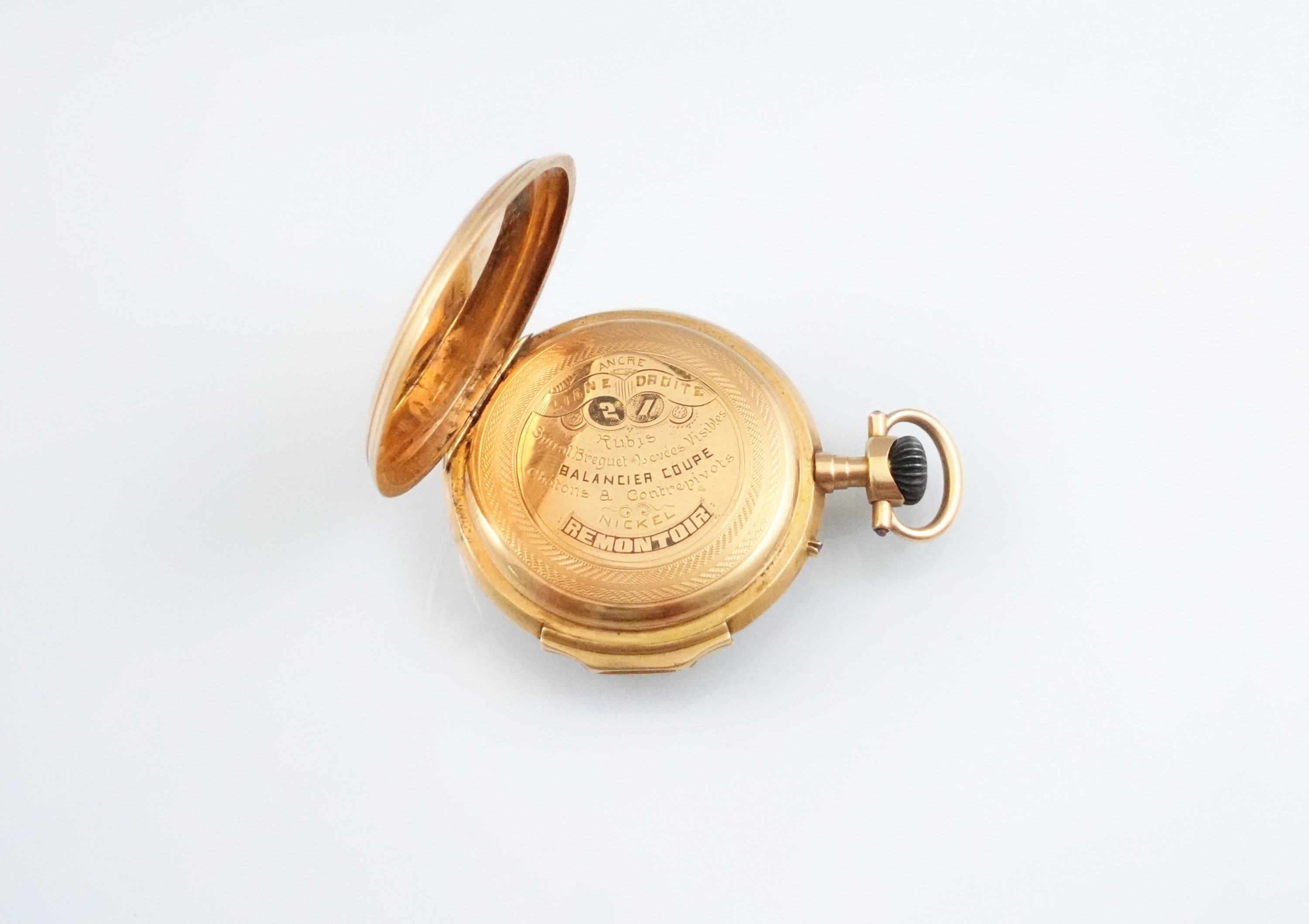 en or jaune 750 millièmes. Le cadran émaillé blanc indiquant les heures en chiffres romains. Le revers à décor d'un cuir. Cache-poussière intérieur en or jaune 750 millièmes marqué "Ancre / ligne droite / 21 rubis / spiral Breguet levées visibles / balancier coupe / chatons à contrepivots / Nickel / remontoir".