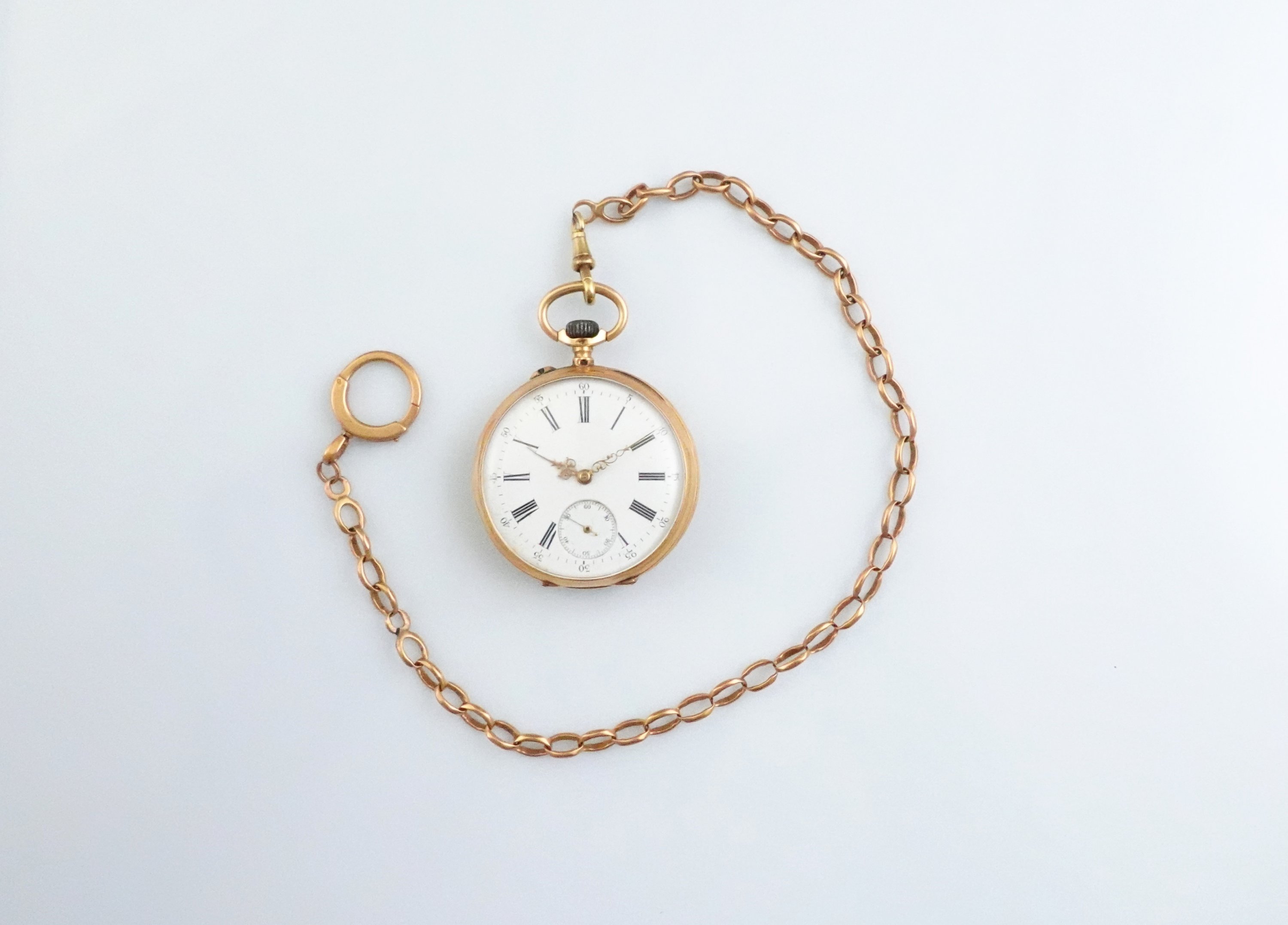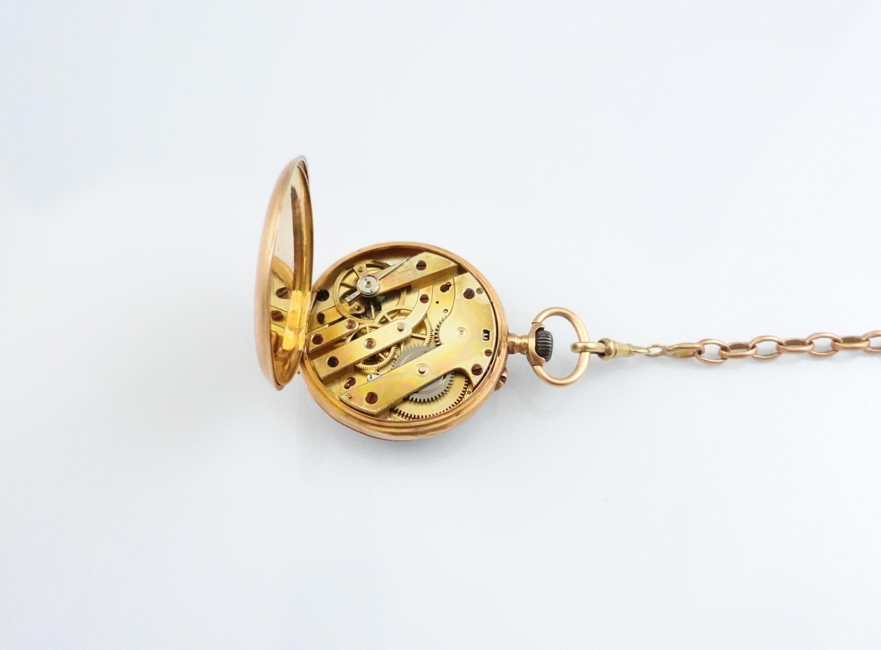 en or jaune 750 millièmes. Cadran émaillé blanc avec les heures en chiffres romains. Petite trotteuse à 6 heures. Remontoir à midi. Le cache-poussière en or signé "Leroux au Mans".