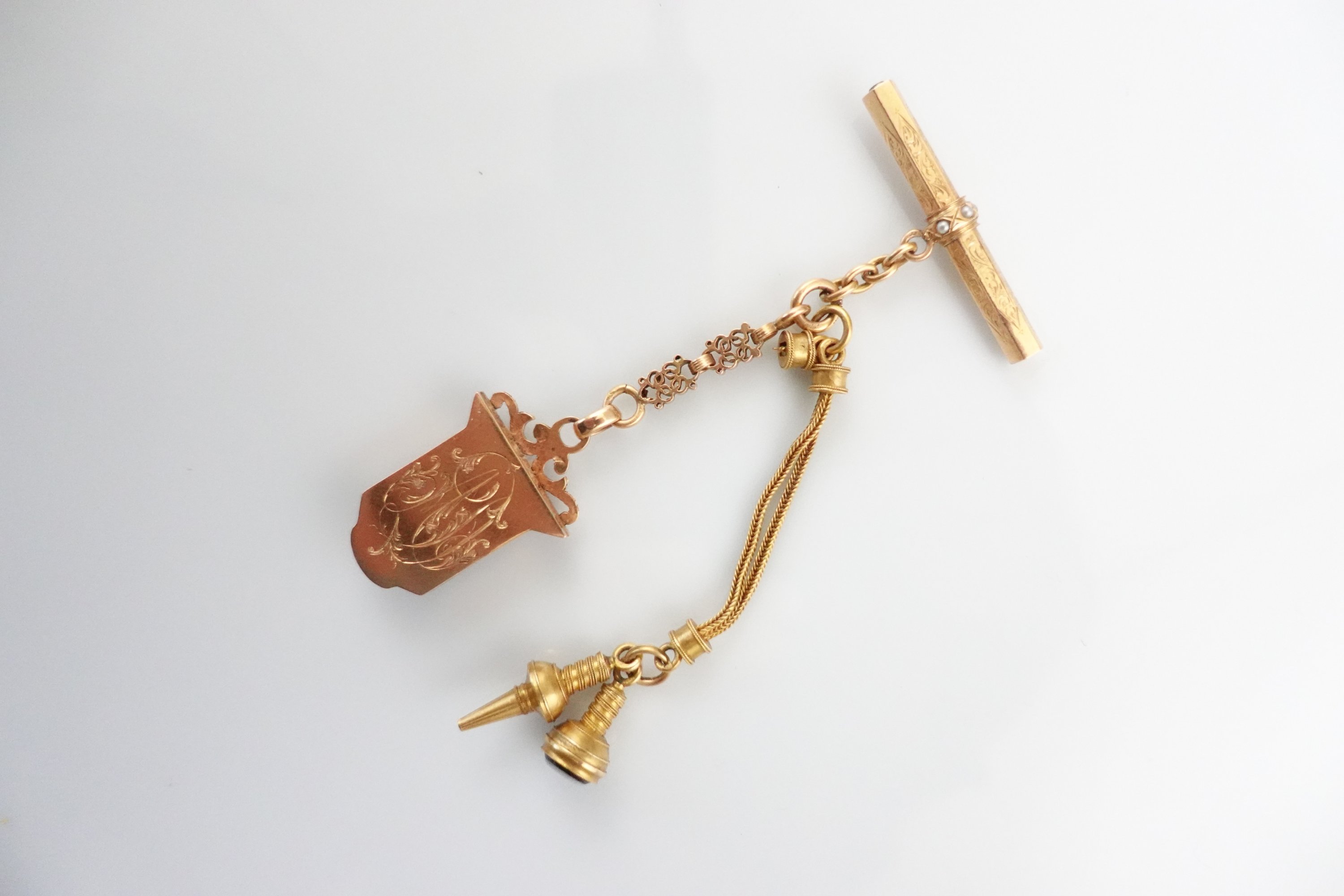 en or jaune 750 millièmes composée d'un porte-photo aux petites perles monogrammé "AD" et son verre, un stylet et une chaîne.