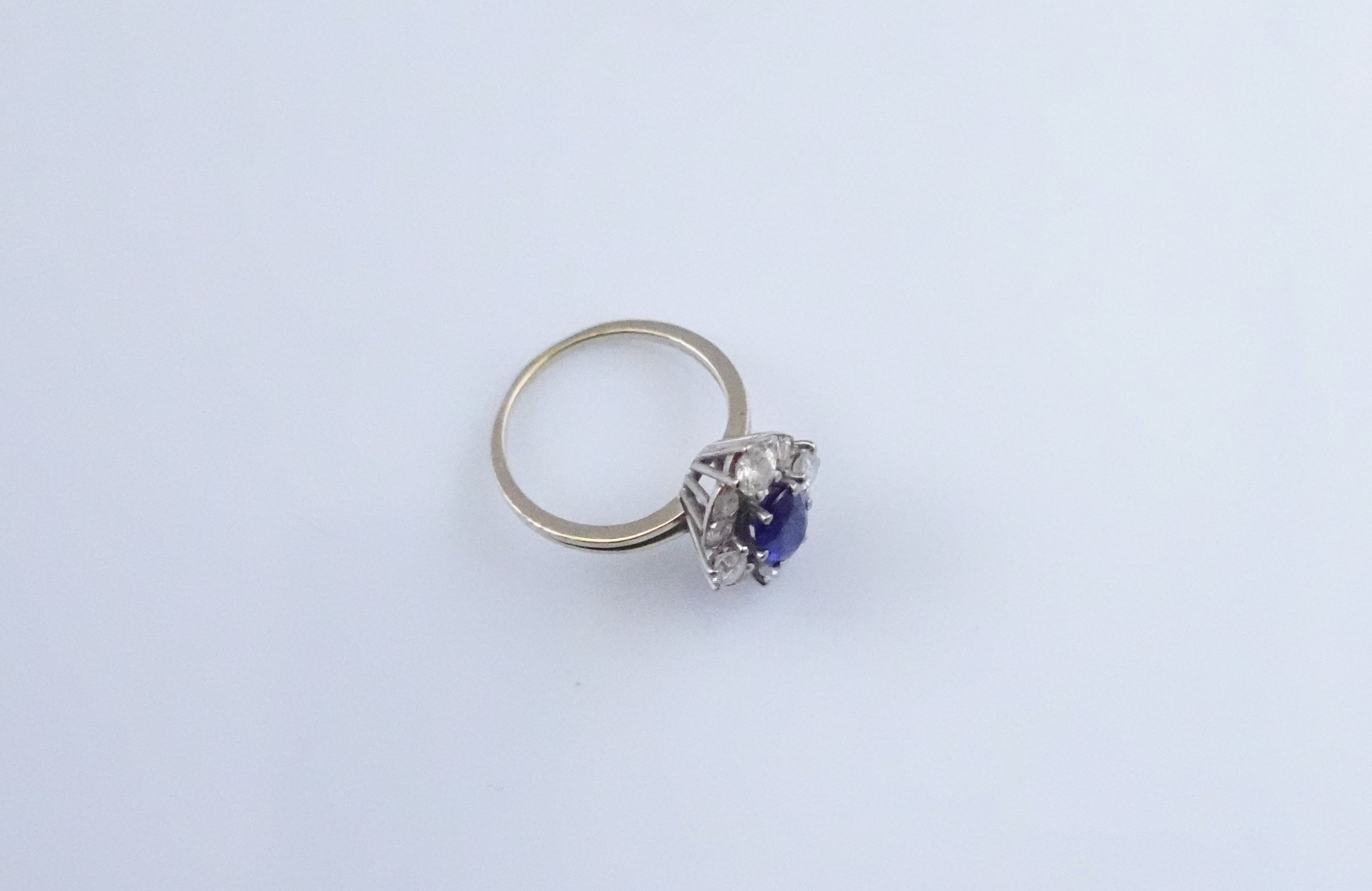 en or gris 750 millièmes, de forme oblongue, enchâssant un saphir entouré de 4 diamants principaux et 8 plus petits.