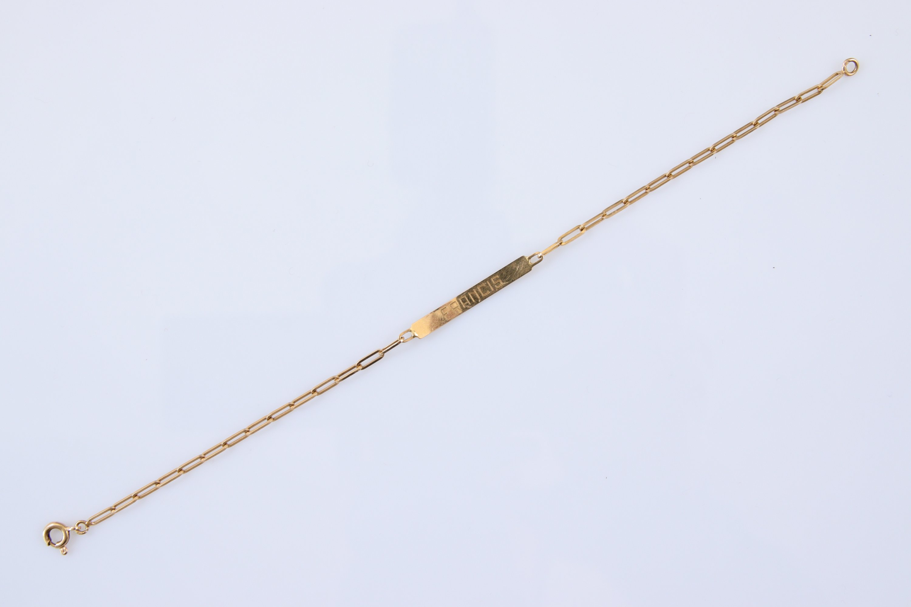 en or jaune 750 millièmes, une plaque gravée "Laurence" d'un côté et "Francis" de l'autre.