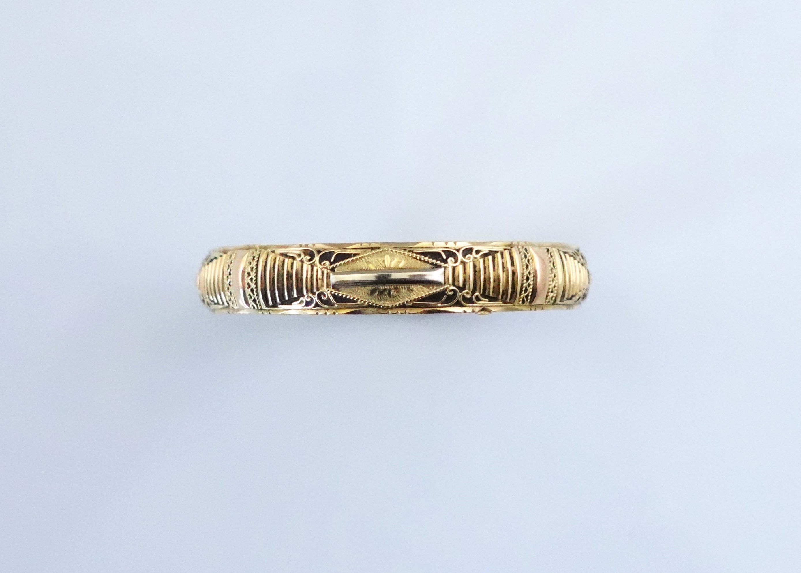 en or 750 millièmes plusieurs tons jaune, rose et gris à décor gravé de losanges et enroulements. Le fond niellé.