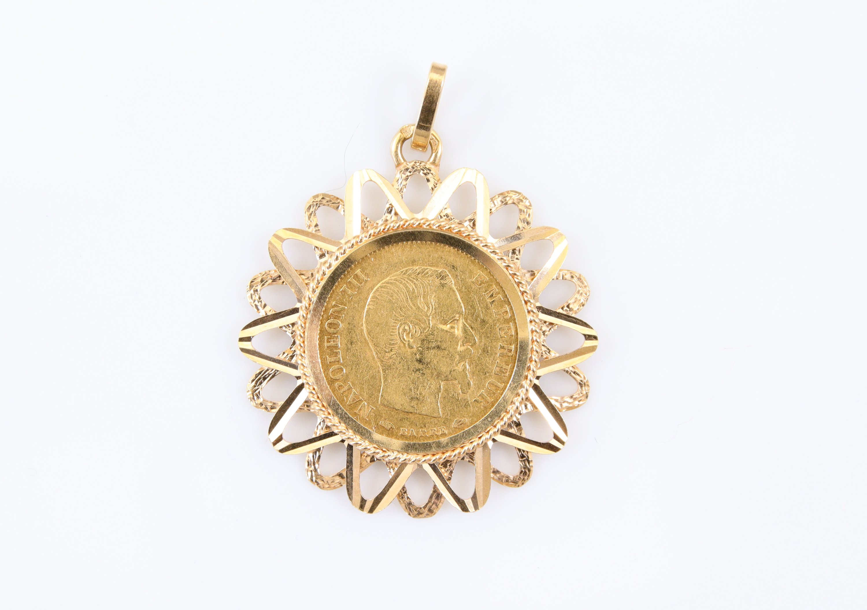 en or jaune 750 millièmes sertie d'une pièce de 10 francs or Napoléon III tête nue, 1857.