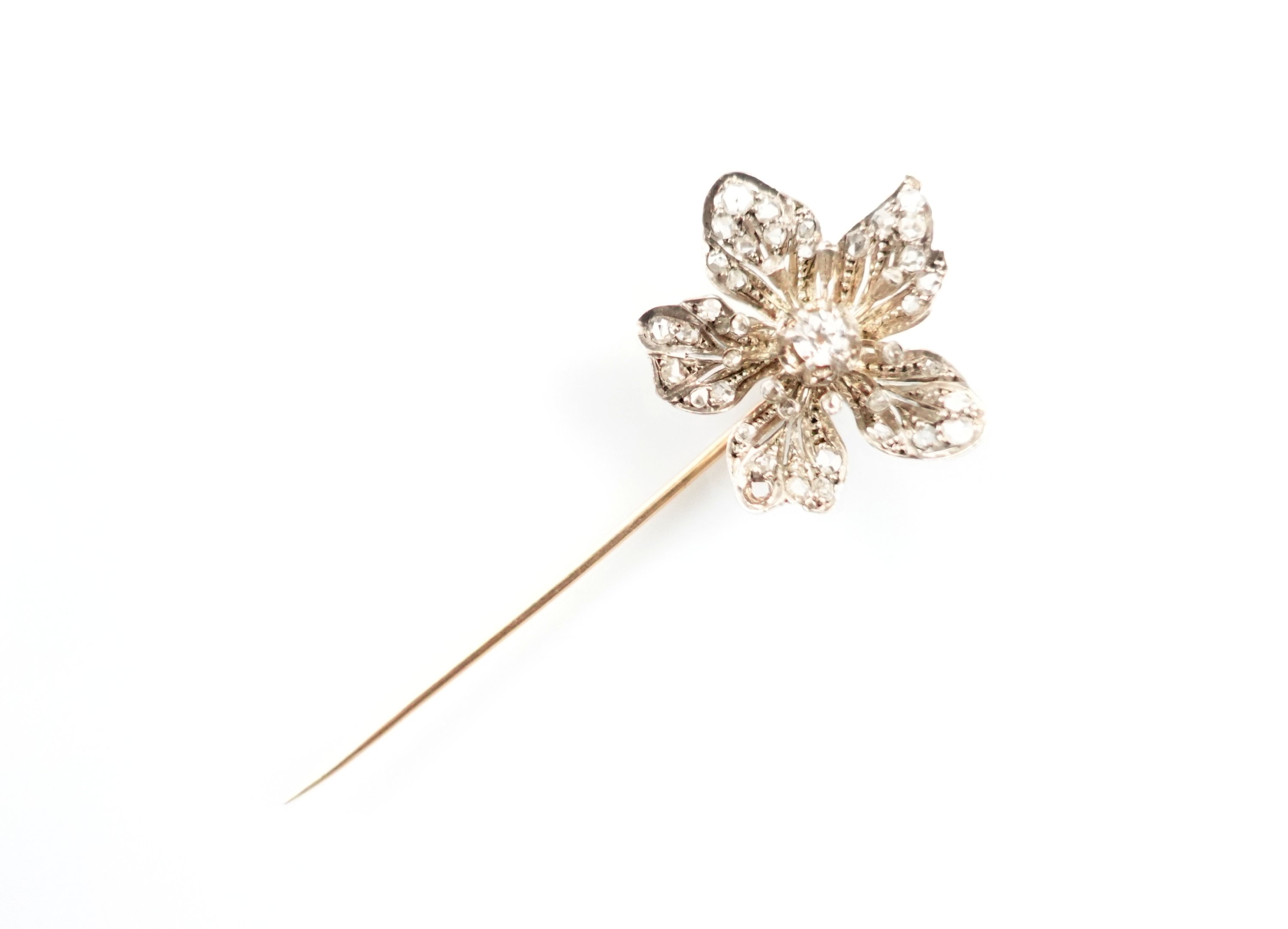 en or jaune 750 millièmes et argent sertie d'une pierre blanche centrale de taille ancienne et dix pistils à diamants taillés en rose. Les pétales sertis de diamants.