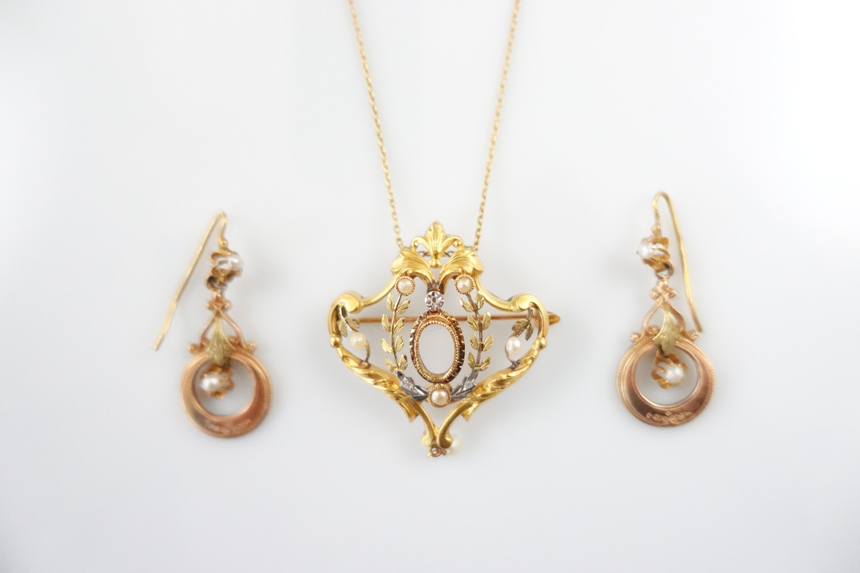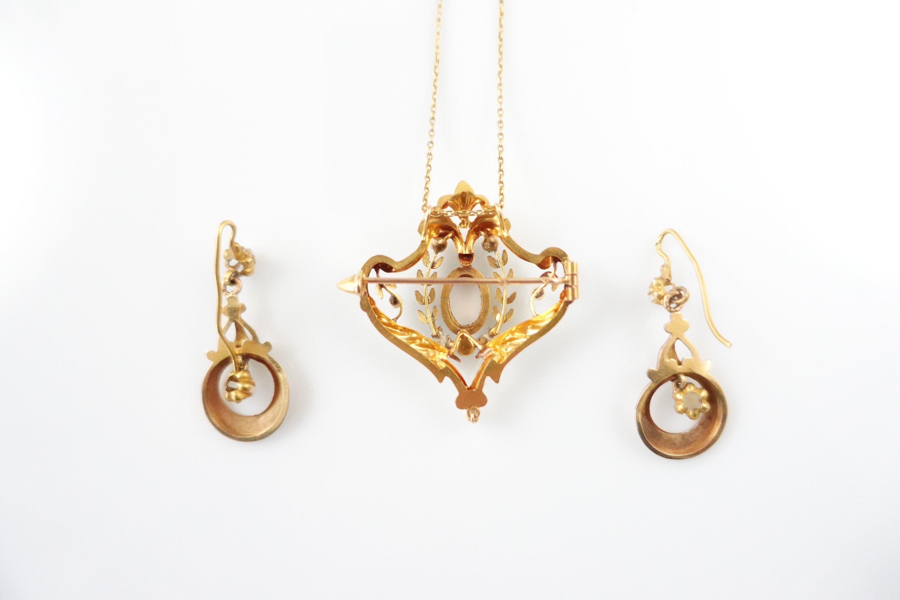 Ensemble d'une paire de boucles d'oreilles et broche-pendentif et sa chaîne formant parure