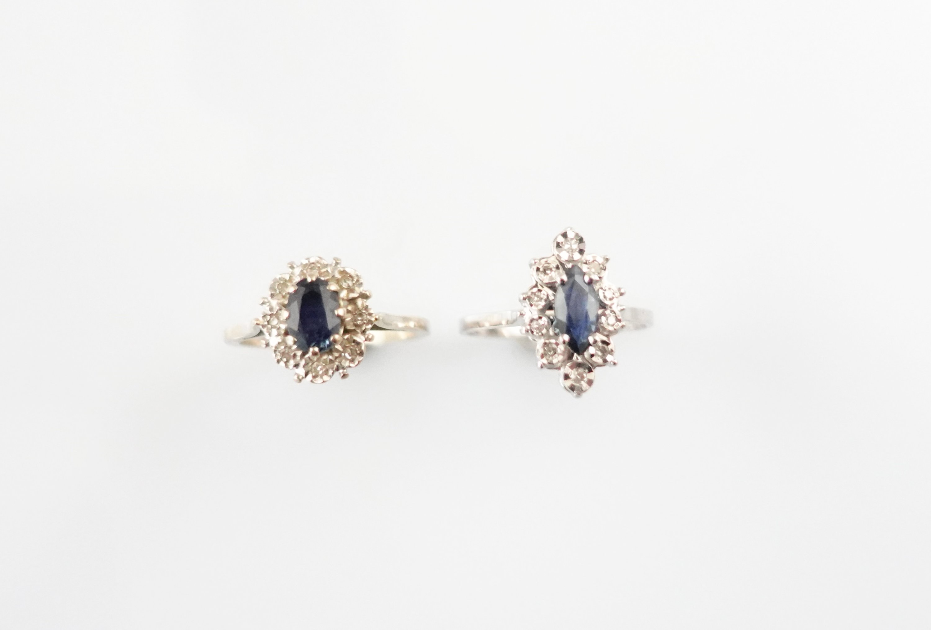 en or gris 750 millièmes, serties de pierres bleues dans un entourage de brillants.