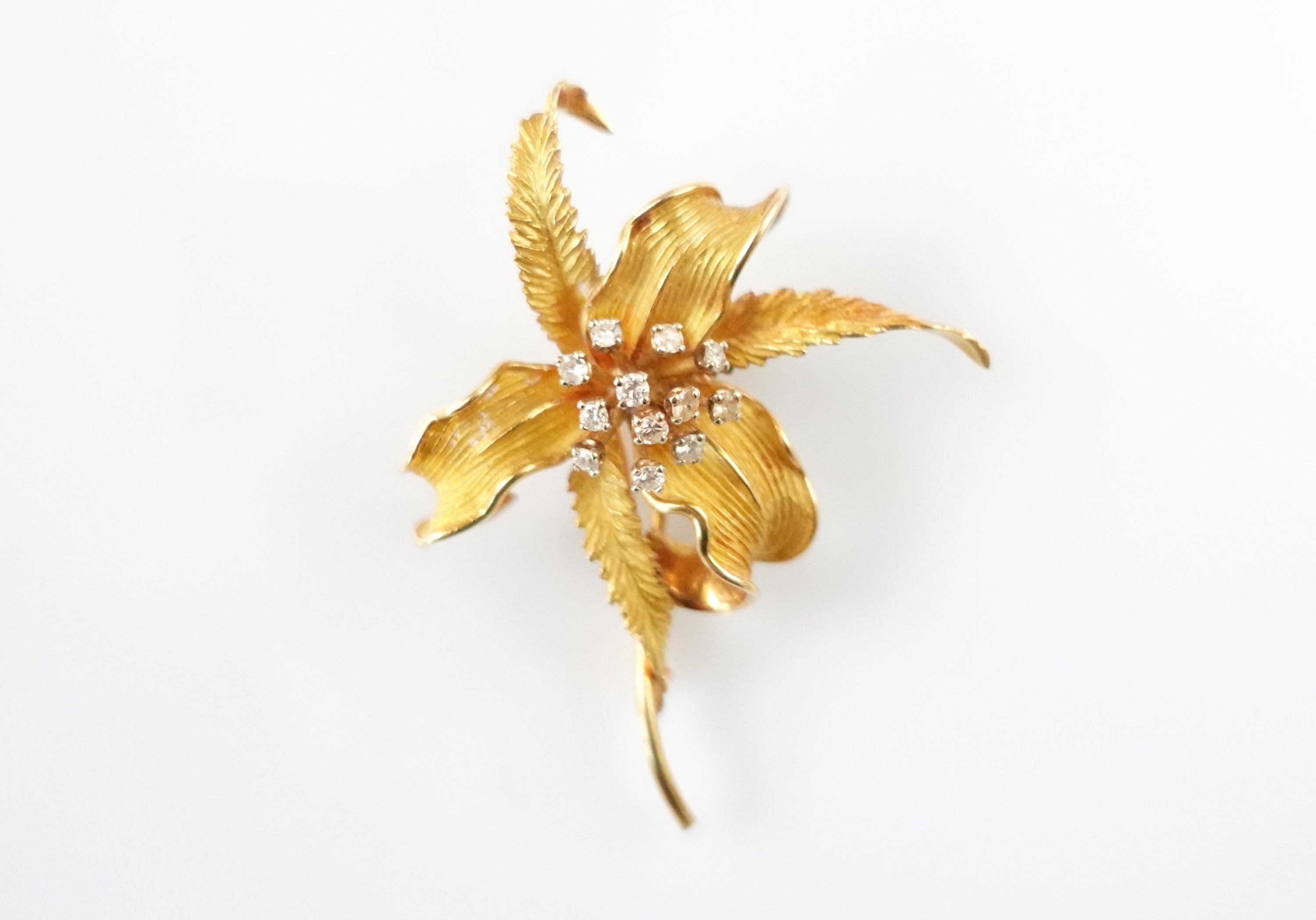 en or jaune 750 millièmes à décor de six feuilles entourant 8 brillants et 4 pierres blanches en serti griffe.