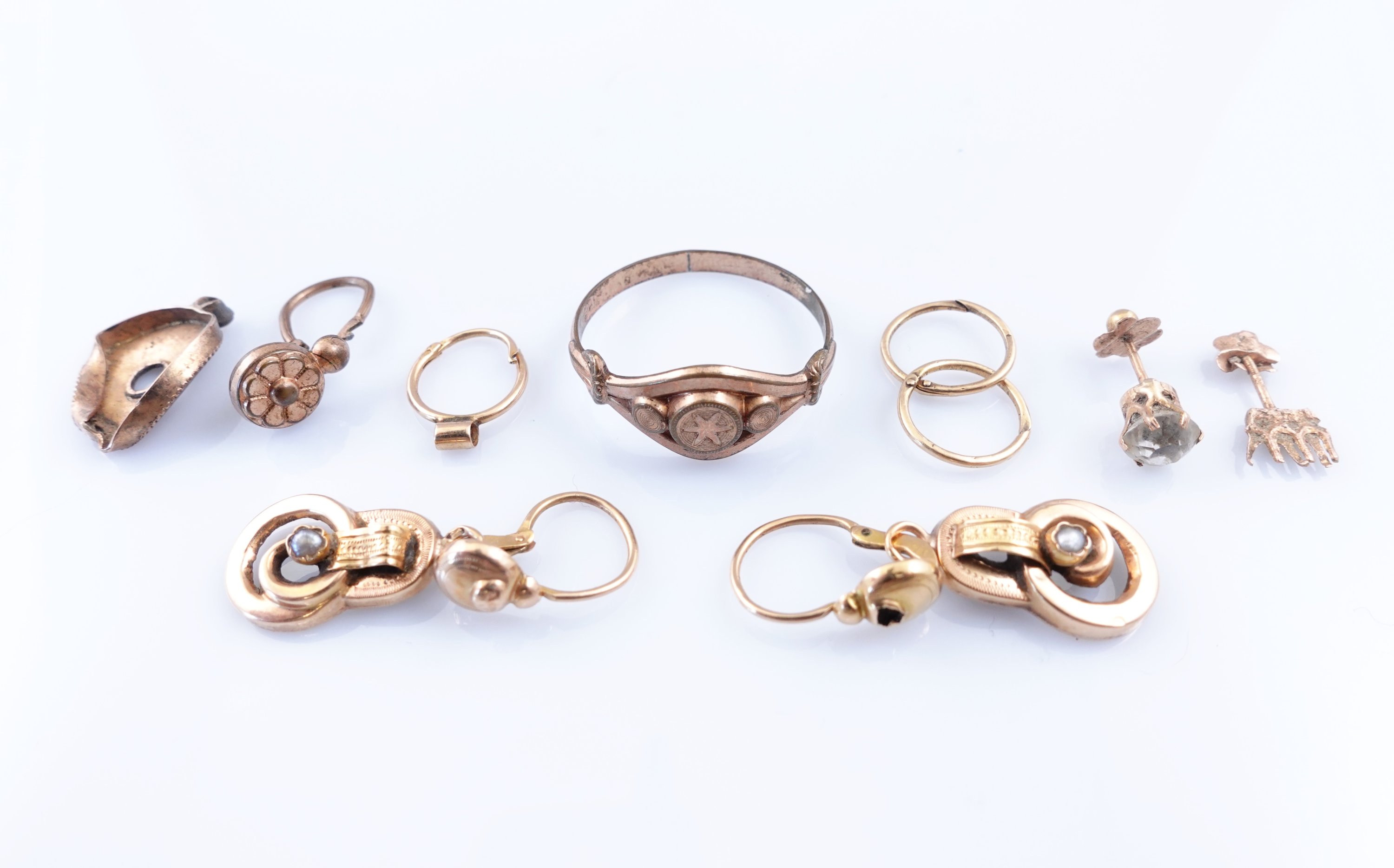 - Débris d'or comprenant trois anneaux d'oreilles, une boucle d'oreille, une partie de pendentif, deux clous d'oreilles dont un écrasé. Poids brut: 2,4 g.