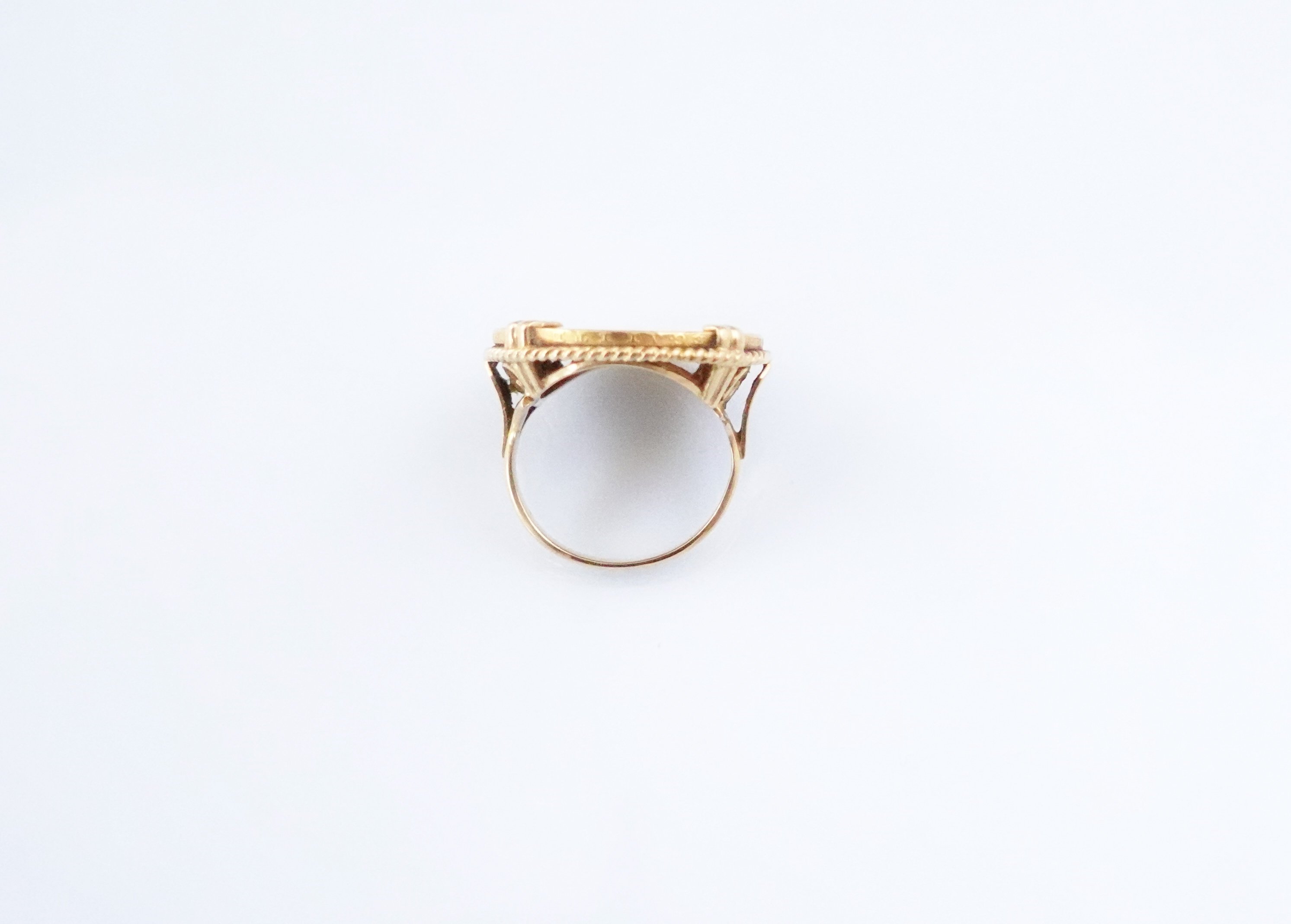 en or jaune dans une monture ajourée, elle est sertie d'une pièce de 20 francs or "au coq" de 1912.